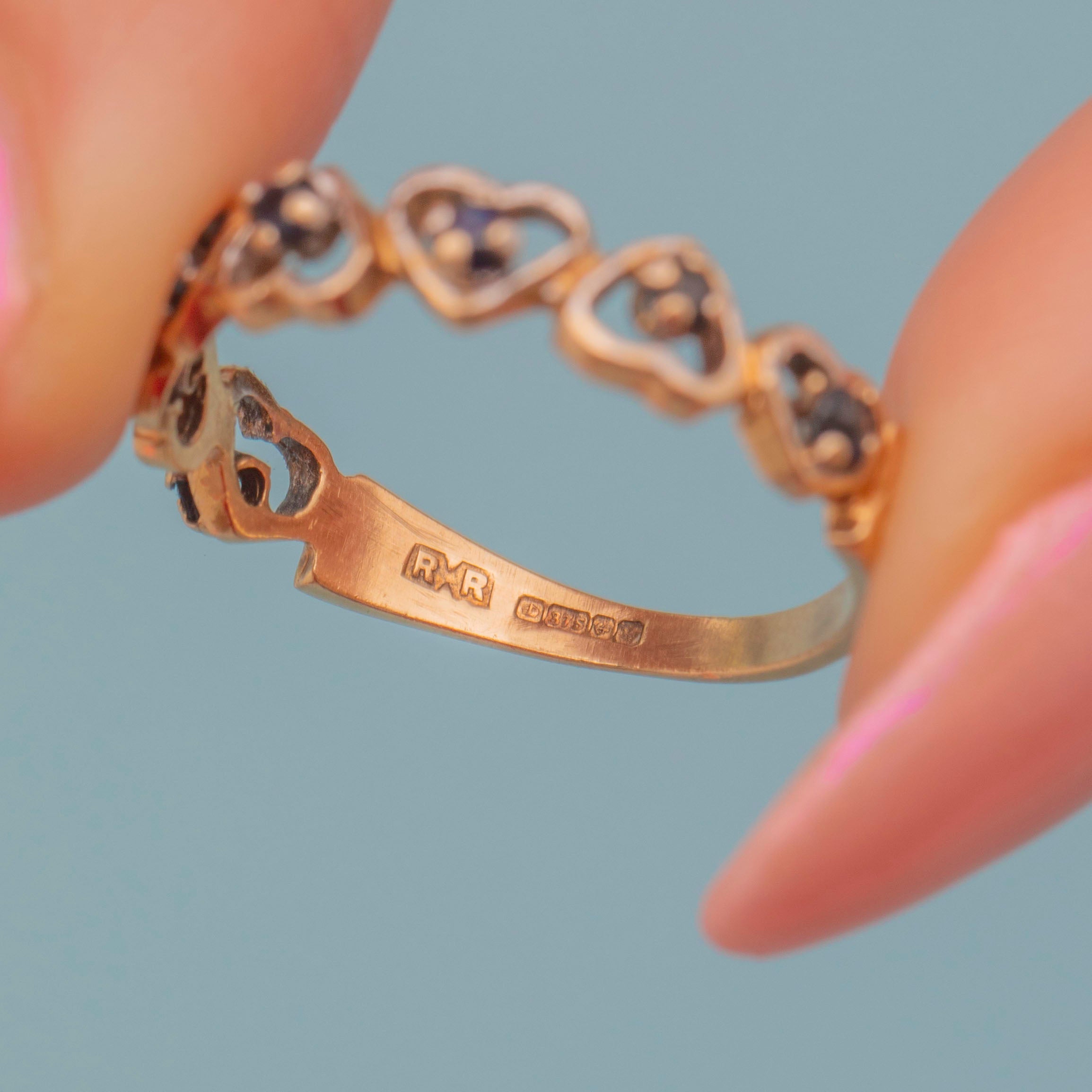 EXCELLENT. This 9ct Gold Sapphire heart half-eternity ring is in excellent condition. The Sapphires are secure, and the heart shapes have kept perfectly well. The inside of the band has a full set of hallmarks for the year 1959.