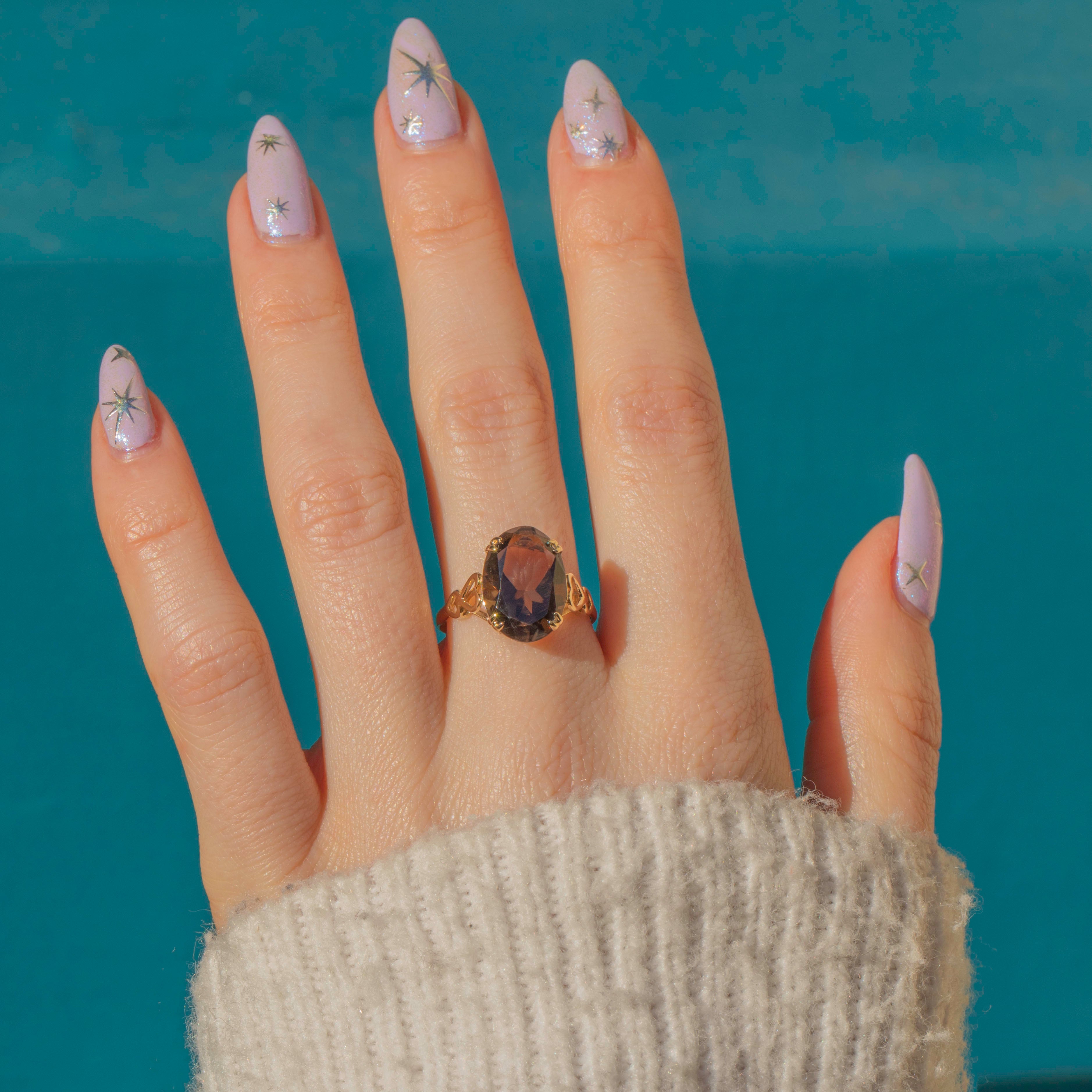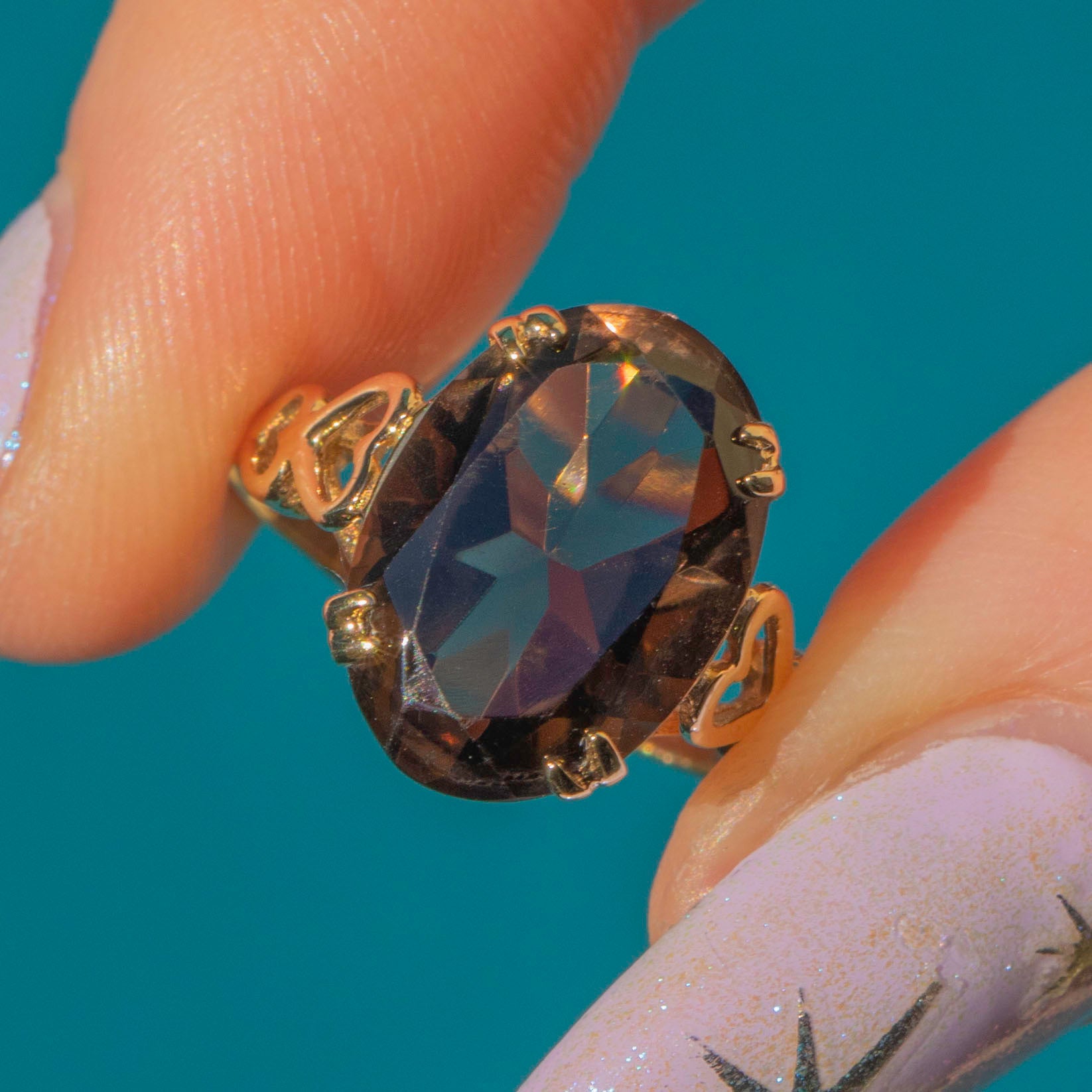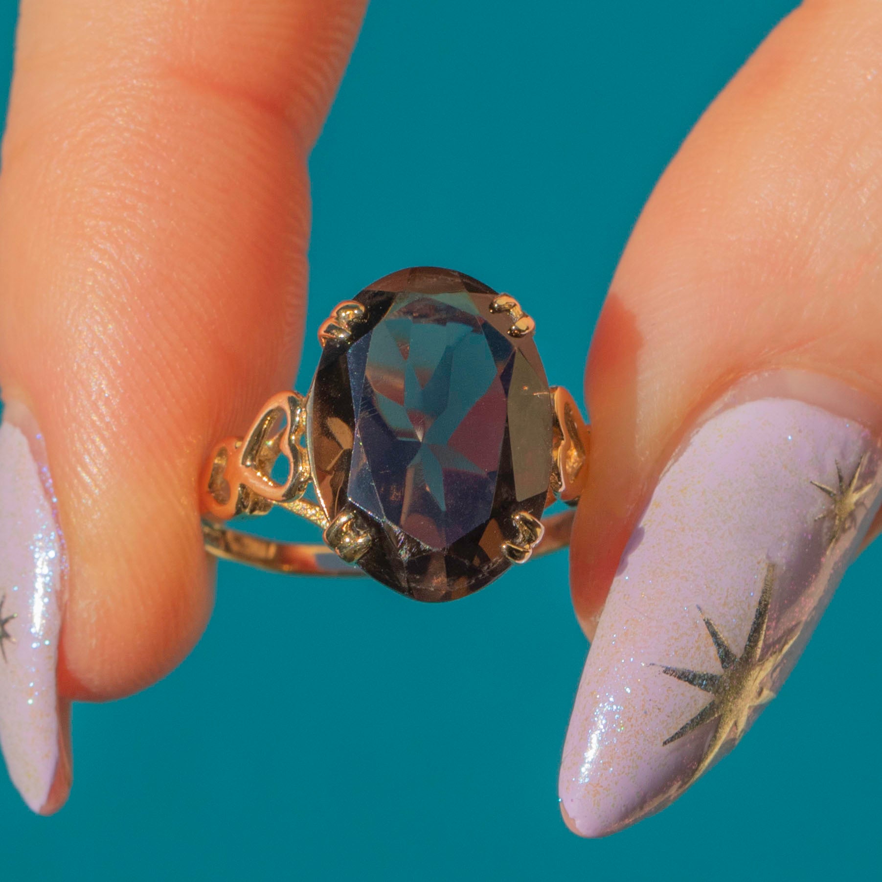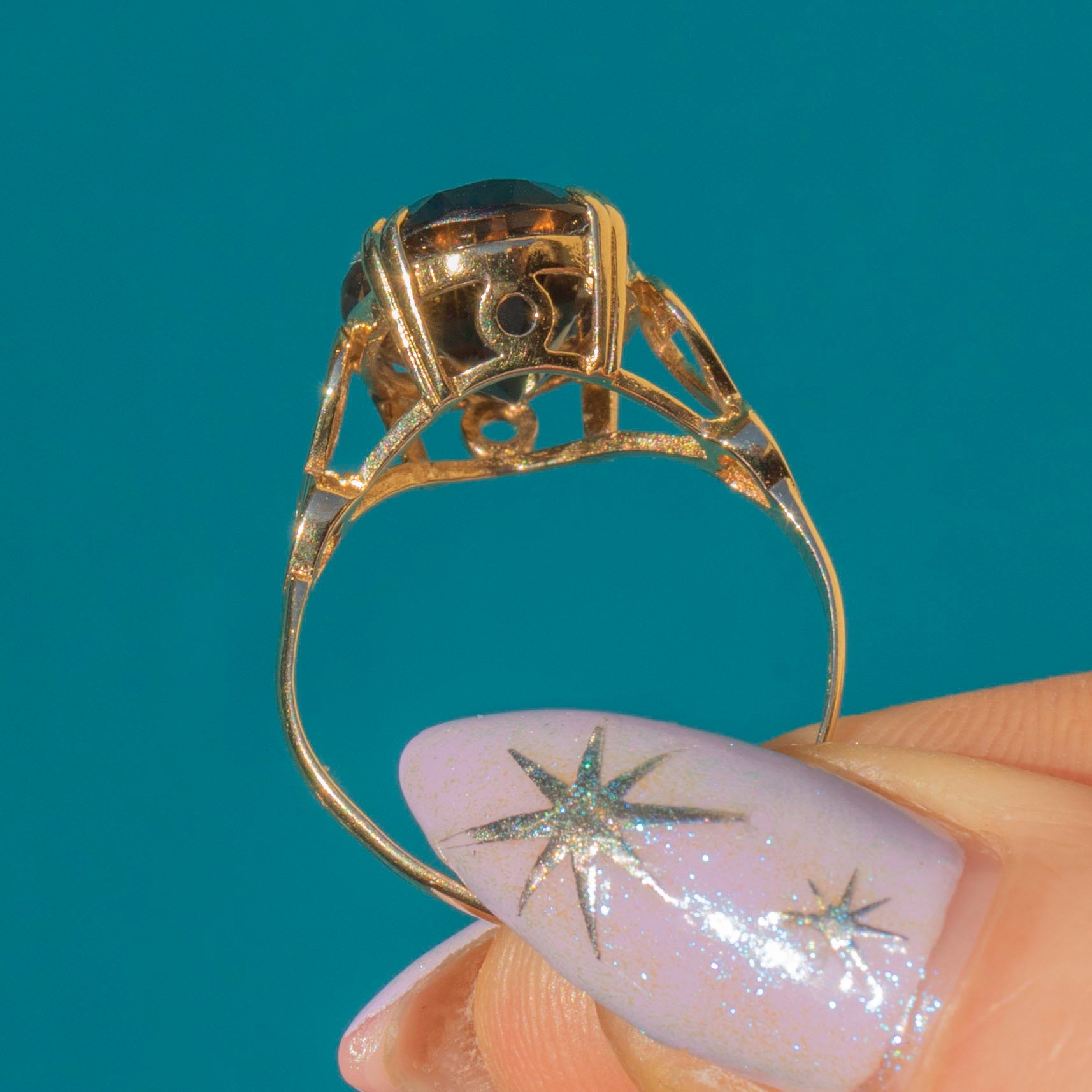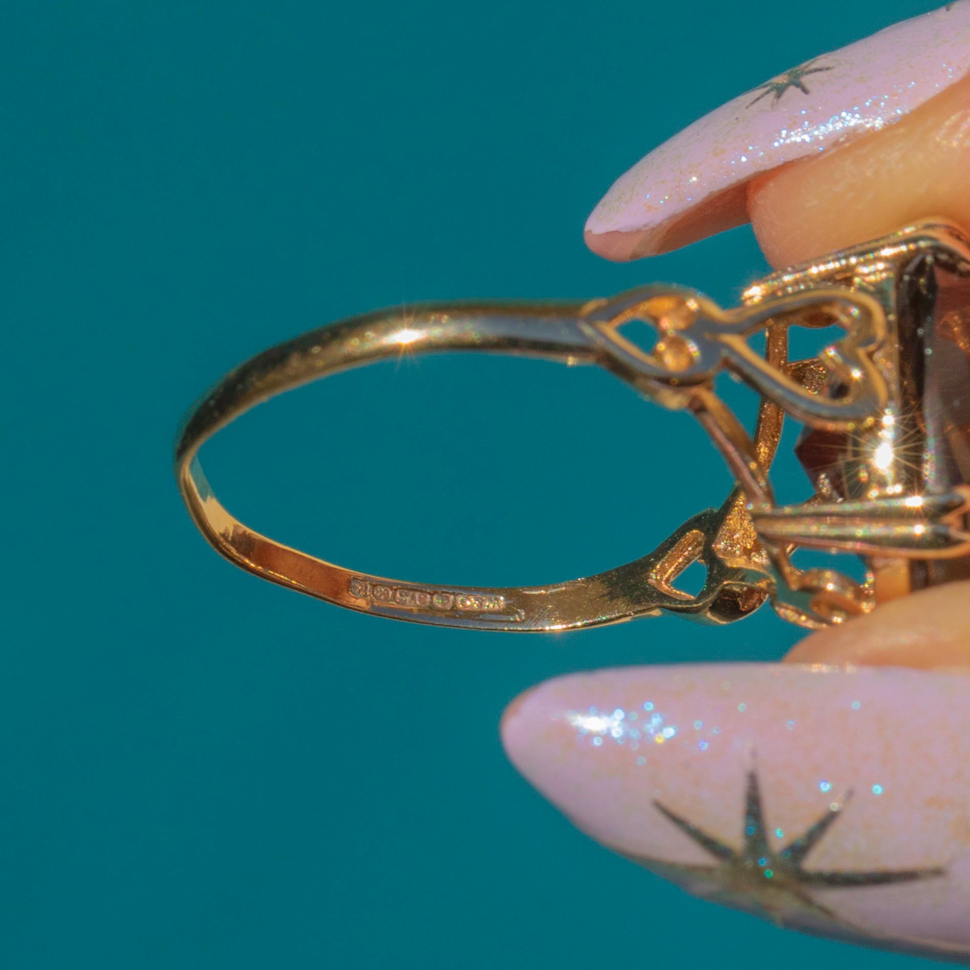 VERY GOOD. This 9ct Gold Smokey Quartz ring is in lovely condition. Although there is slight surface wear to the Smokey Quartz, this is barely noticeable through her deep brown hues. She is secure in her claw settings and her 9ct Gold has retained its shape well, sitting comfortably on your finger. She is the perfect affordable treat!