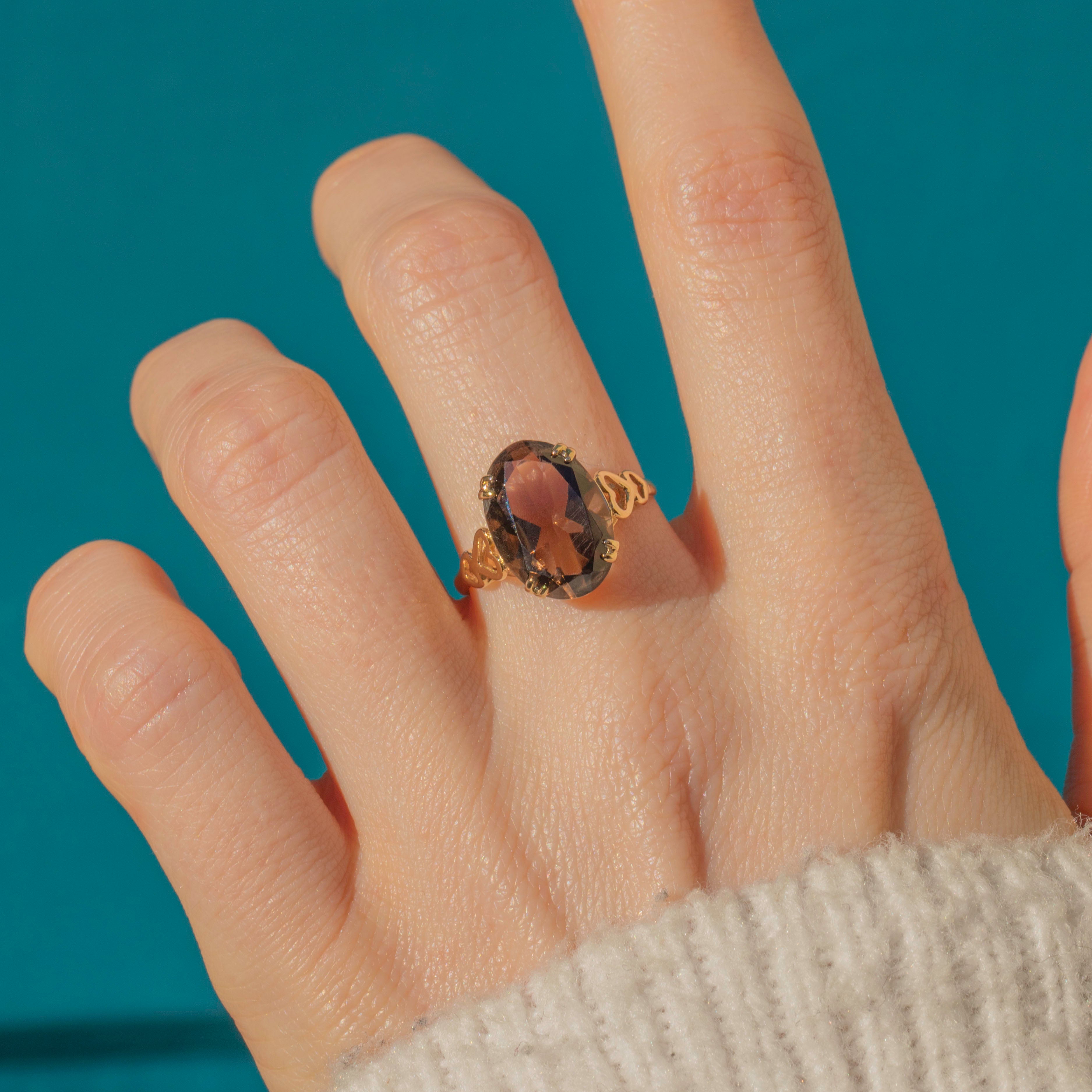 The Smokey Quartz provides wonderful finger coverage and will bestow a beautiful accent of colour to an outfit. Crafted from solid 9ct Gold, the Quartz is flanked by striking heart-shaped shoulders giving this ring an elegant finish.