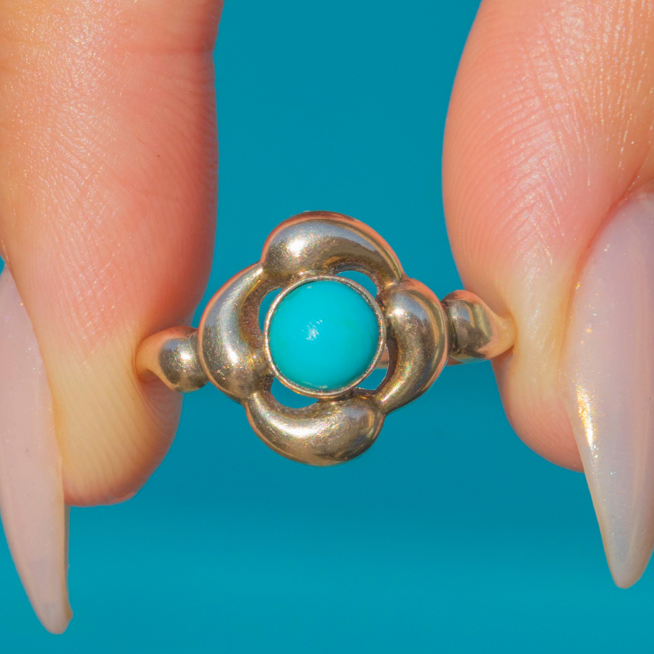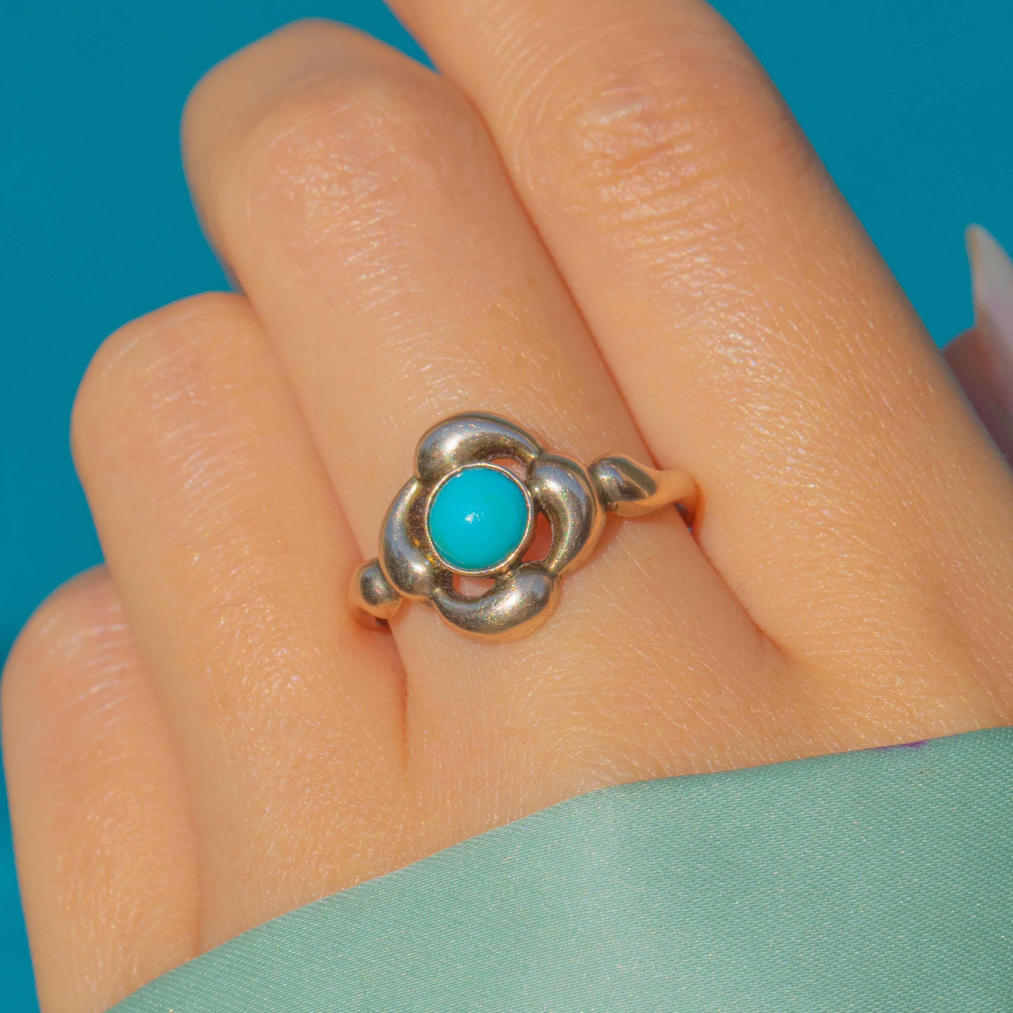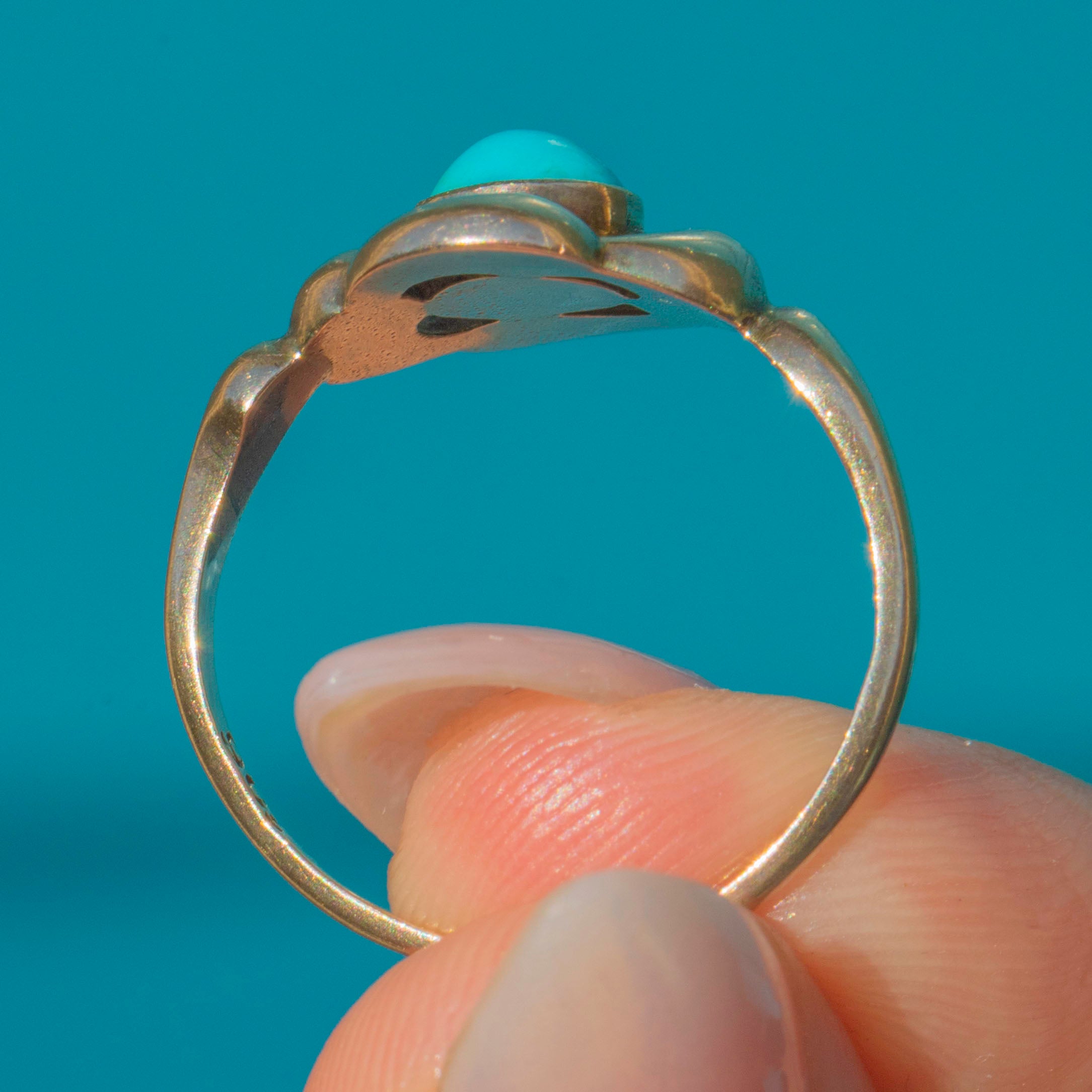 This Art Nouveau ring showcases a striking Turquoise cabochon at its centre, glowing in a vivid blue hue that contrasts wonderfully with the warm 9ct Gold settings.