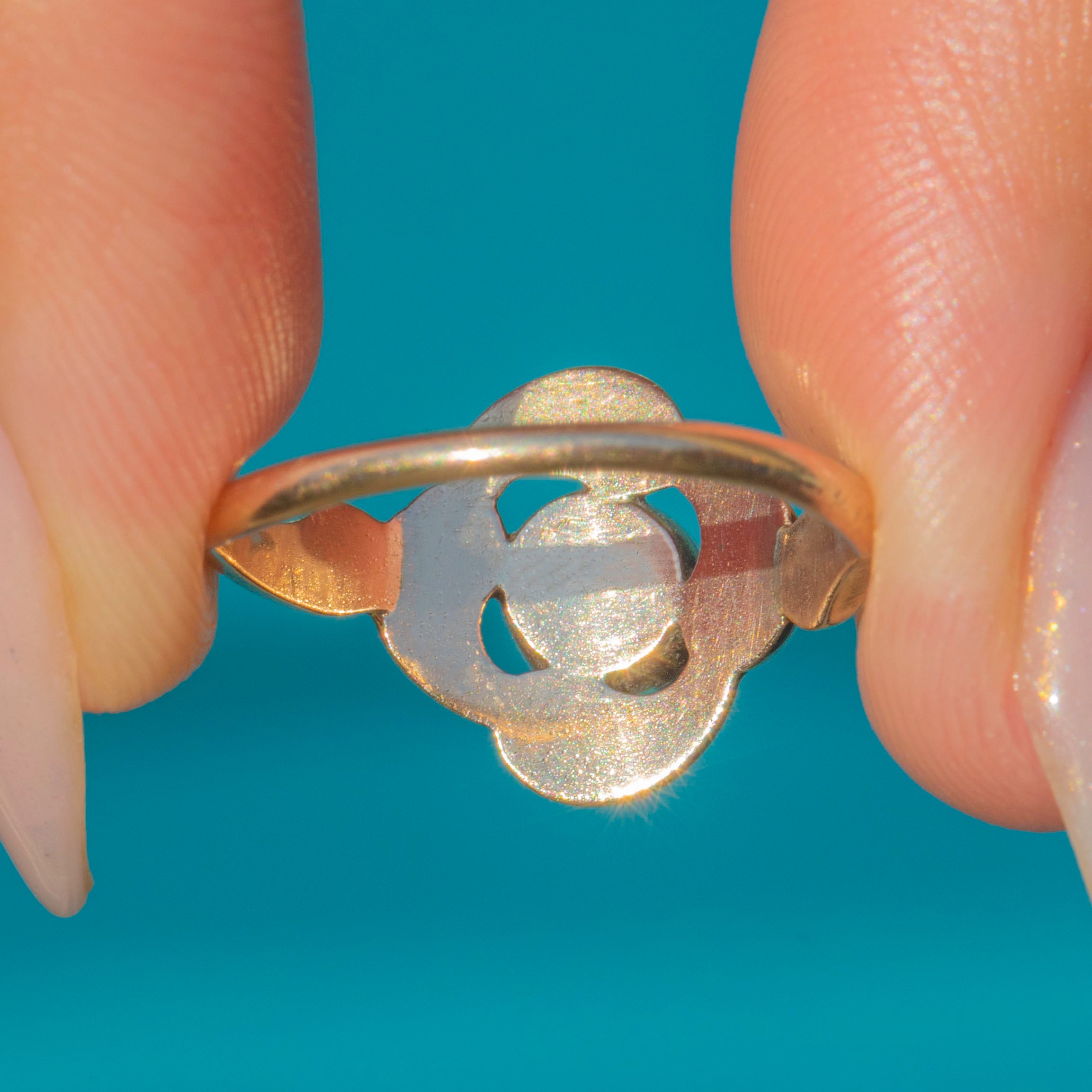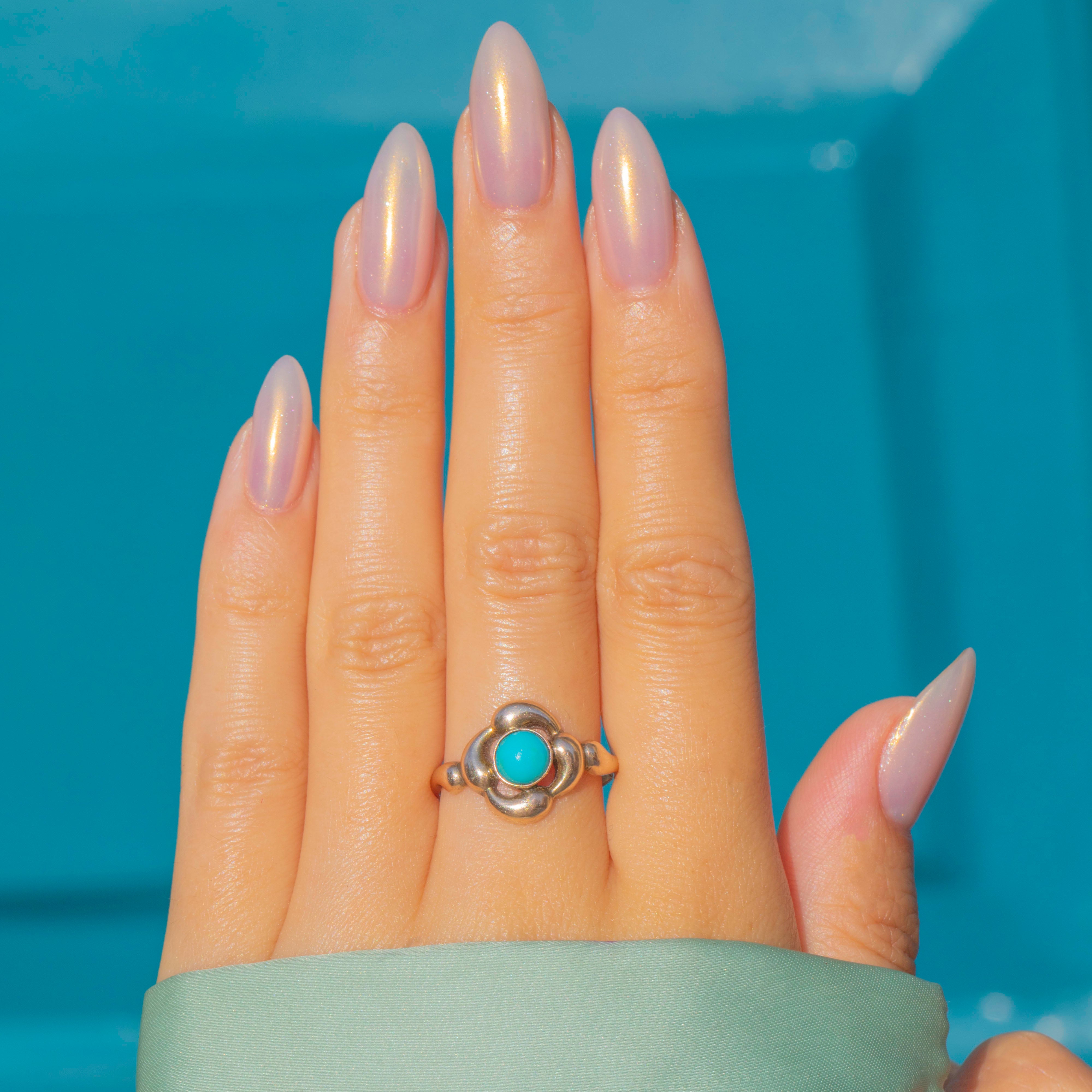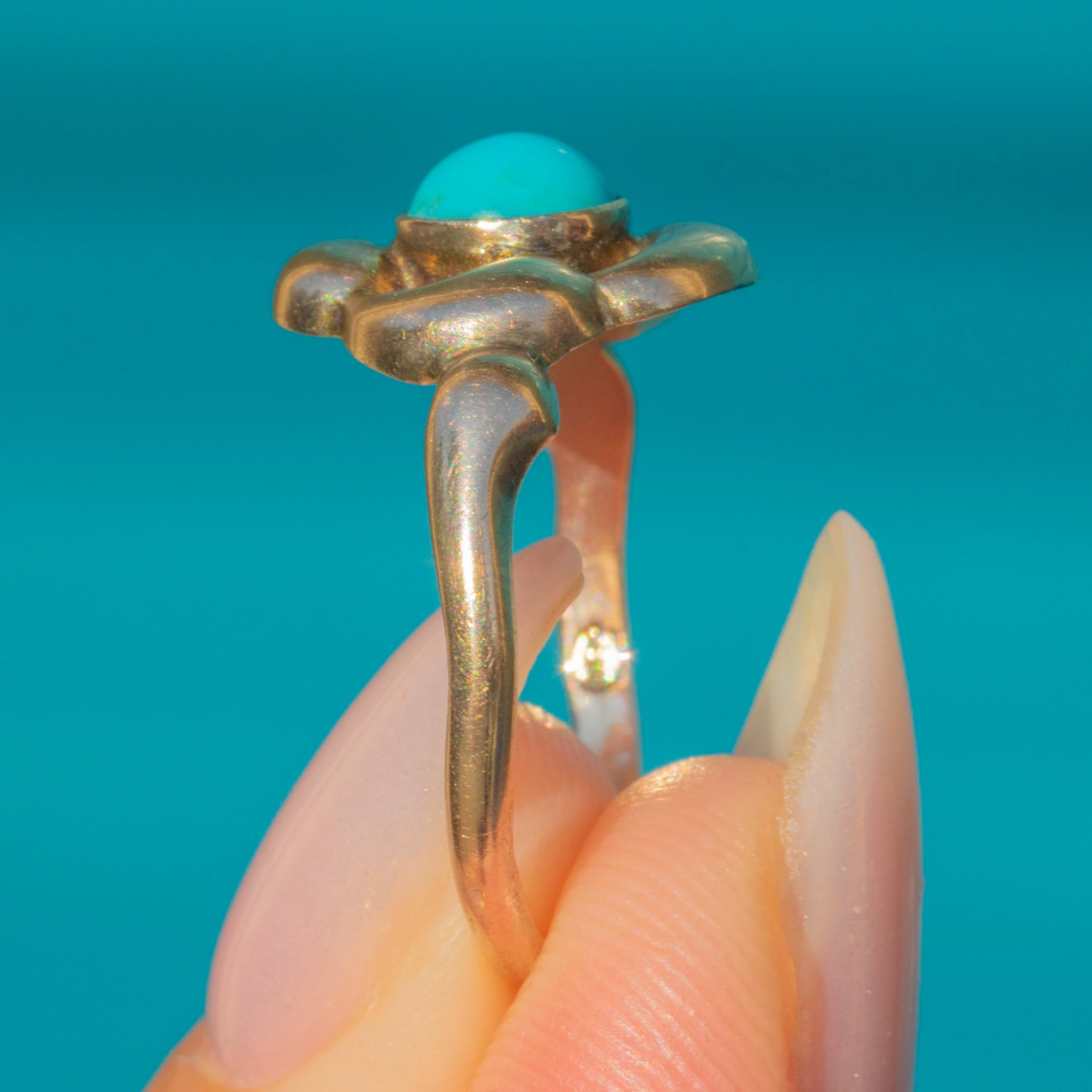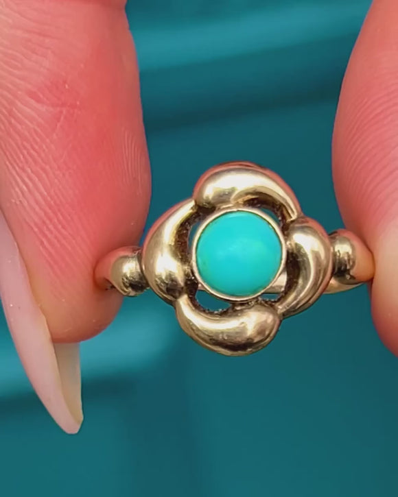 This Art Nouveau ring showcases a striking Turquoise cabochon at its centre, glowing in a vivid blue hue that contrasts wonderfully with the warm 9ct Gold settings.