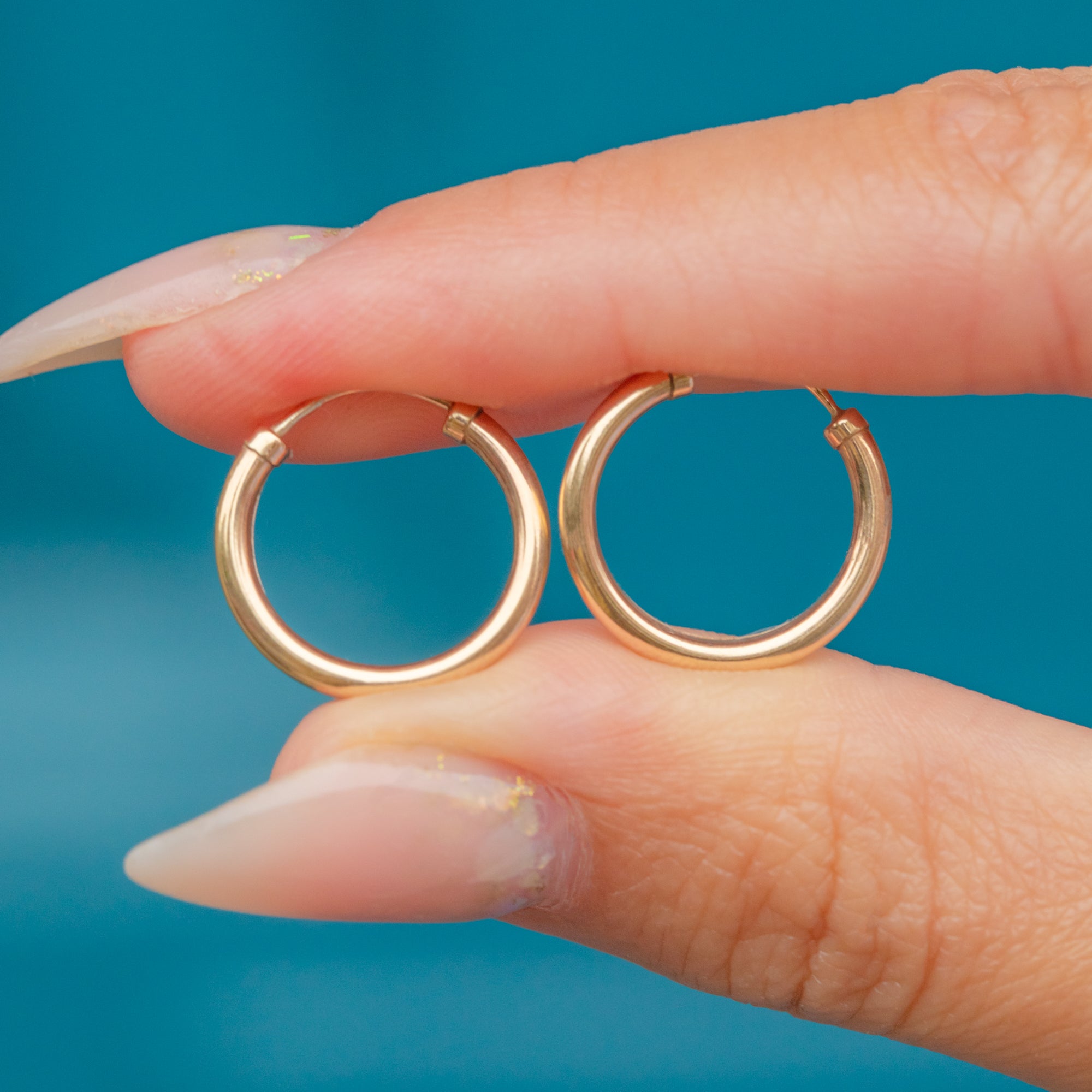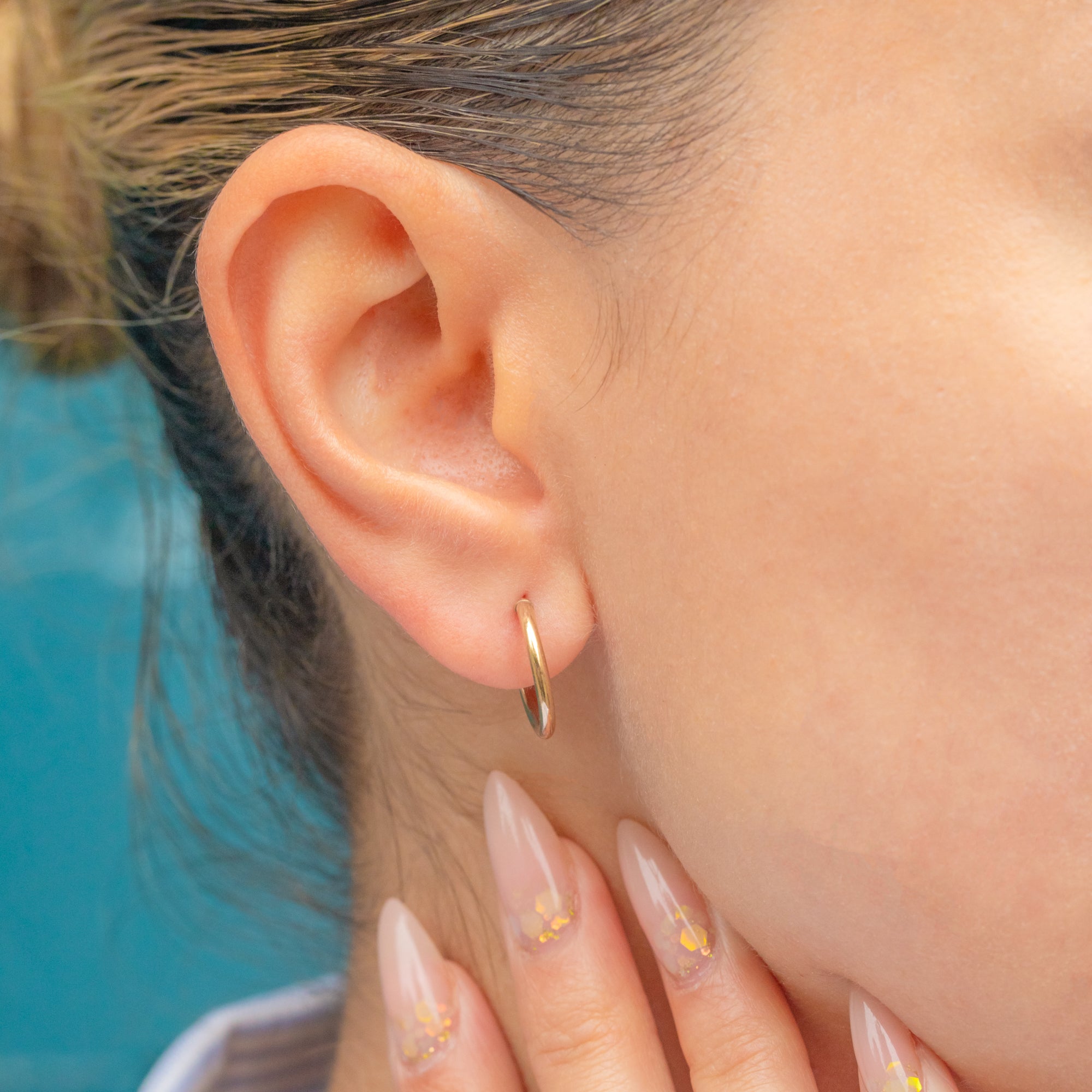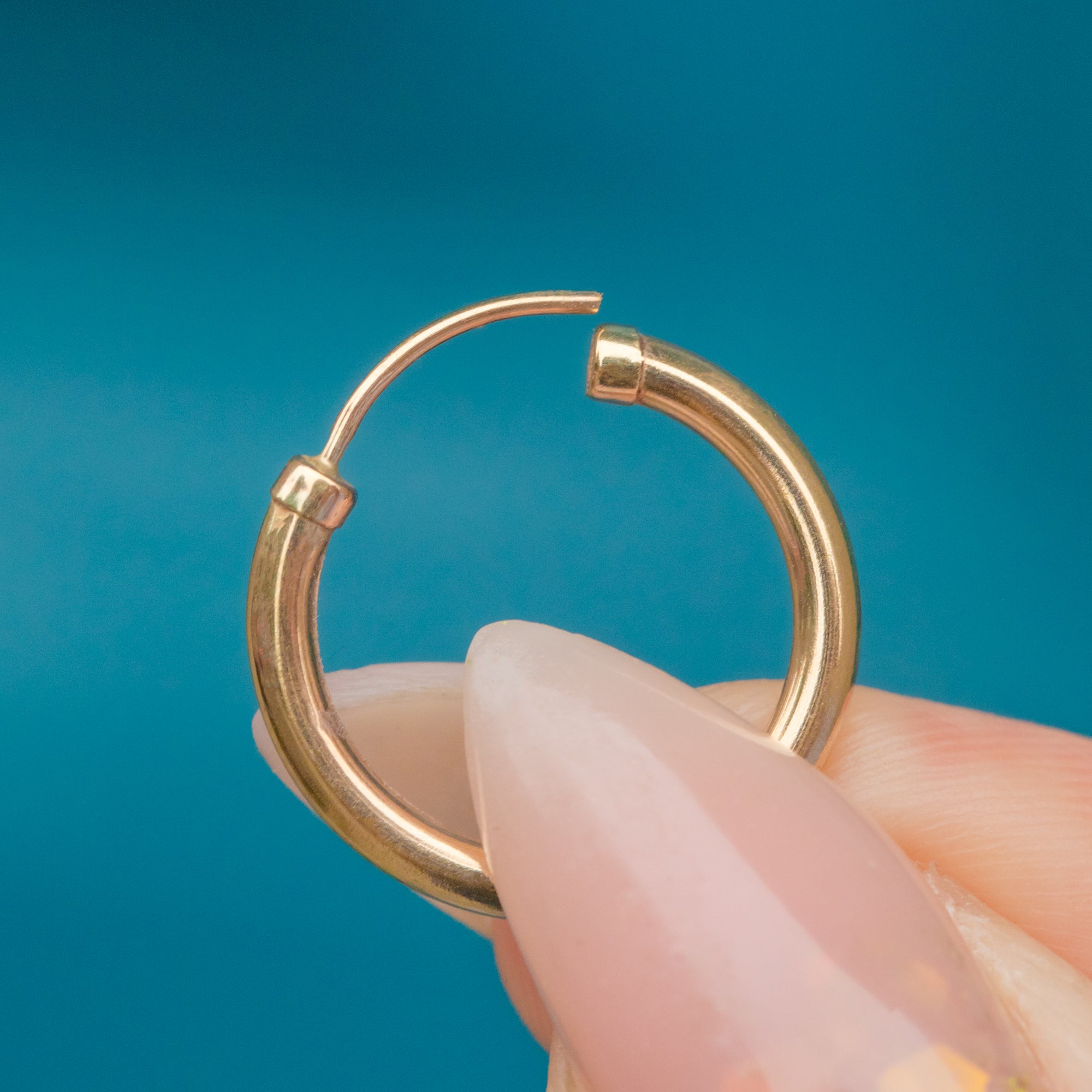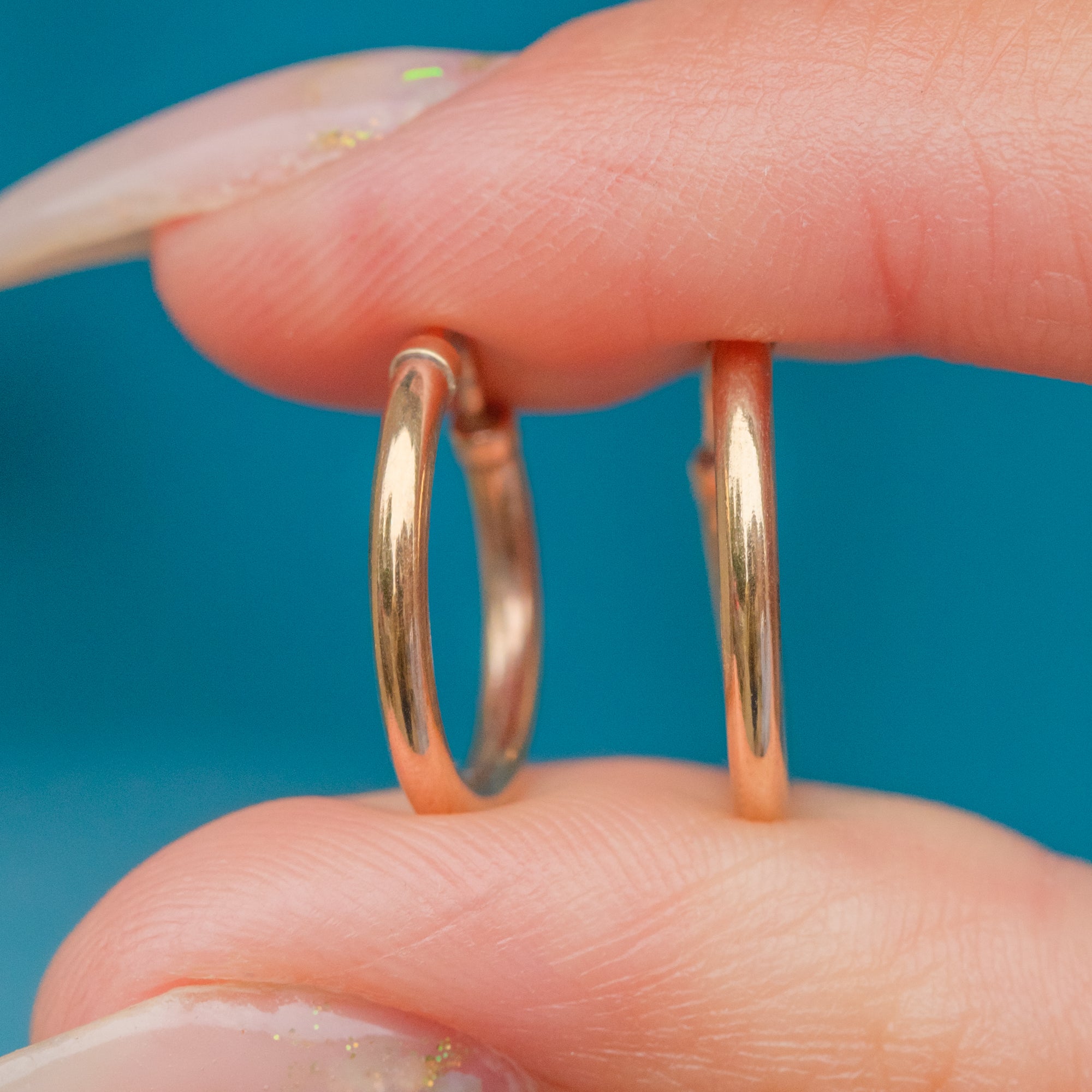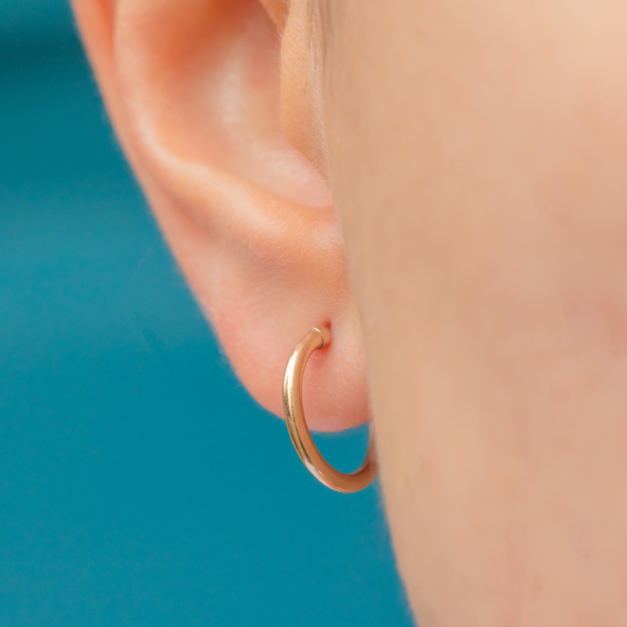 These dainty Vintage snug hoop earrings are crafted in 9ct Gold, designed to sit close to the ear for a sleek and comfortable fit. Their simple, timeless style makes them a versatile everyday pair that can be worn alone or layered with other earrings.