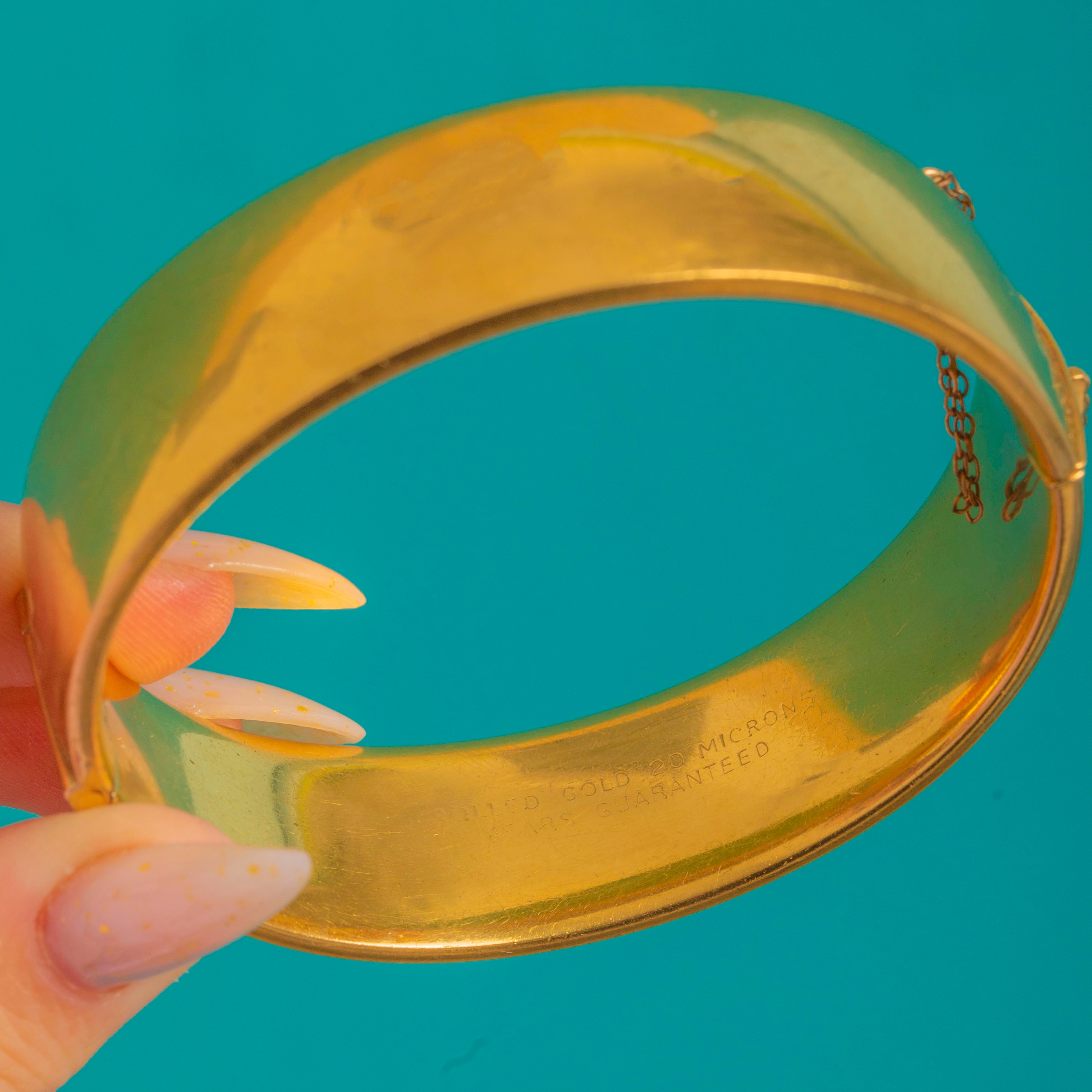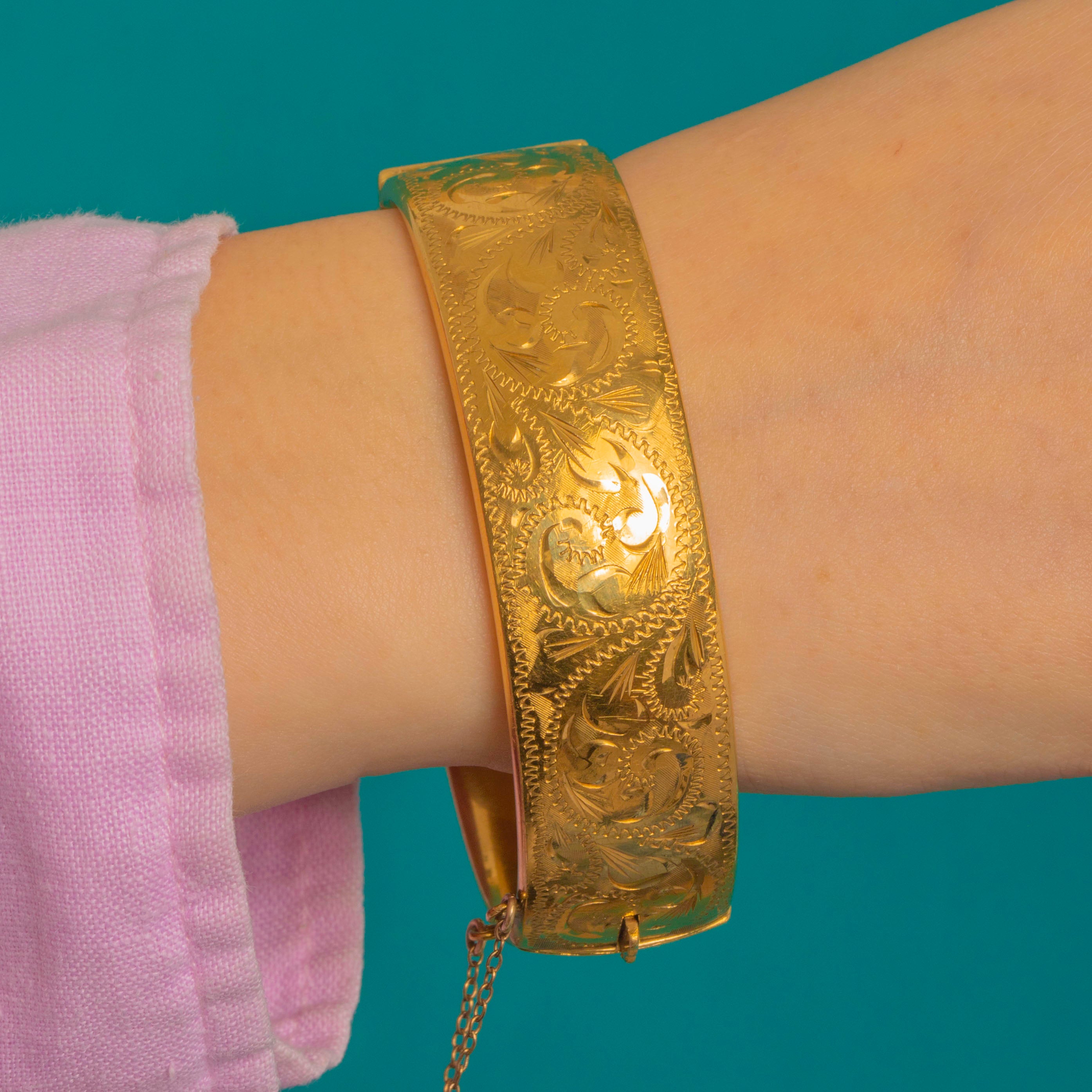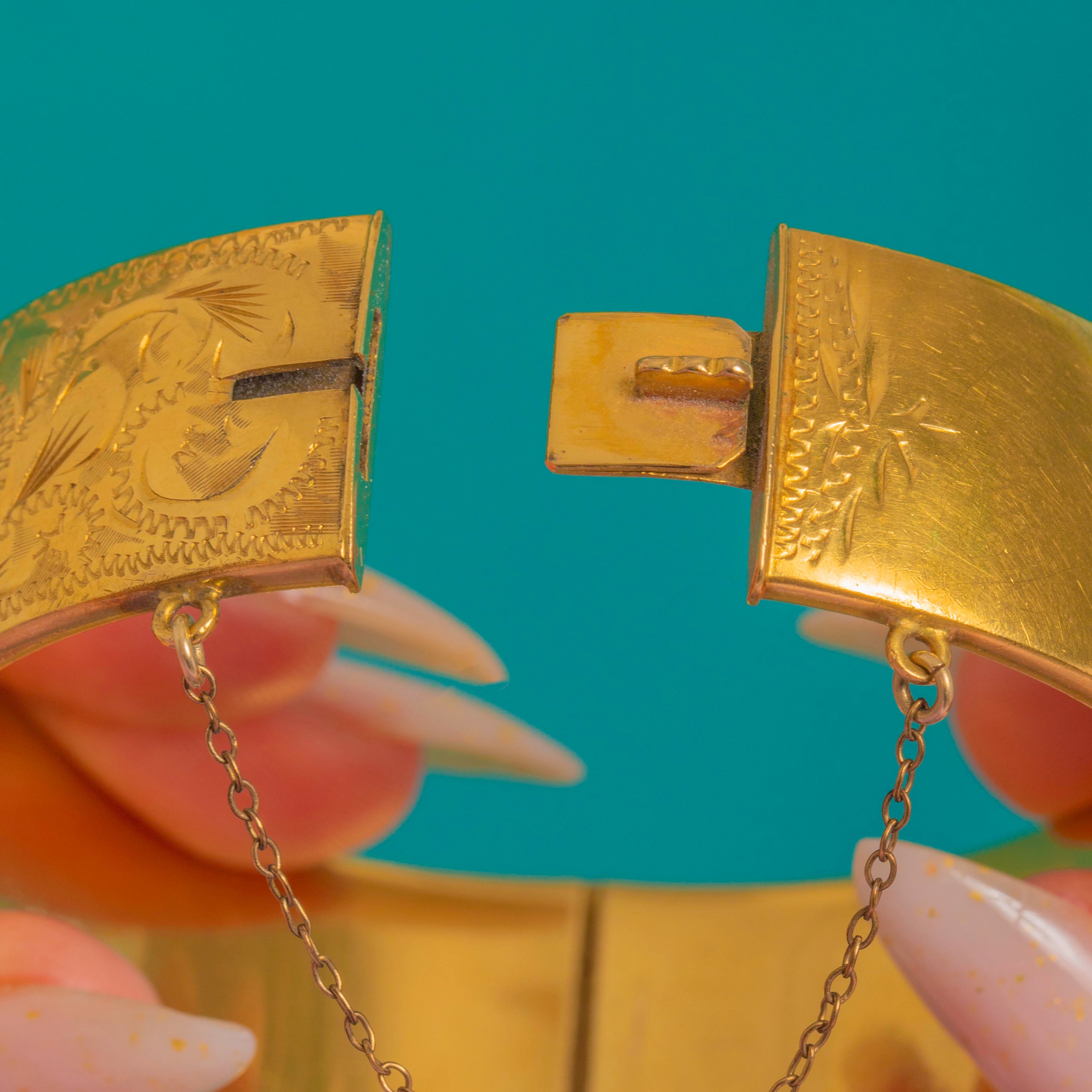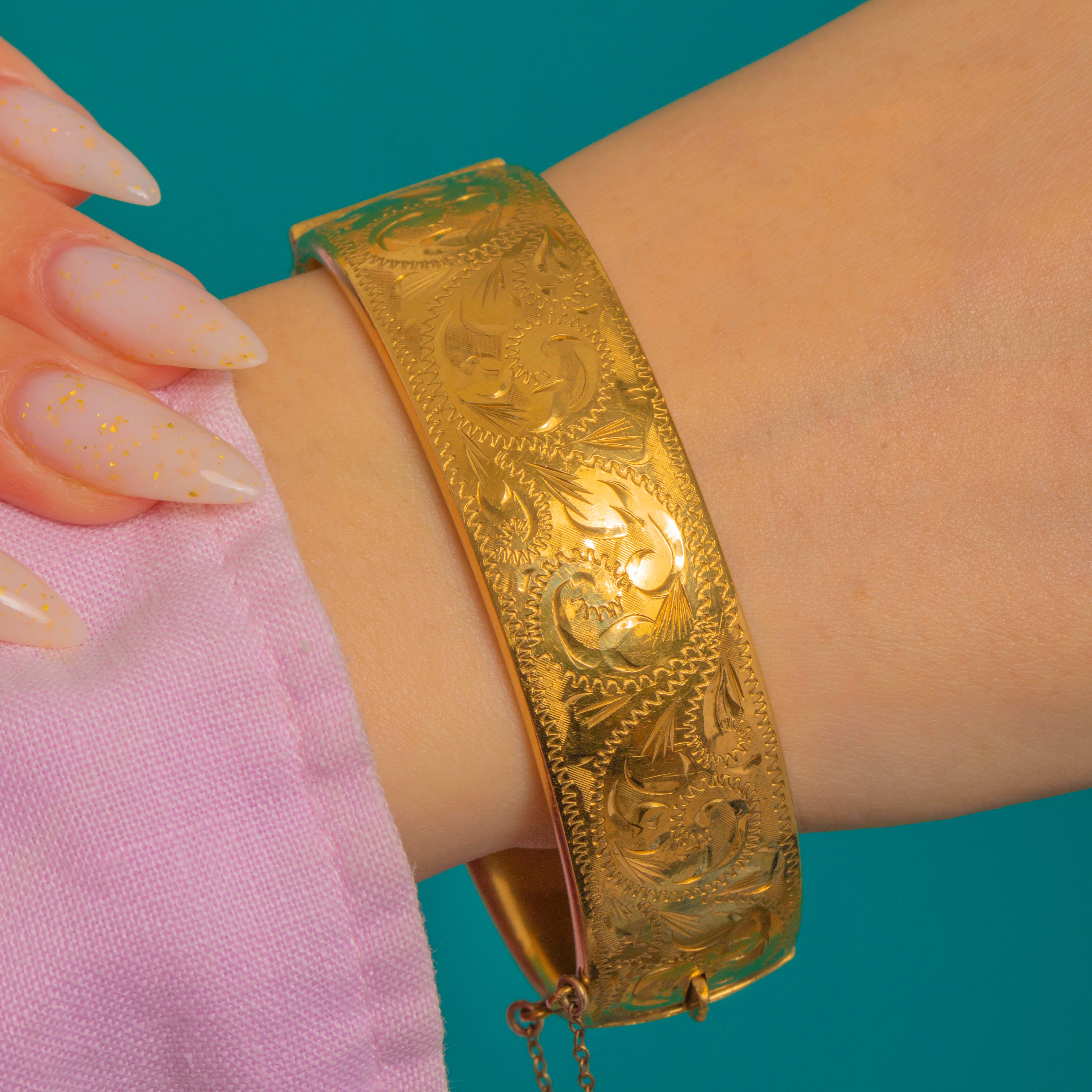 A bold, beautifully engraved Vintage hinged bangle that wraps the wrist in gleaming Yellow Gold tone. Its wide oval profile is richly detailed with crisp foliate scrolls and bright‑cut zigzag borders, the engraving catching the light with every movement for a refined, high‑shine finish.