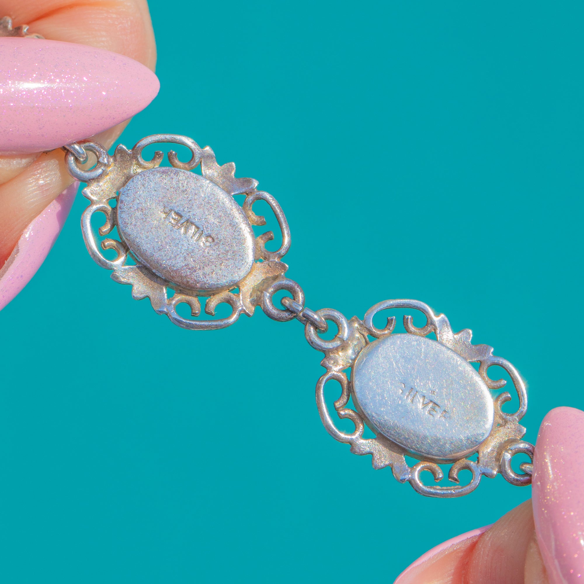 The silver-toned openwork lends a lace-like lightness to the design while amplifying the natural iridescence of the Abalone. Finished with a short link chain and simple secure closure, it’s an elegant standalone statement that also stacks seamlessly for layered styling. Stamped “SILVER” to each link for a satisfying final flourish of Vintage detail.