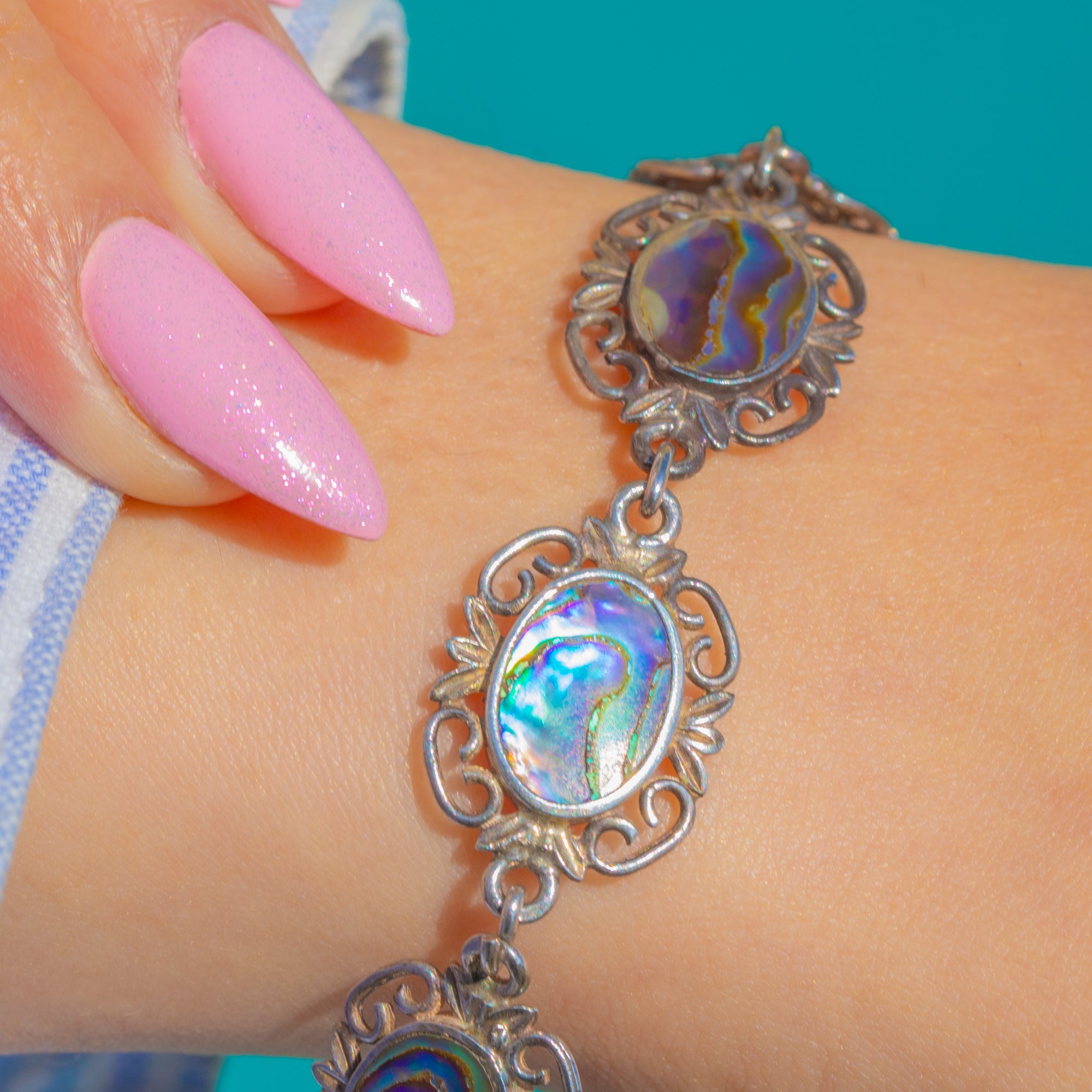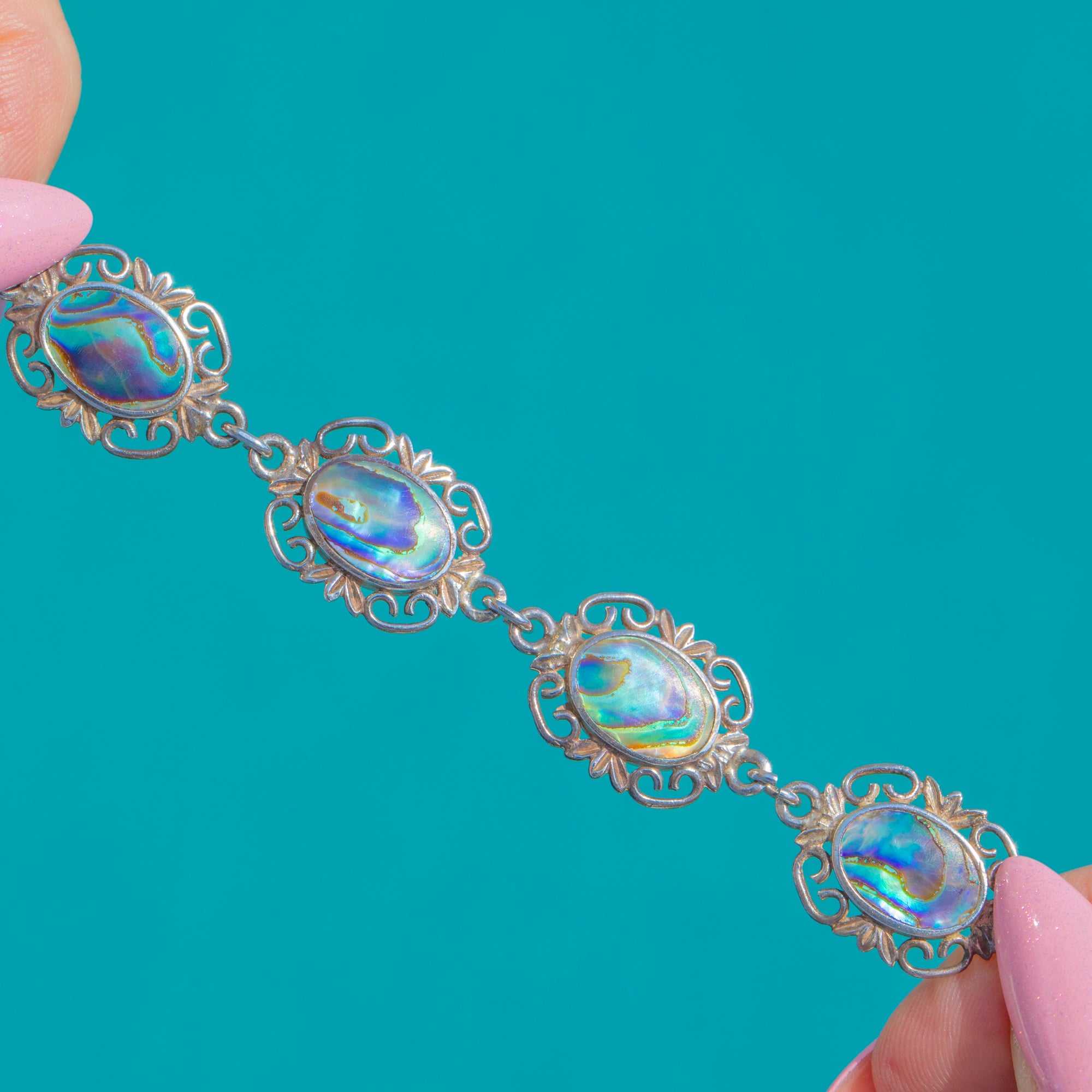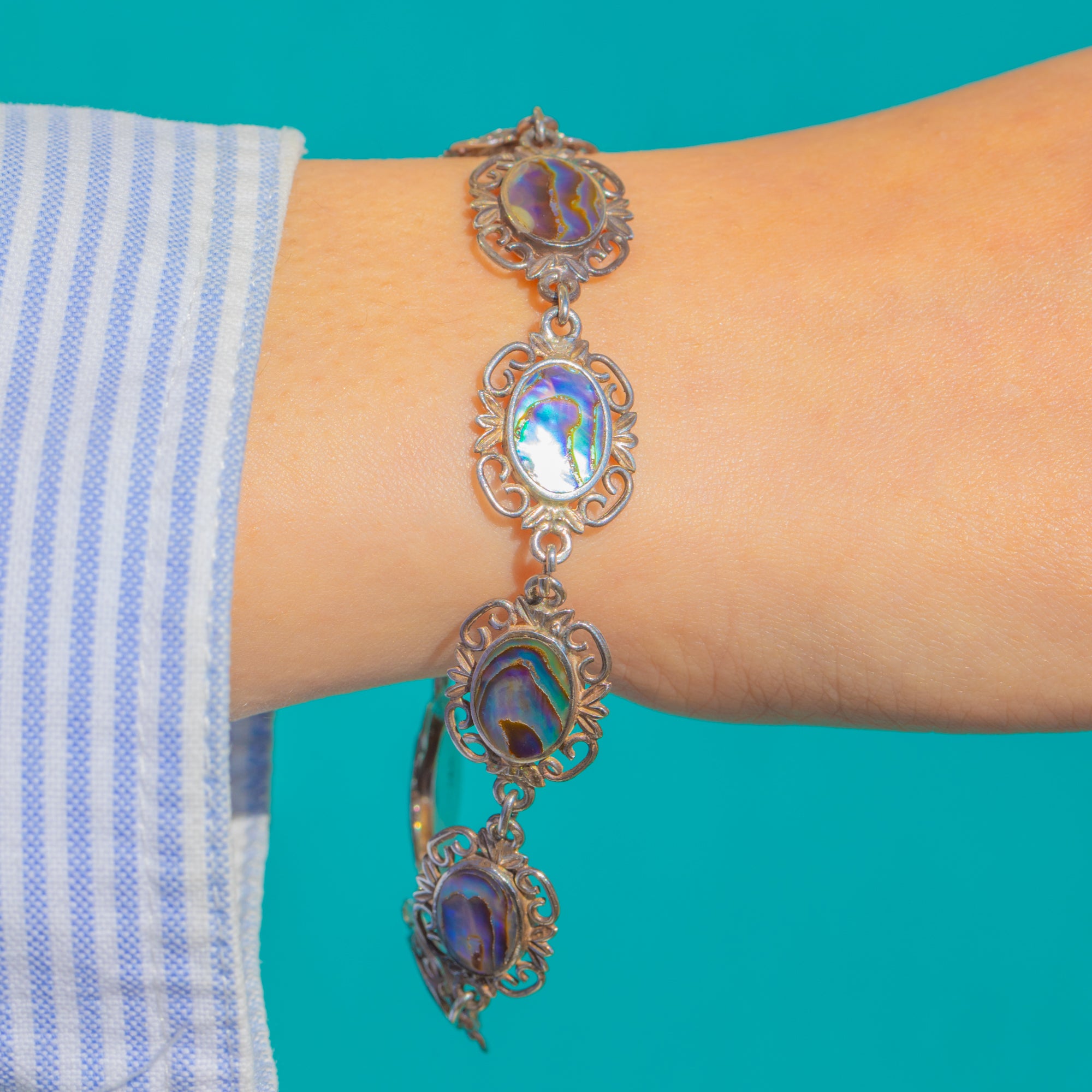 Shimmering with peacock hues of blue, green, purple and bronze, this Vintage Abalone Shell bracelet is a beautifully decorative piece with an effortlessly bohemian feel. Each glossy domed cabochon is bezel-set within ornate pierced scroll-and-foliate frames, the articulated links flowing gracefully around the wrist with a soft, fluid drape.