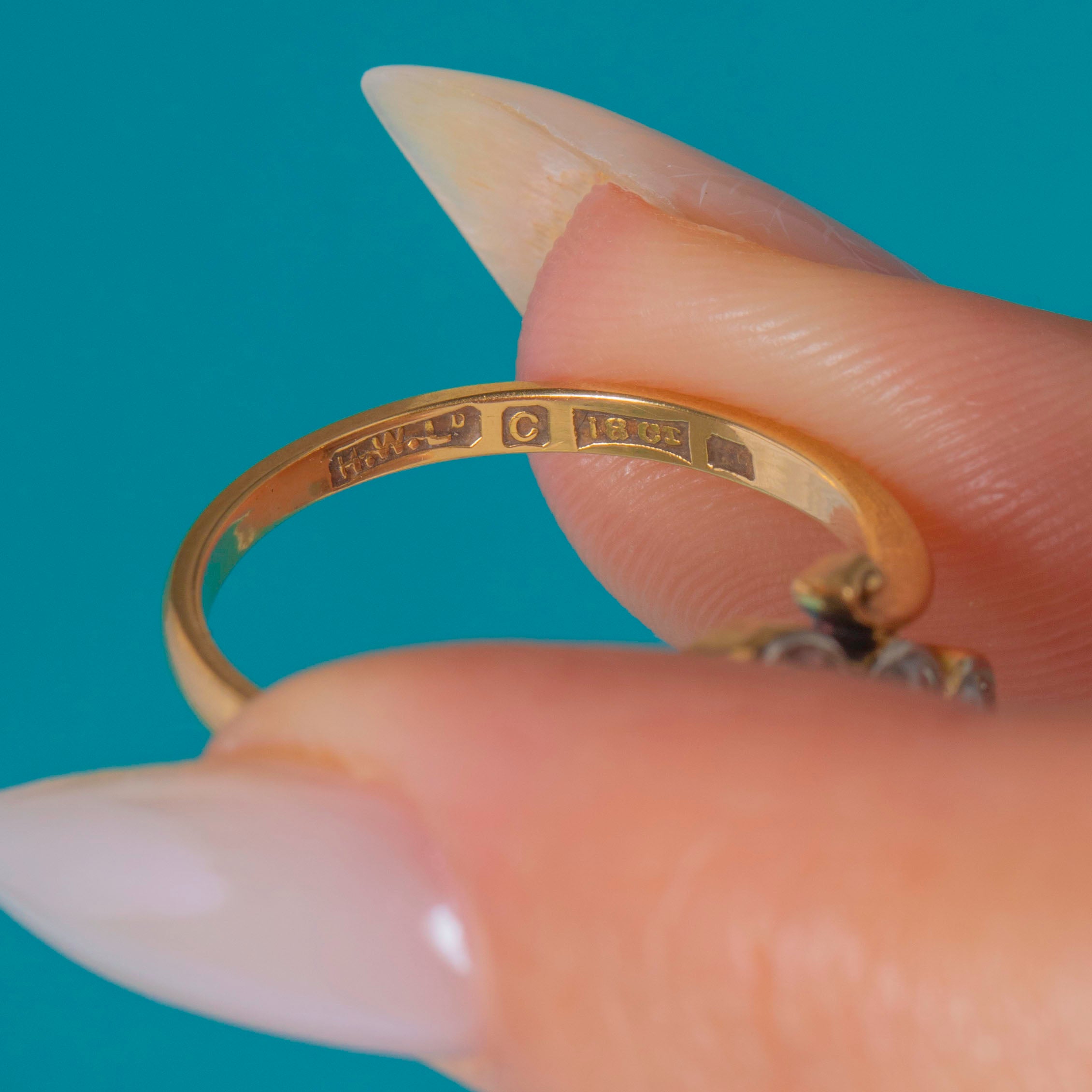 Delicate and romantic, this antique twist trilogy ring captures the Belle Époque mood with effortless finesse. Three bright, scintillating Old Mine Cut Diamonds are set in white Gold topped rub-over bezels, their fine millegrain edges and linear arrangement elegantly framed by sinuous crossover S-scroll shoulders. Crafted in 18ct Gold, the low-profile head sits close to the finger for a refined, wearable silhouette.