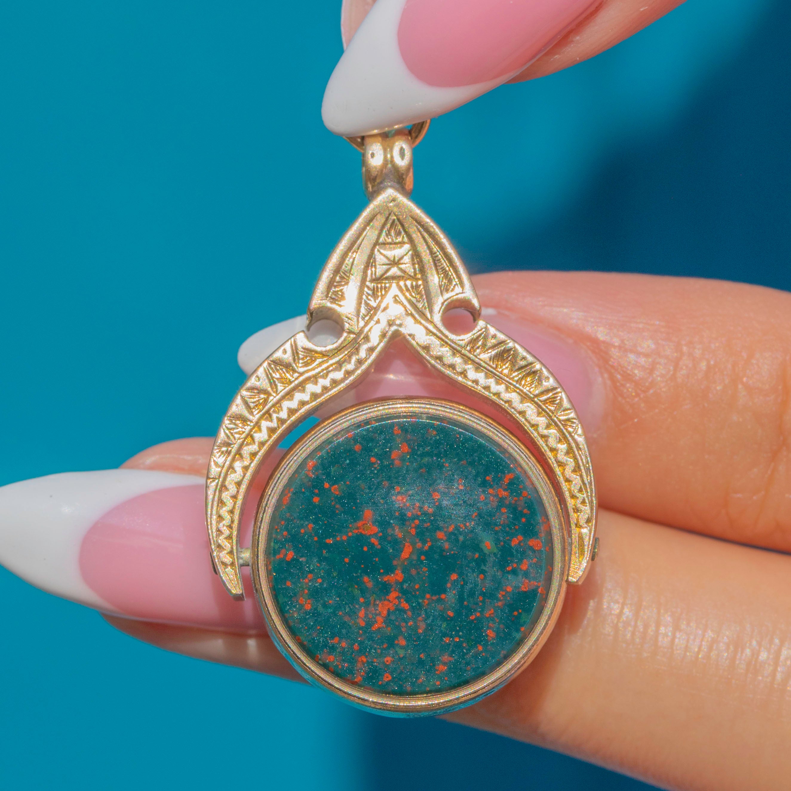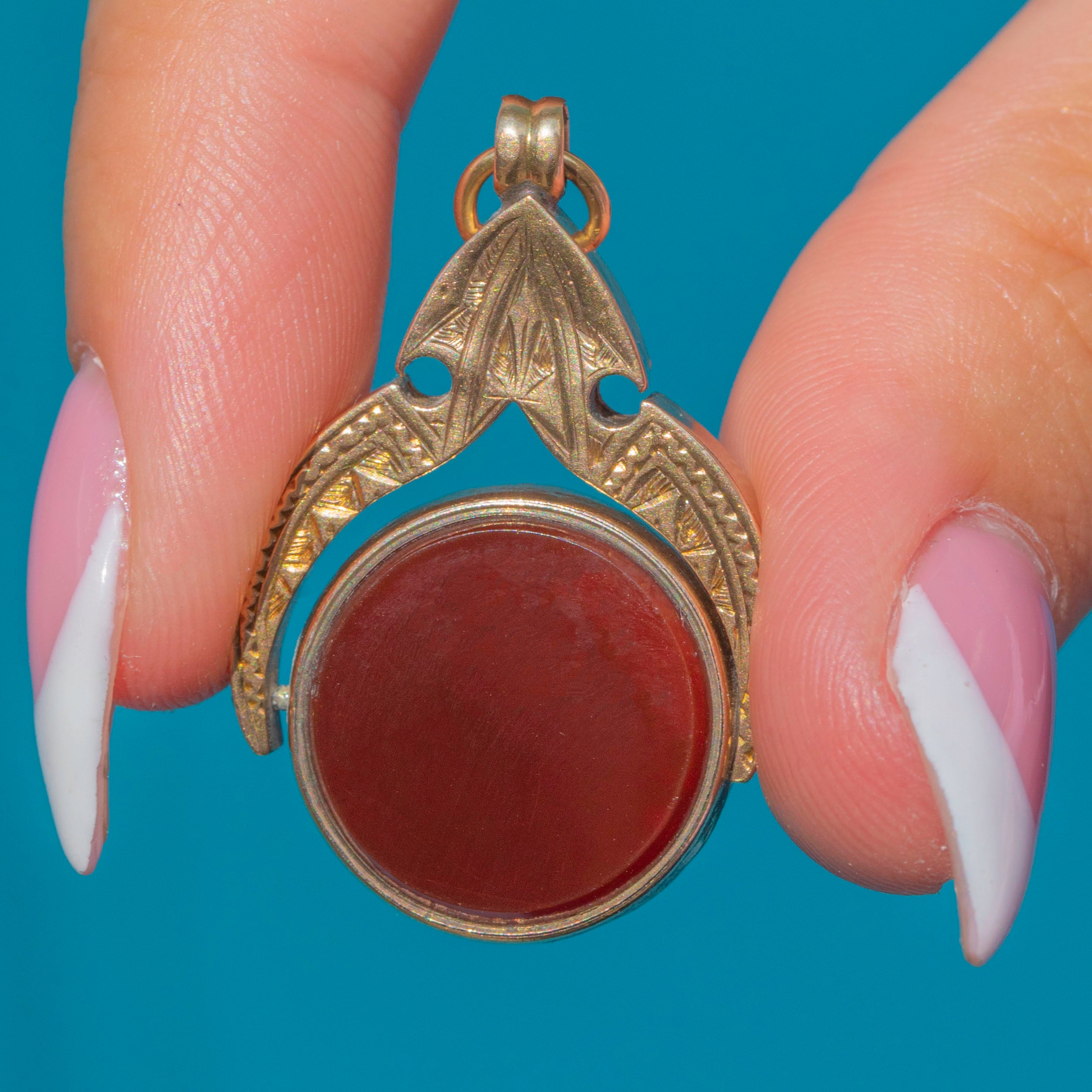 EXCELLENT: The Gold is bright and the engravings are clear. There is some mild wear to the Gold, but nothing too untoward.  The Carnelian and Bloodstone are perfectly smooth. The spinner moves freely. This Victorian pendant would make an excellent choice for a gift or a special treat for yourself.