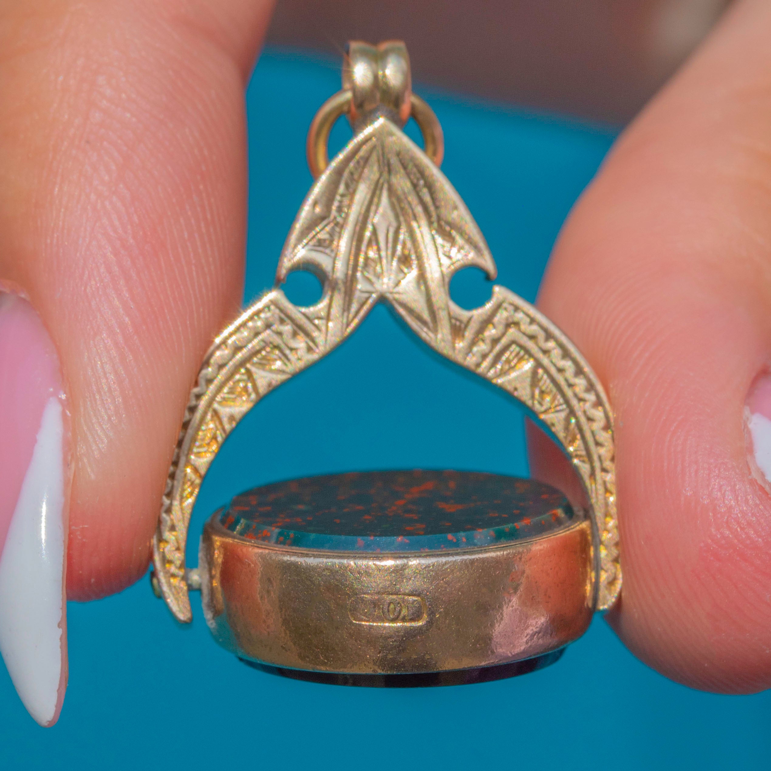 Antique 10ct Gold Engraved Bloodstone Carnelian Spinner Fob Pendant