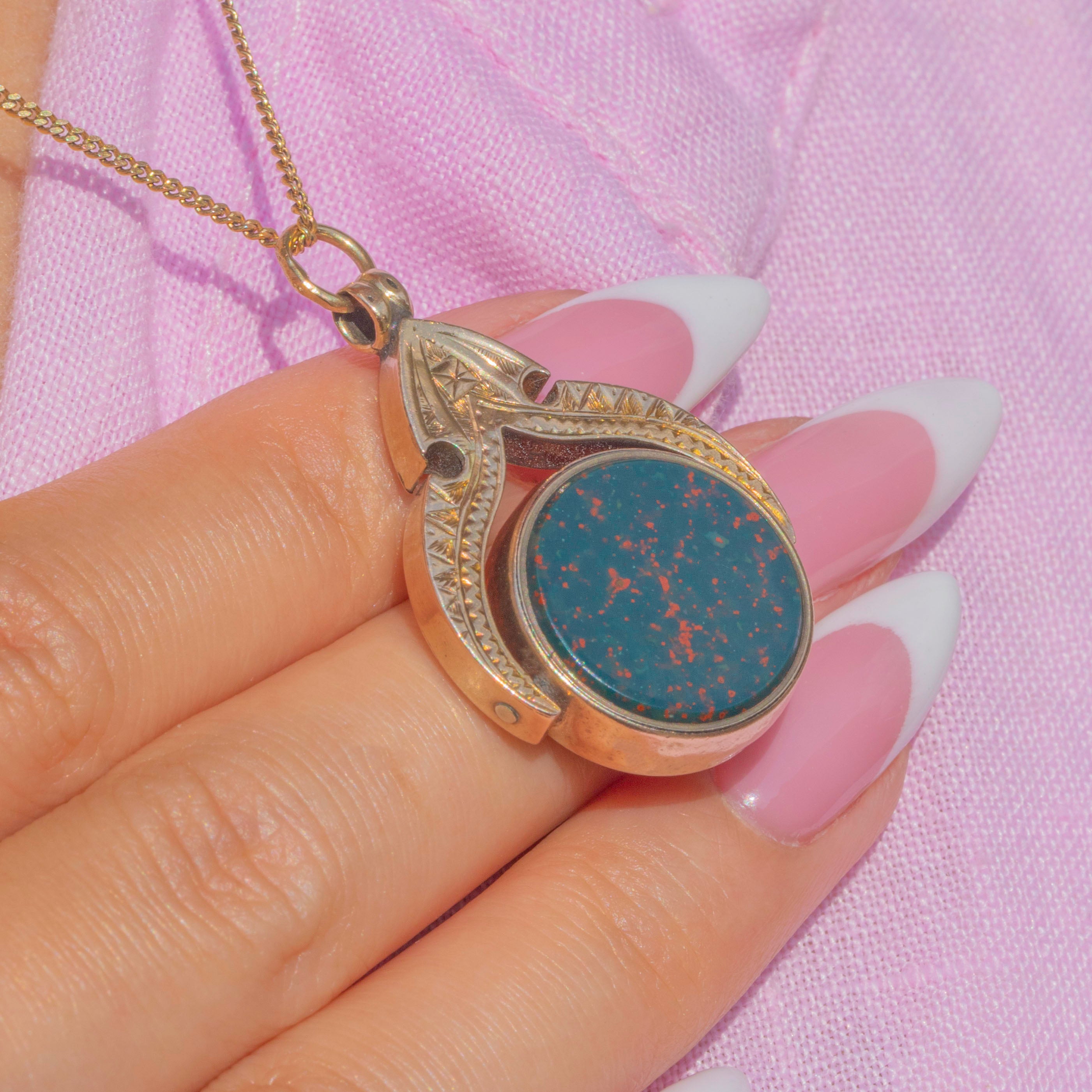 On one side, a deep burnt orange Carnelian and on the other a forest green Bloodstone with speckles of red running through its surface. Bright yellow Gold surrounds each stone and draws the gaze to the hand-engraved patterns decorating the bale, forming a crown on top of this striking piece of antique jewellery.