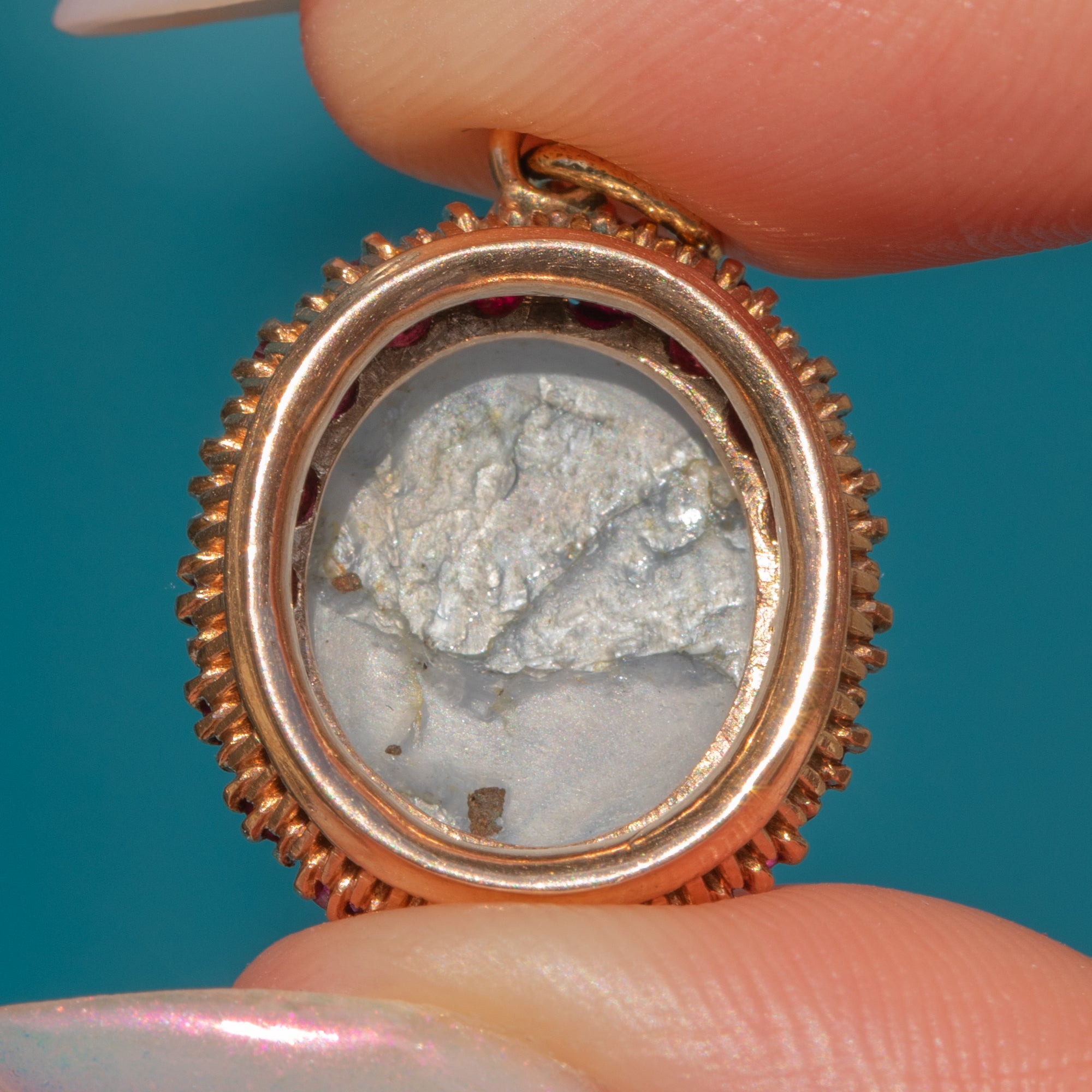 VERY GOOD-EXCELLENT: This antique 14ct Gold Natural Star Sapphire Ruby cluster pendant is in wonderful condition, with all stones securely set and the original craftsmanship beautifully preserved. The central Natural Star Sapphire is smoothly domed, with only a few mild surface marks, largely concealed by the Sapphire's soft, shimmering asterism but visible under close inspection. The surrounding Rubies are all present with a radiant hue, they exhibit some minor abrasions, typical for antique pieces of this kind, but this does not detract from the overall appearance or integrity of the setting.