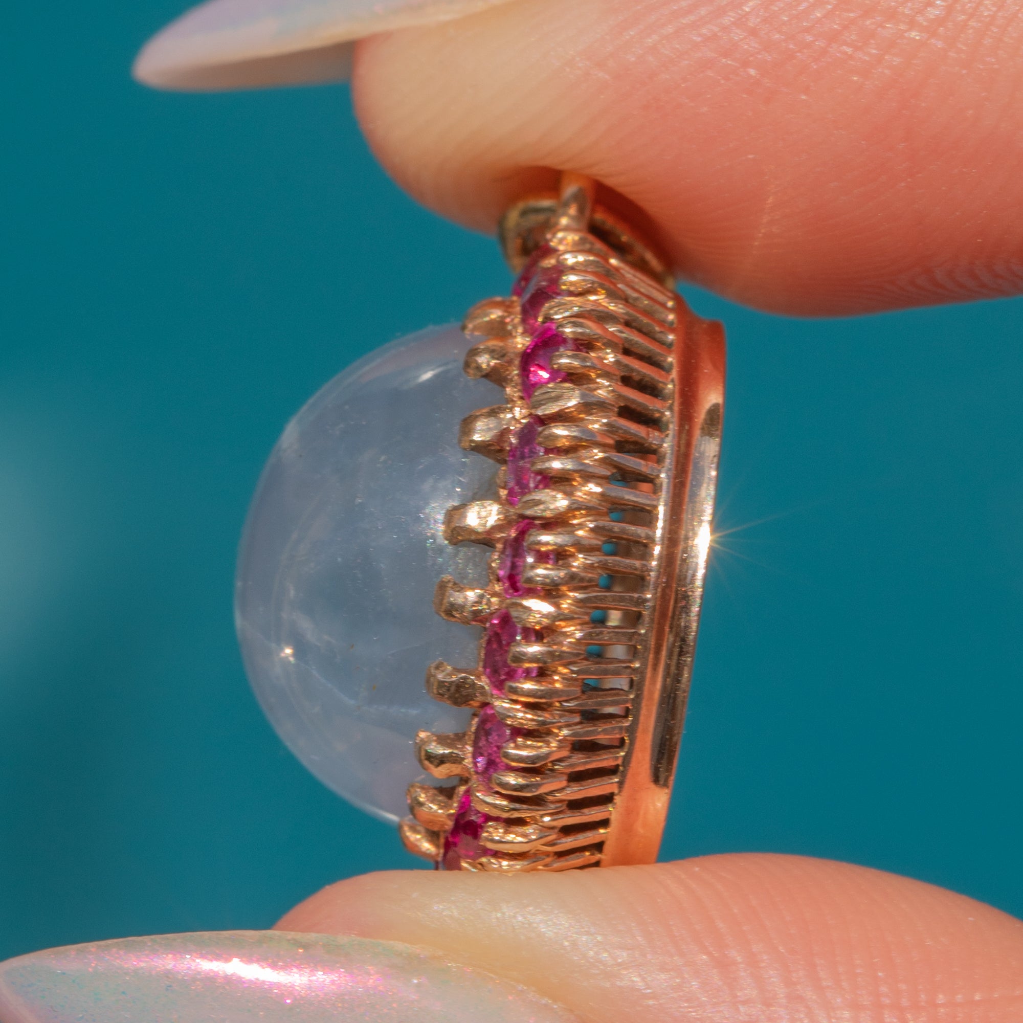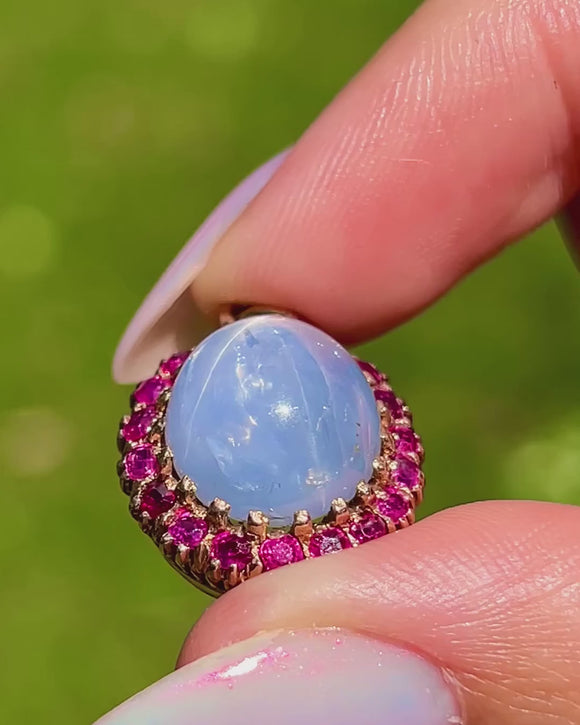 This antique 14ct Gold natural Star Sapphire Ruby cluster pendant is a sight to behold! This graceful Edwardian pendant features a luminous natural Star Sapphire, her silken asterism gently shimmering across the surface like moonlight reflected in water. Encircling the central gem is a vivid halo of Rubies, their deep pink-red tones offering a beautiful contrast and enhancing the Sapphire’s mysterious, ethereal glow.