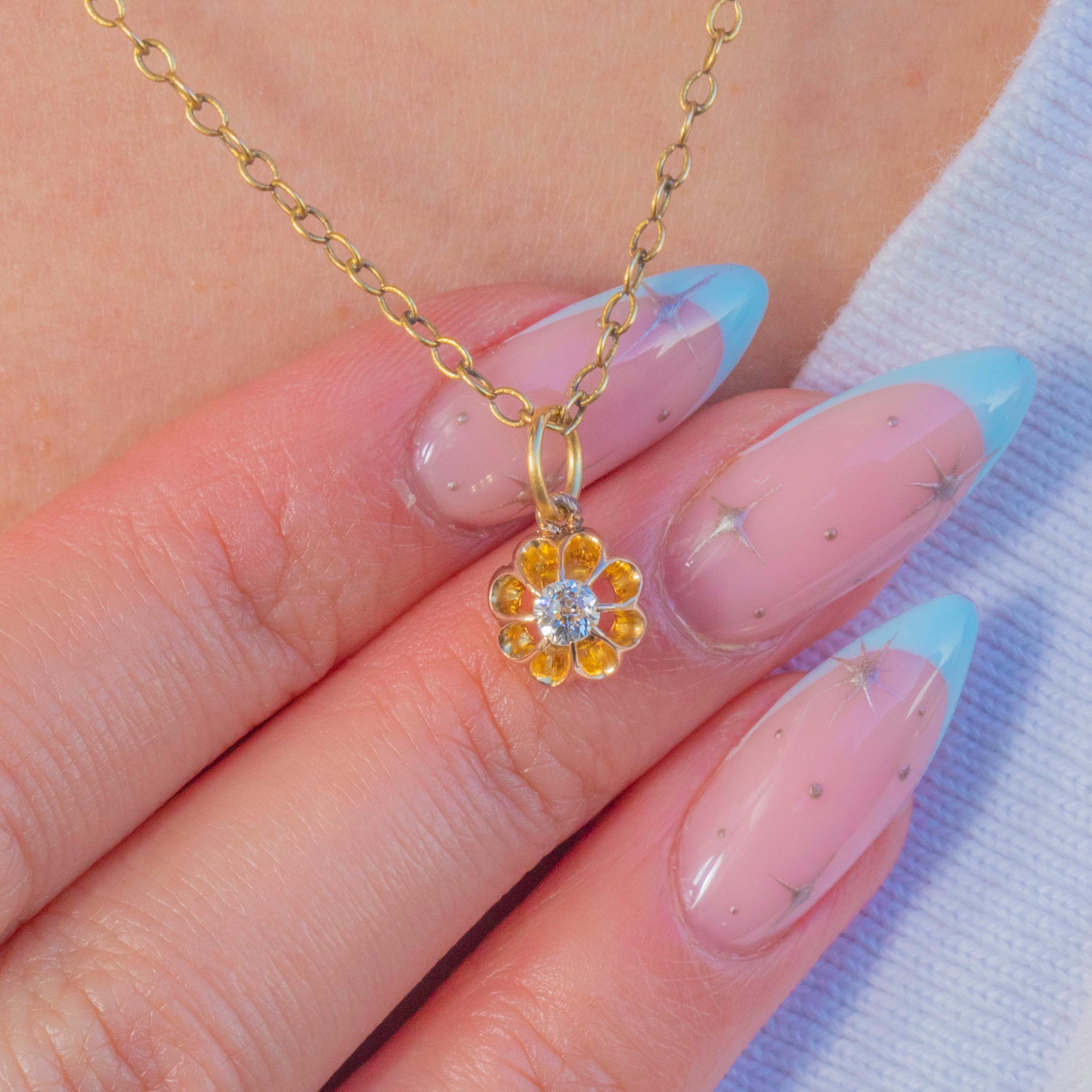 A darling Victorian buttercup charm in glowing 14ct Gold, set with a natural Old Mine Cut Diamond. The scalloped petal setting cradles the stone beautifully, drawing light across its crisp antique facets and open culet for a bright, lively sparkle. Petite yet radiant, it’s a timeless touch of antique elegance for a chain or bracelet.