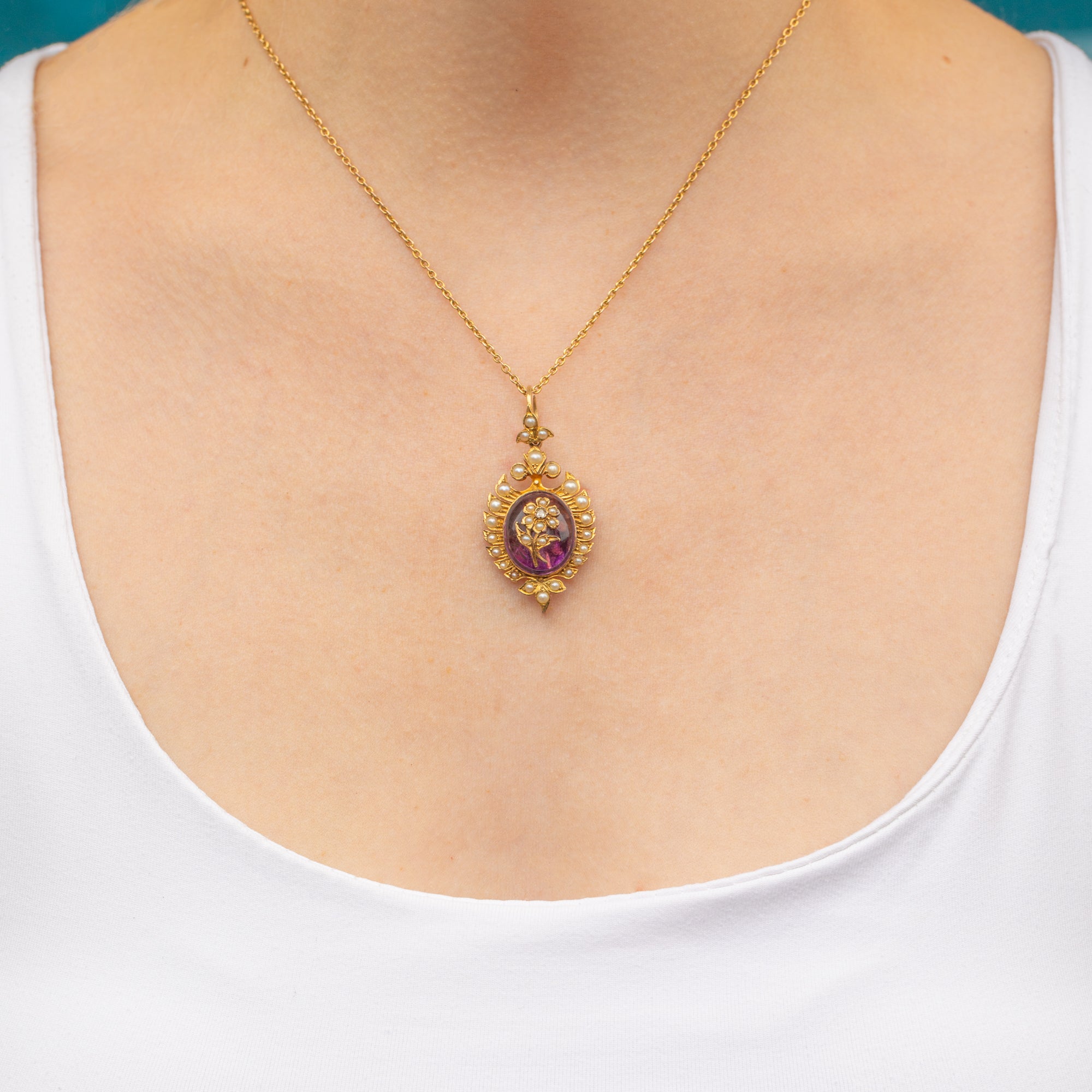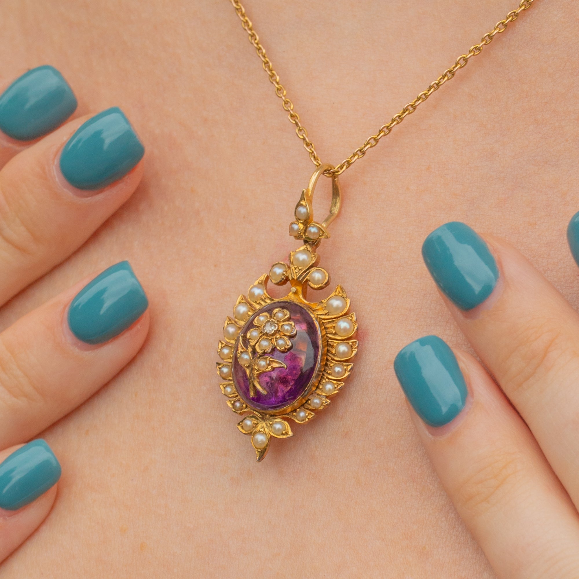 A halo of plump shimmering Pearls surrounds the eye-catching Amethyst, framed by striking feather-like Gold details for a refined finish. Turn this Victorian Gold pendant over and you'll discover a locket compartment. Steeped in history and exuding a regal allure, this exquisite piece of Victorian jewellery will become a treasured heirloom, guaranteed to be admired for generations to come!