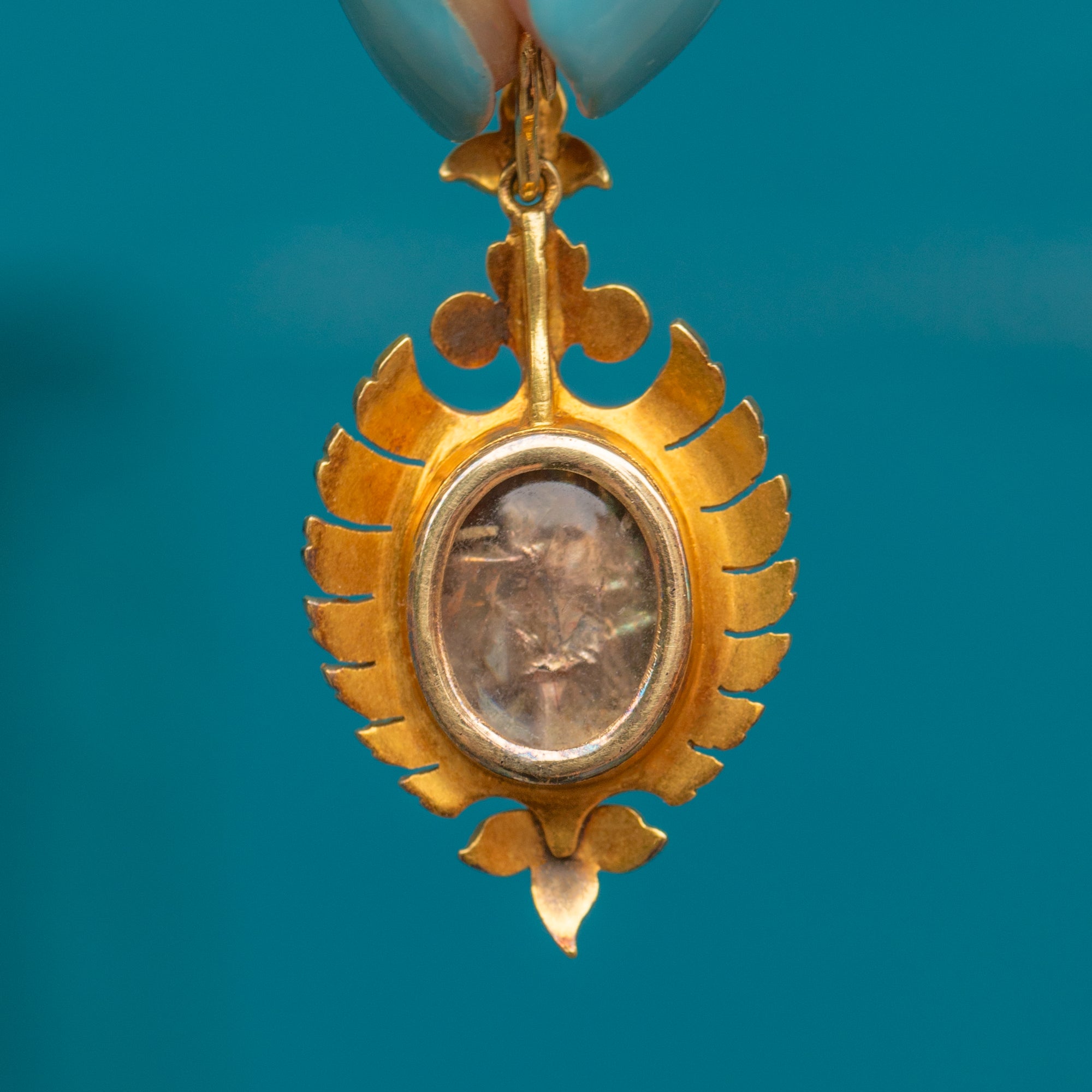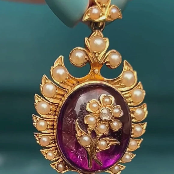 MATERIALS: Tests as 15ct Gold. (The metal inner frame of the locket provides strength and durability) 6.40ct Amethyst cabochon (foiled), Natural Pearls, Rose-cut Diamond.