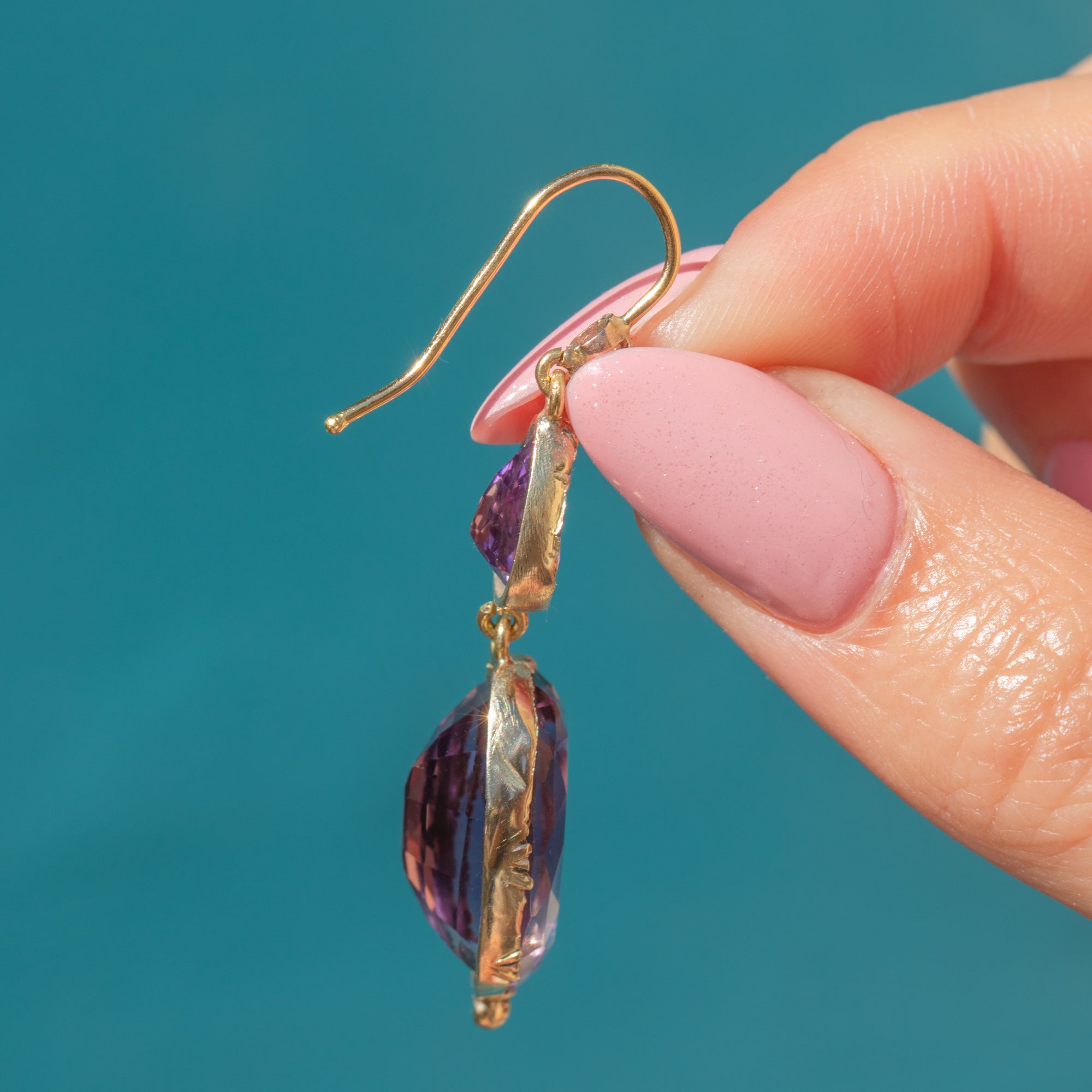 Antique 15ct Gold Amethyst Diamond Drop Earrings, 13.70ct