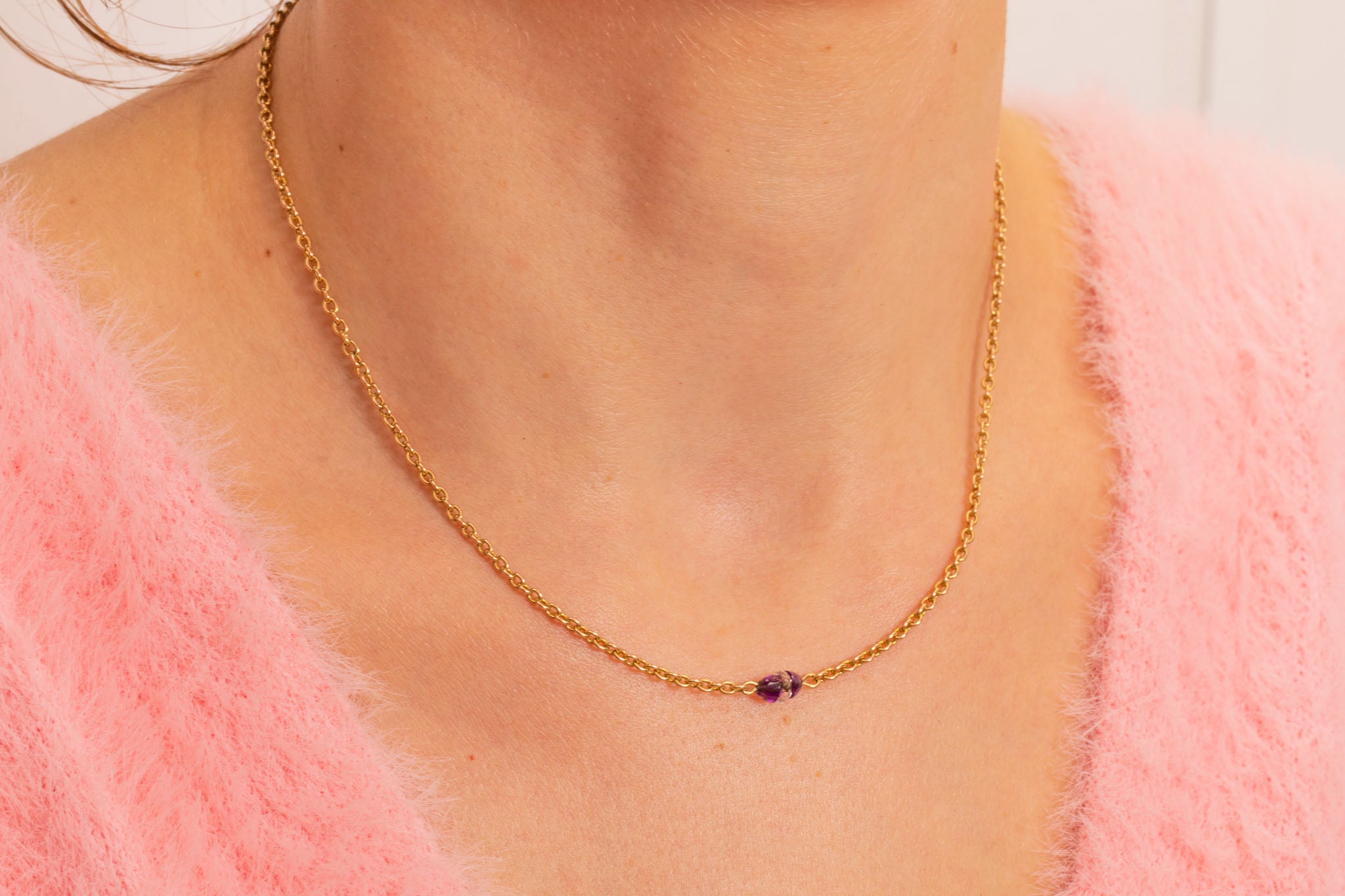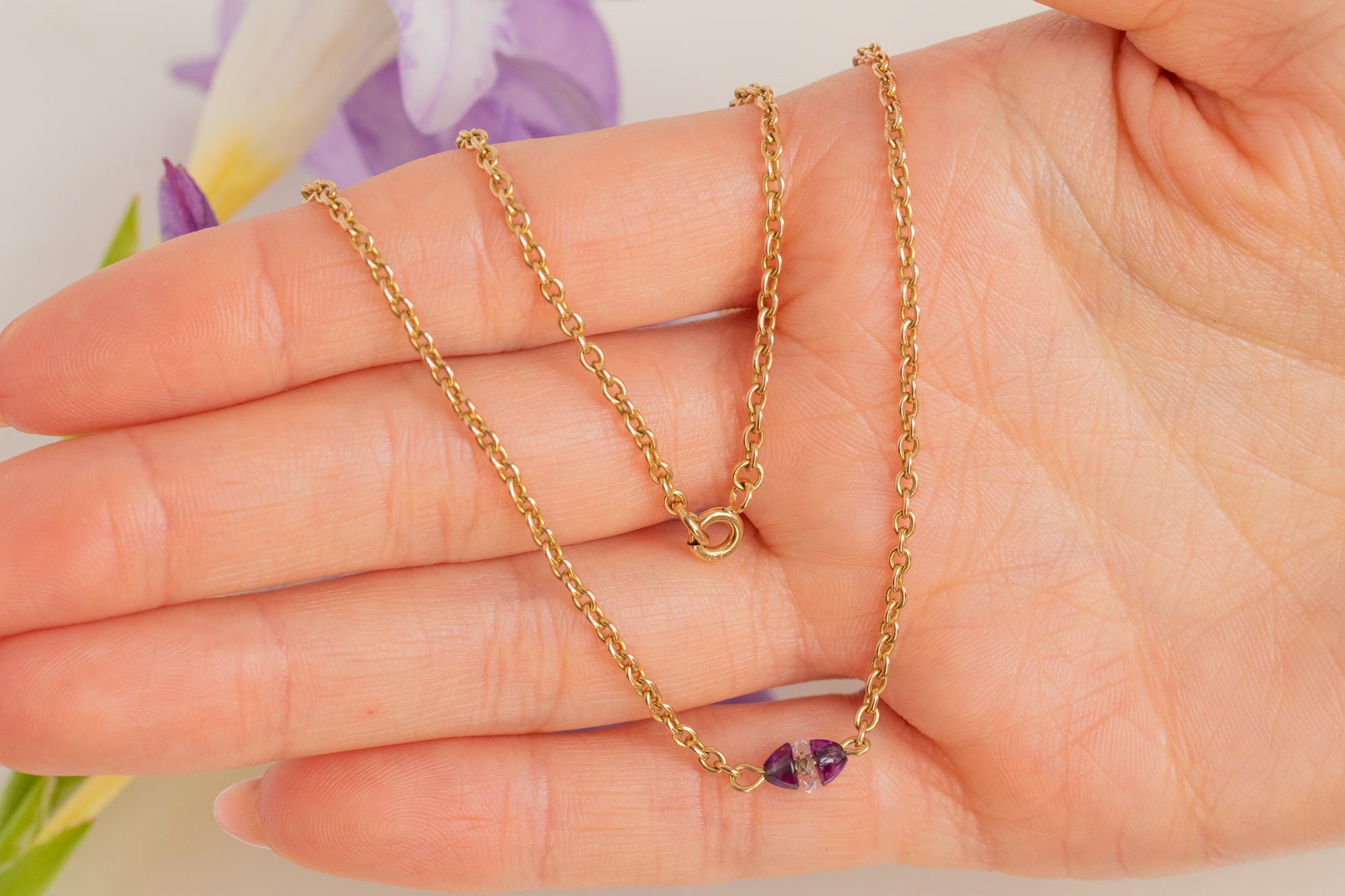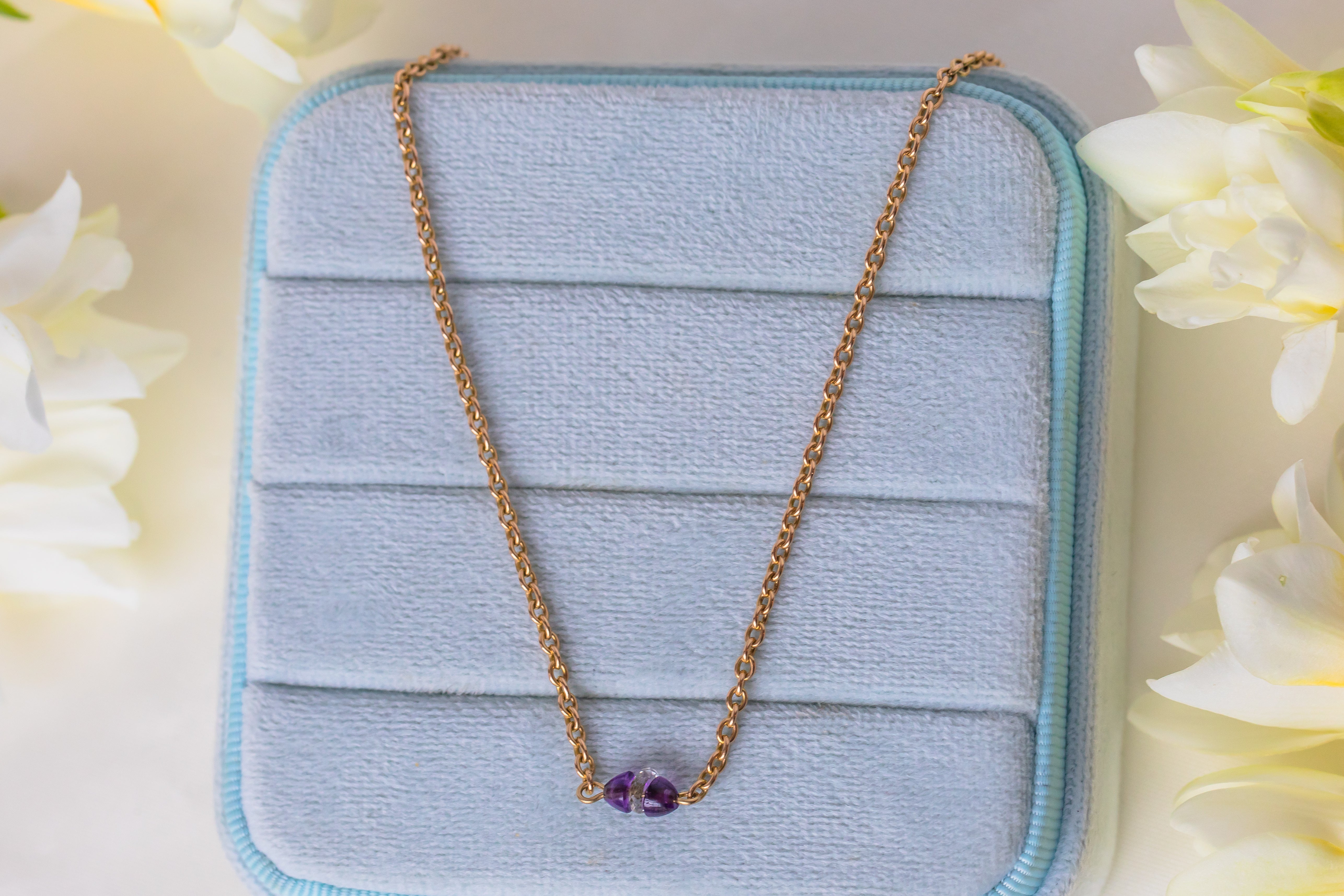 Her fine chain is crafted from saturated 15ct Gold, with her Rock Crystal Amethyst bead falling beautifully between your collarbones. The perfect pop of colour for your summer outfits, this Victorian Amethyst necklace is sure to make you stand out from the crowd!