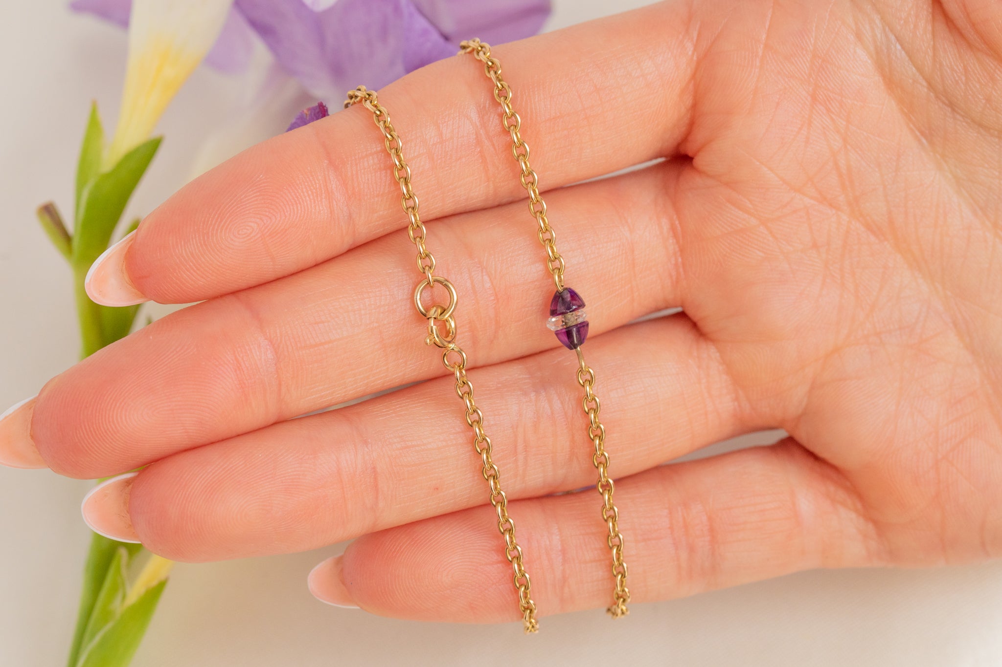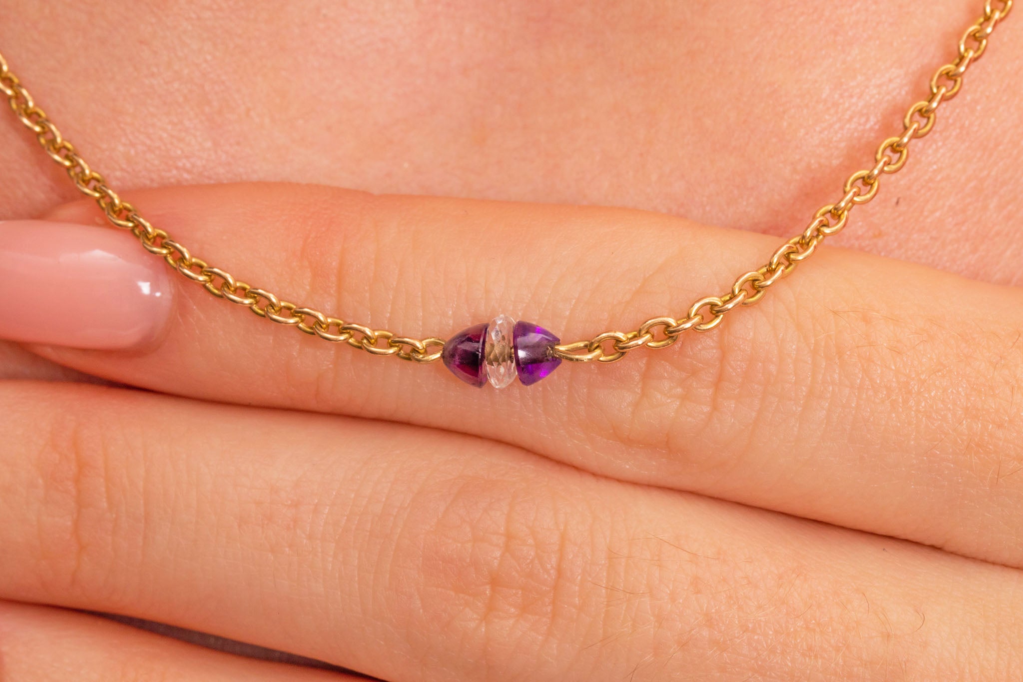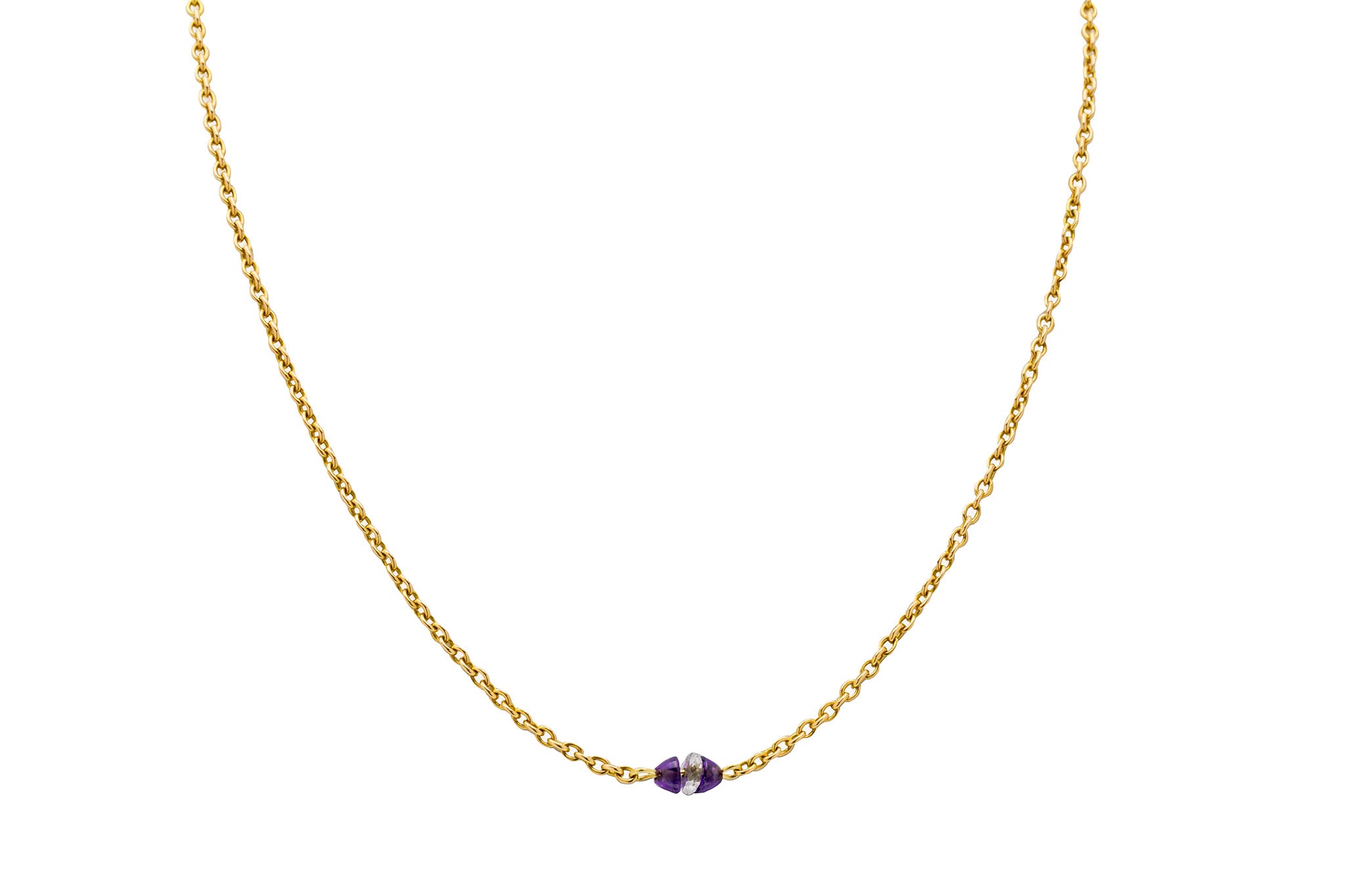 Her fine chain is crafted from saturated 15ct Gold, with her Rock Crystal Amethyst bead falling beautifully between your collarbones. The perfect pop of colour for your summer outfits, this Victorian Amethyst necklace is sure to make you stand out from the crowd!