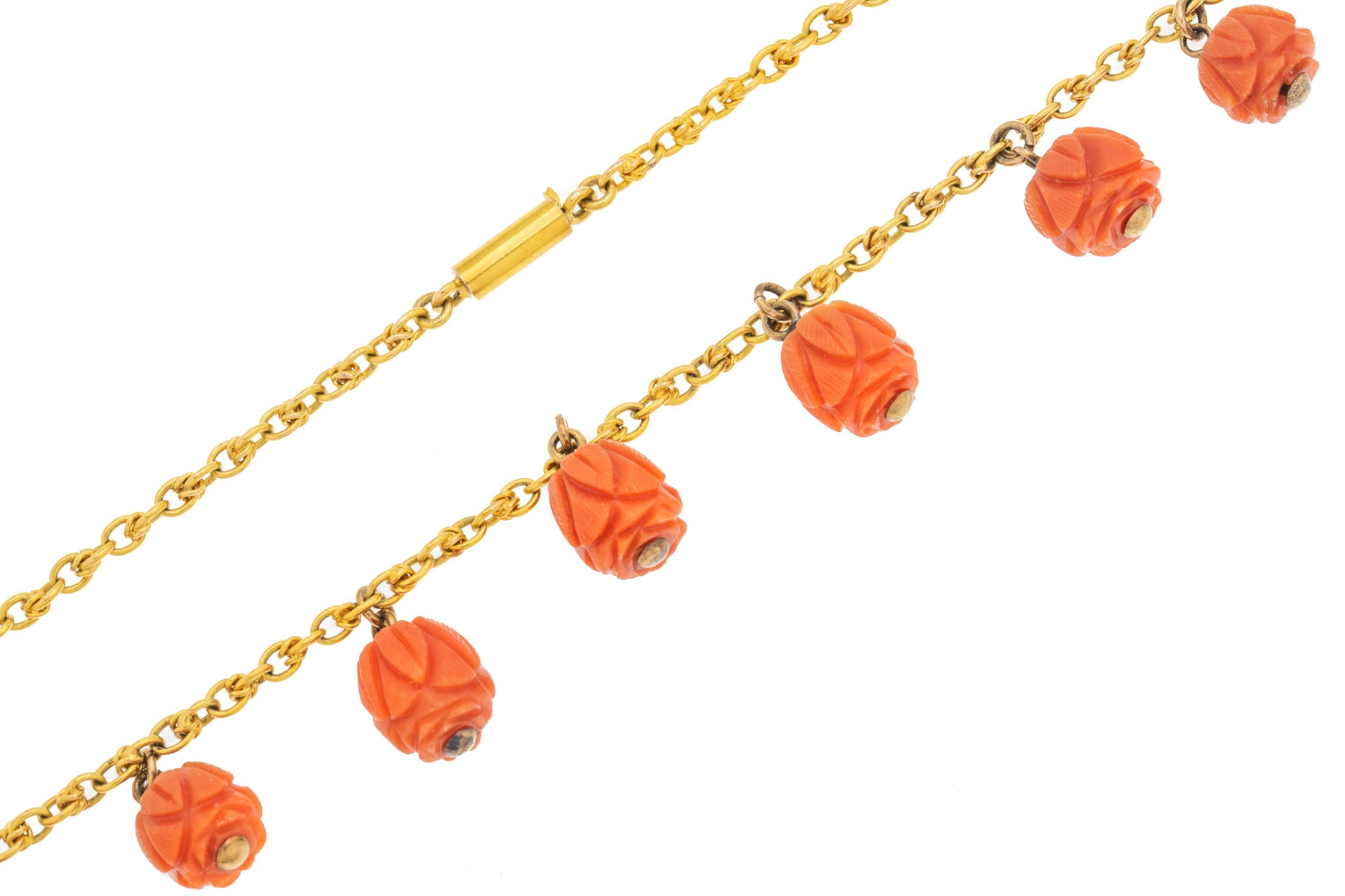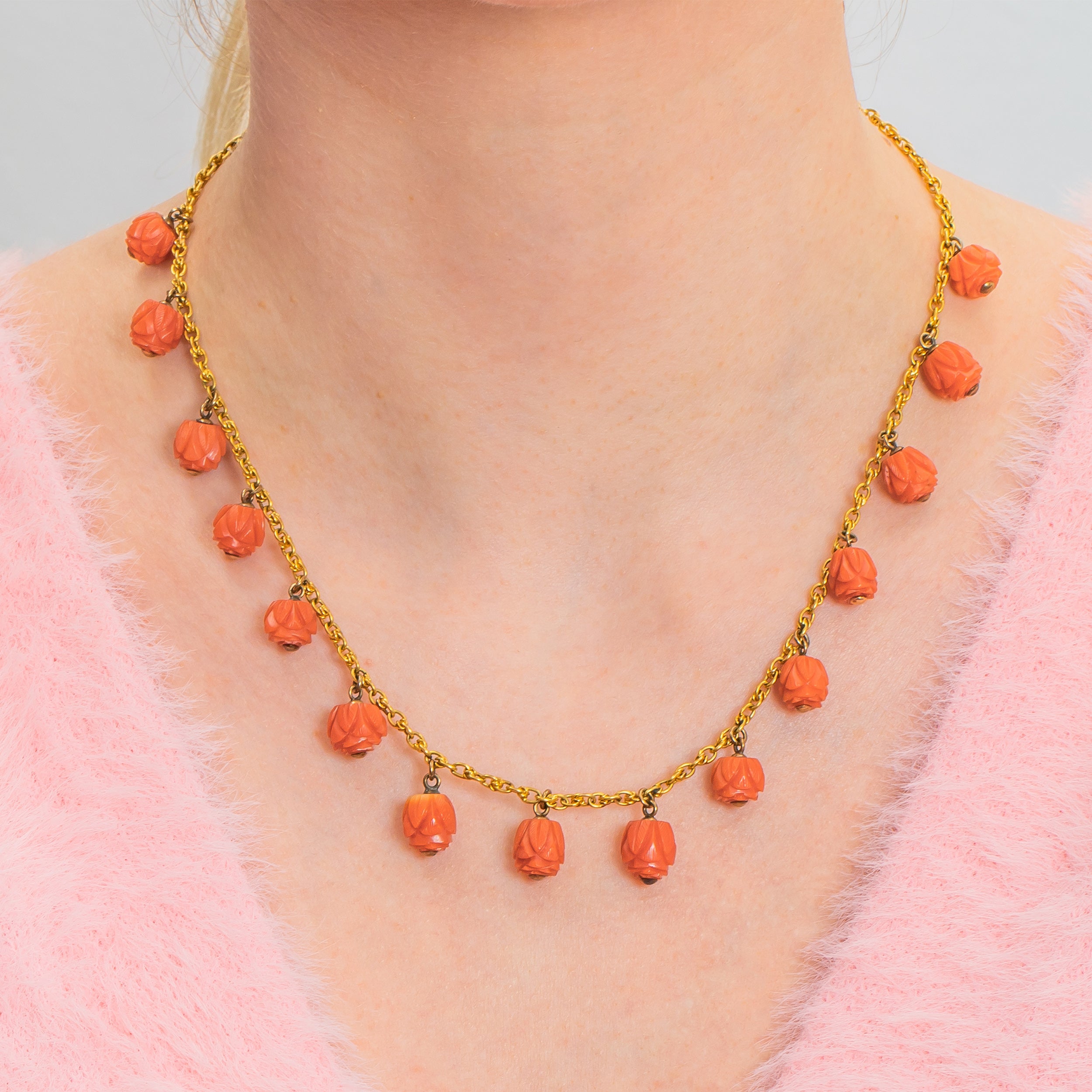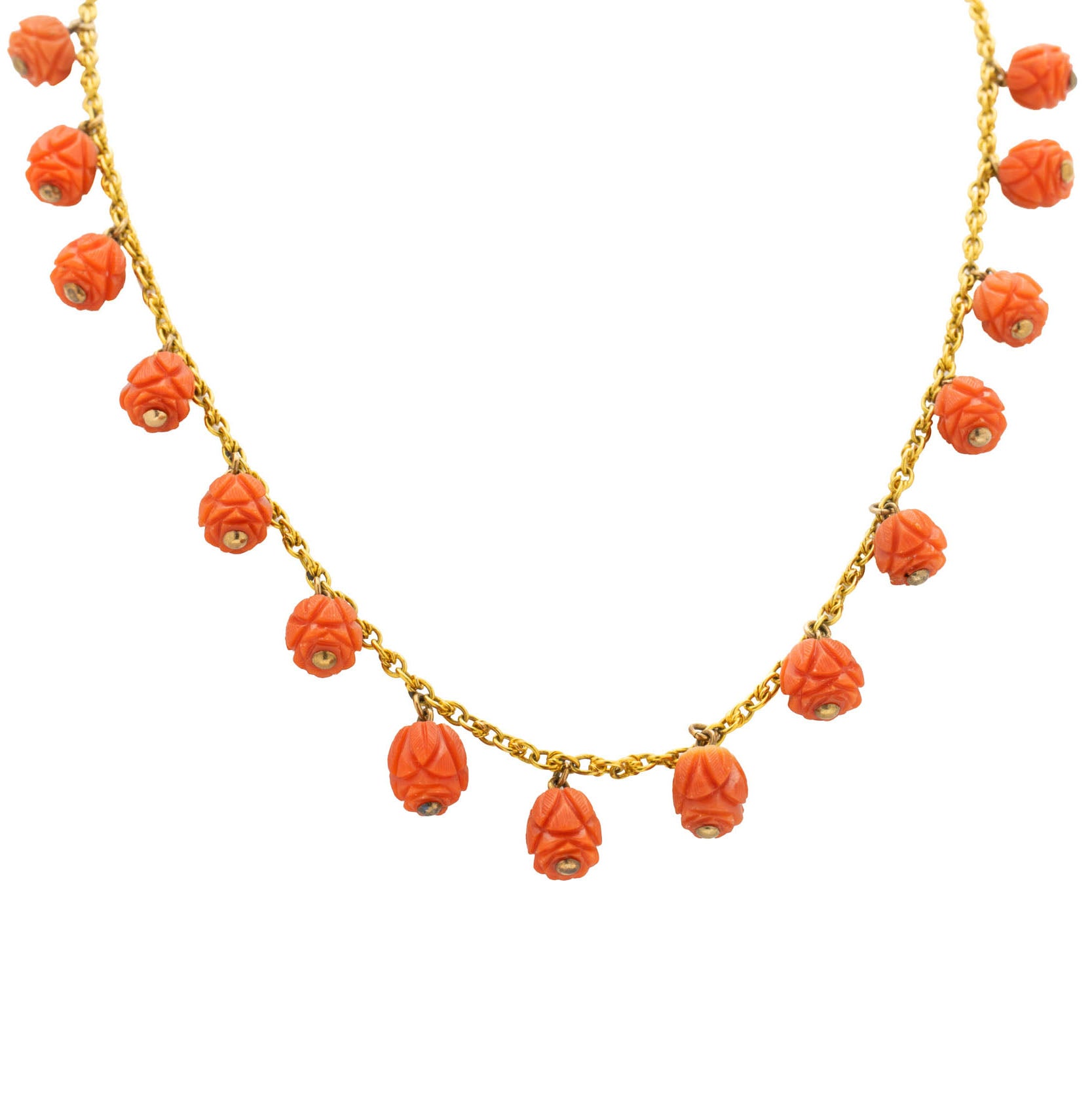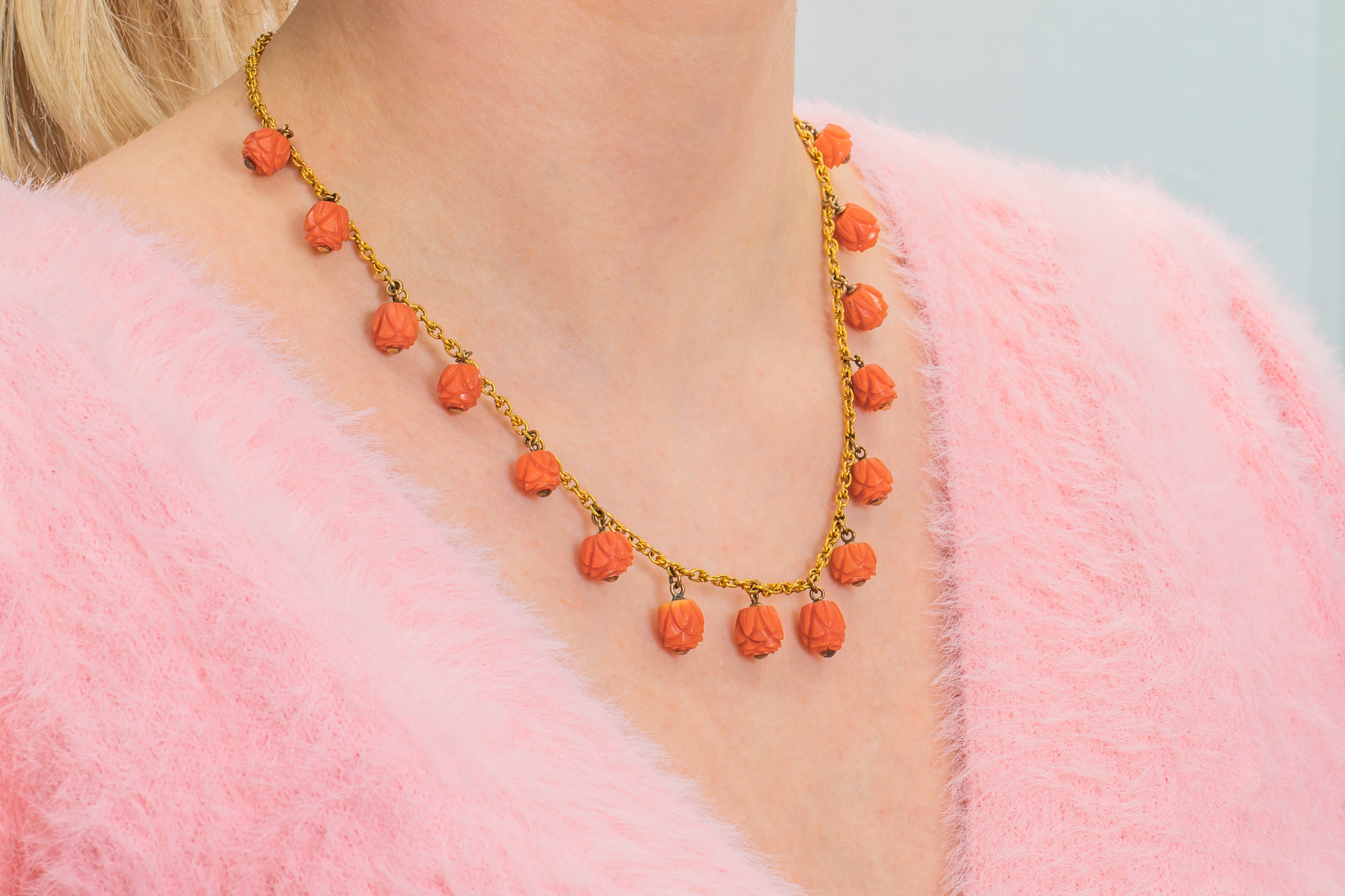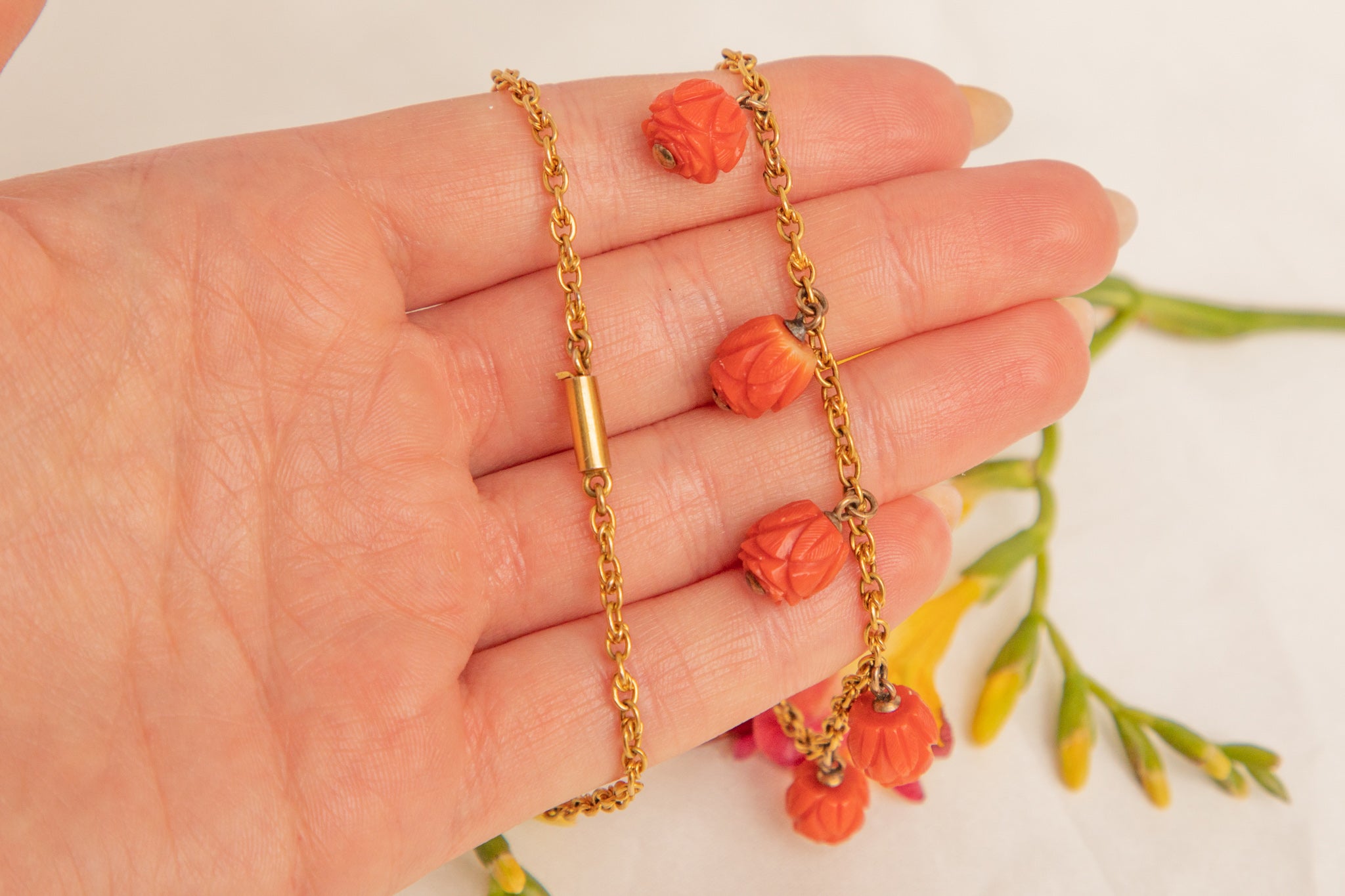 We are super excited to introduce you to this spectacular antique 15ct Gold Coral necklace! Fifteen stunning hand-carved Coral beads drop delicately below the buttercup 15ct Gold chain to which they are attached, falling ever so elegantly across the collarbones!