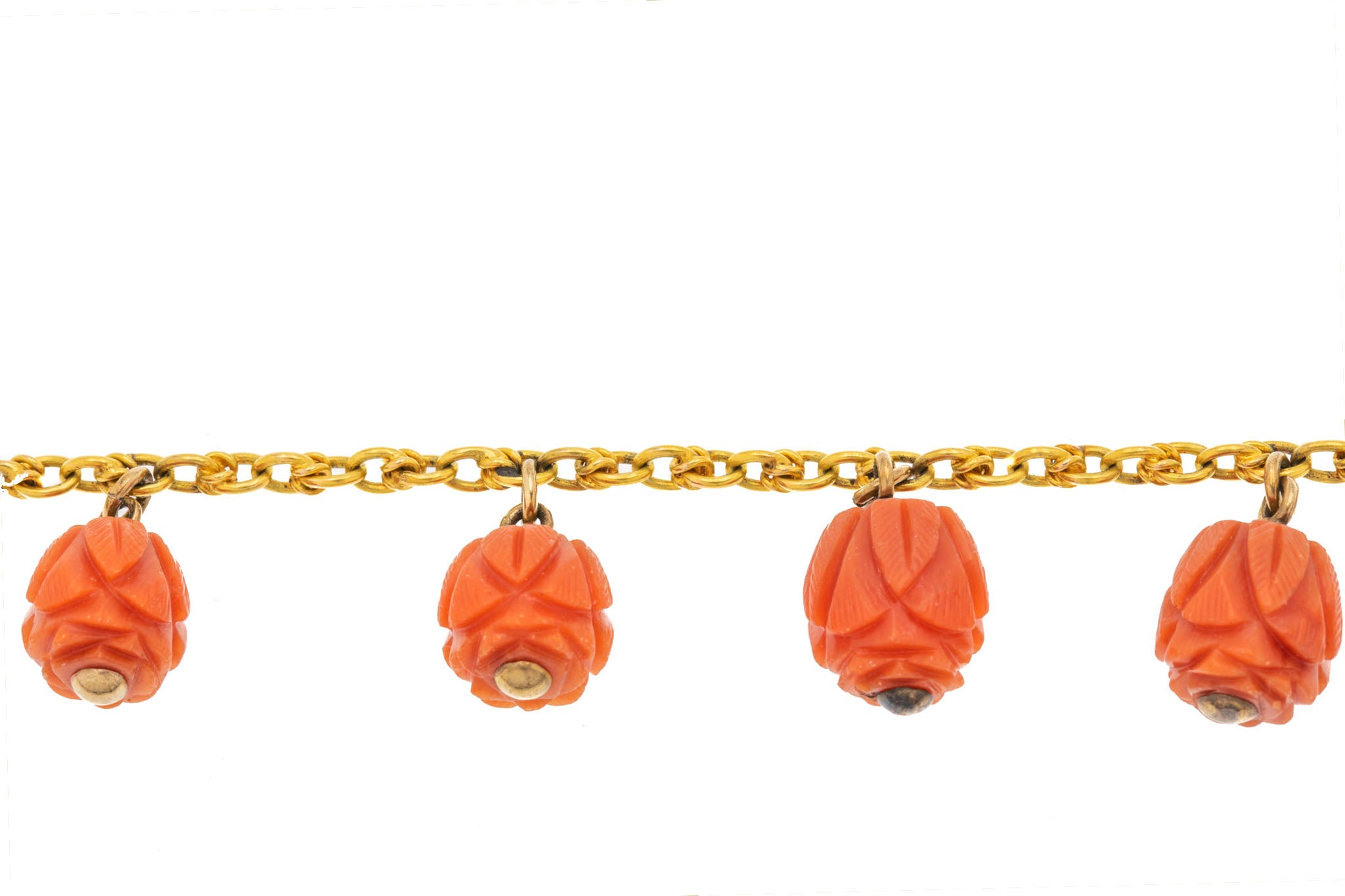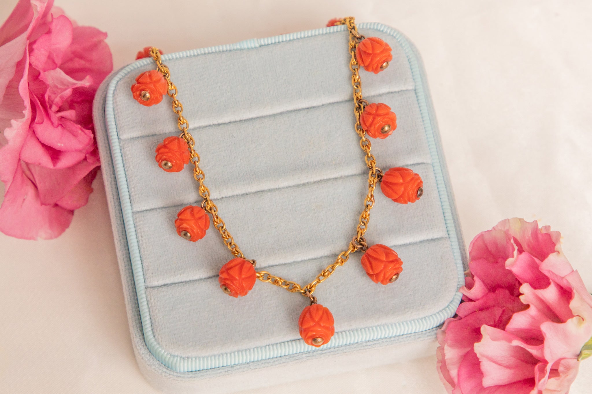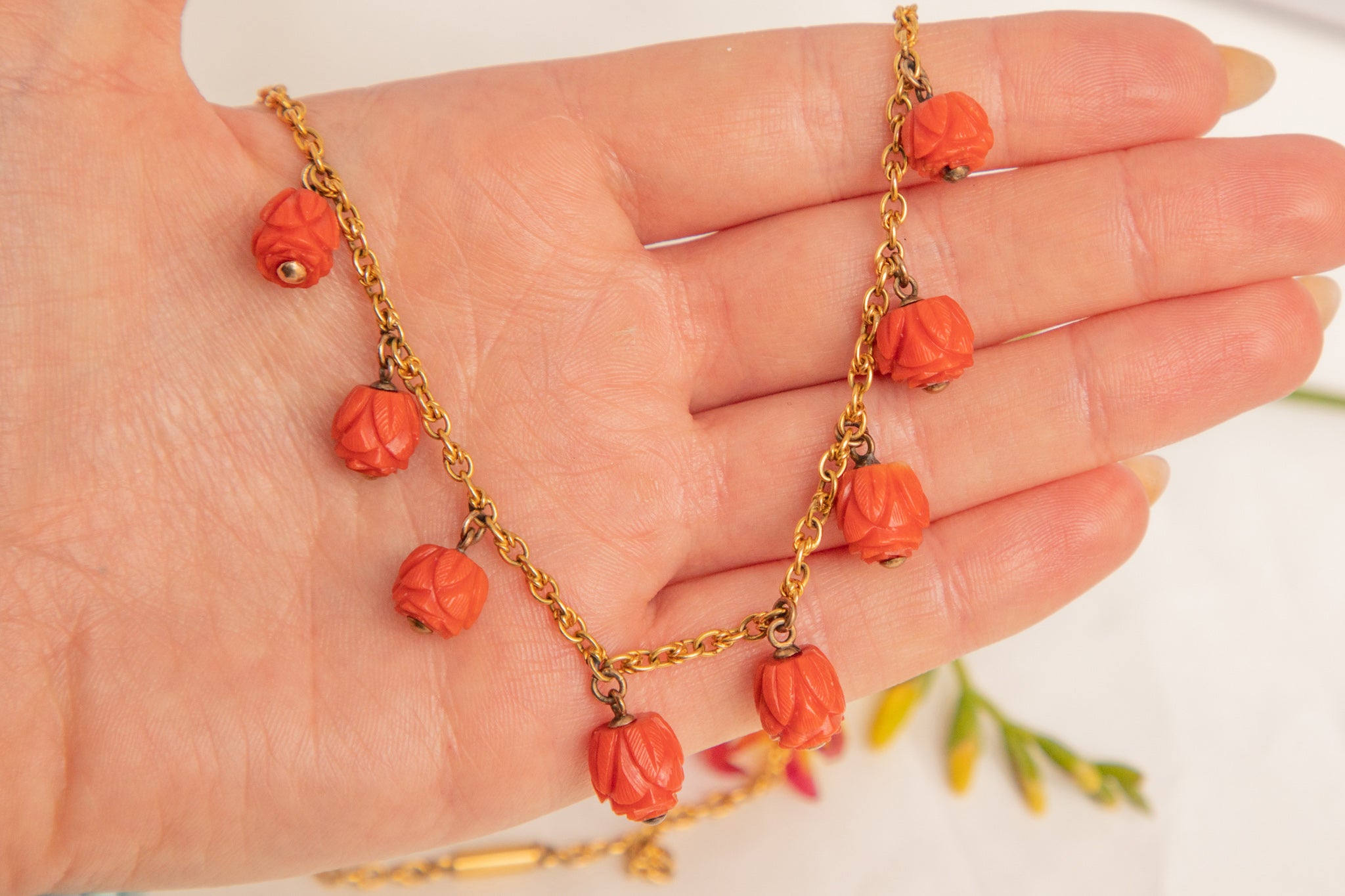 EXCELLENT: This antique 15ct Gold Coral necklace is in excellent condition. The Gold is bright and all the links are well connected, with the barrel clasp in perfect working order. Each hand-carved Coral bead is securely connected to a 15ct Gold bar. They are without any nibbles or fleabites which is incredible for their grand age. This antique necklace is definitely a statement beauty that craves to be worn straight out of the box!
