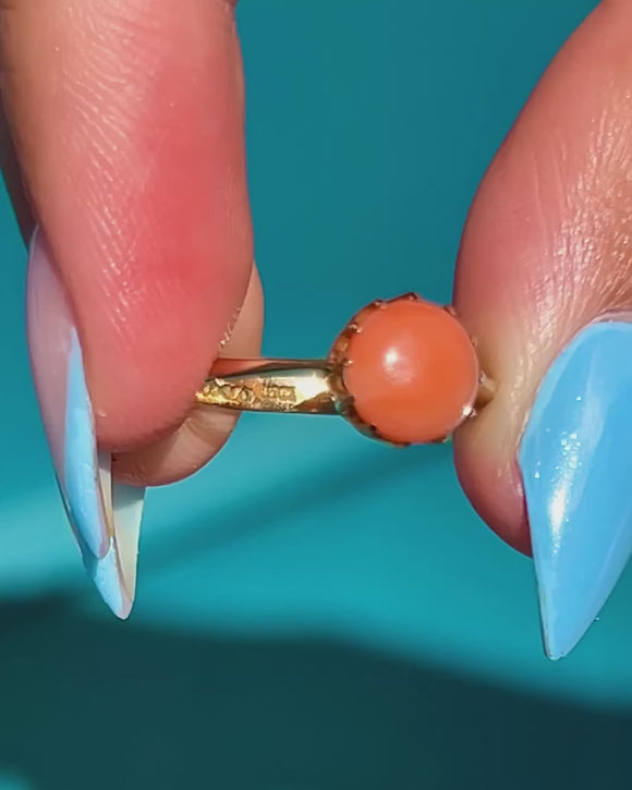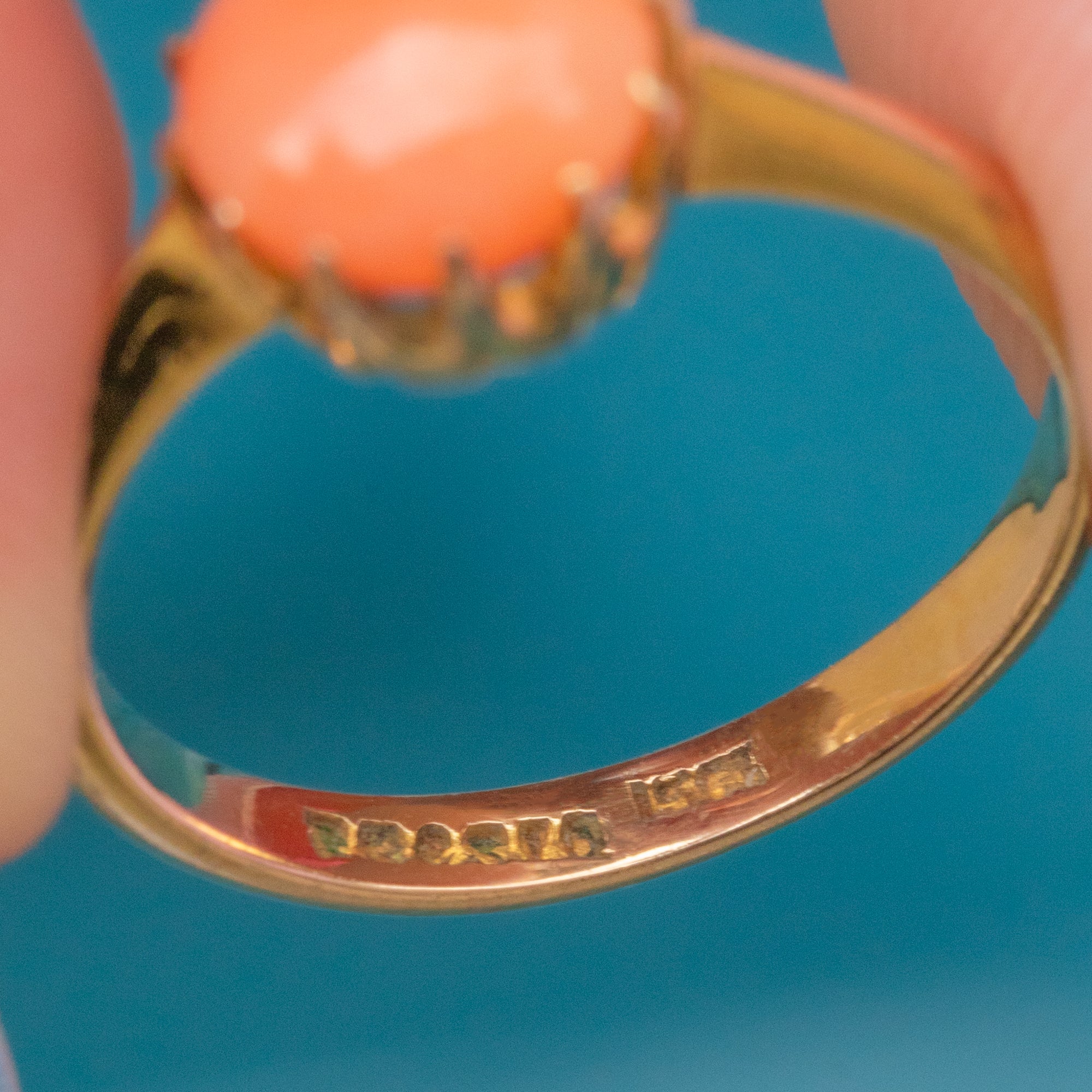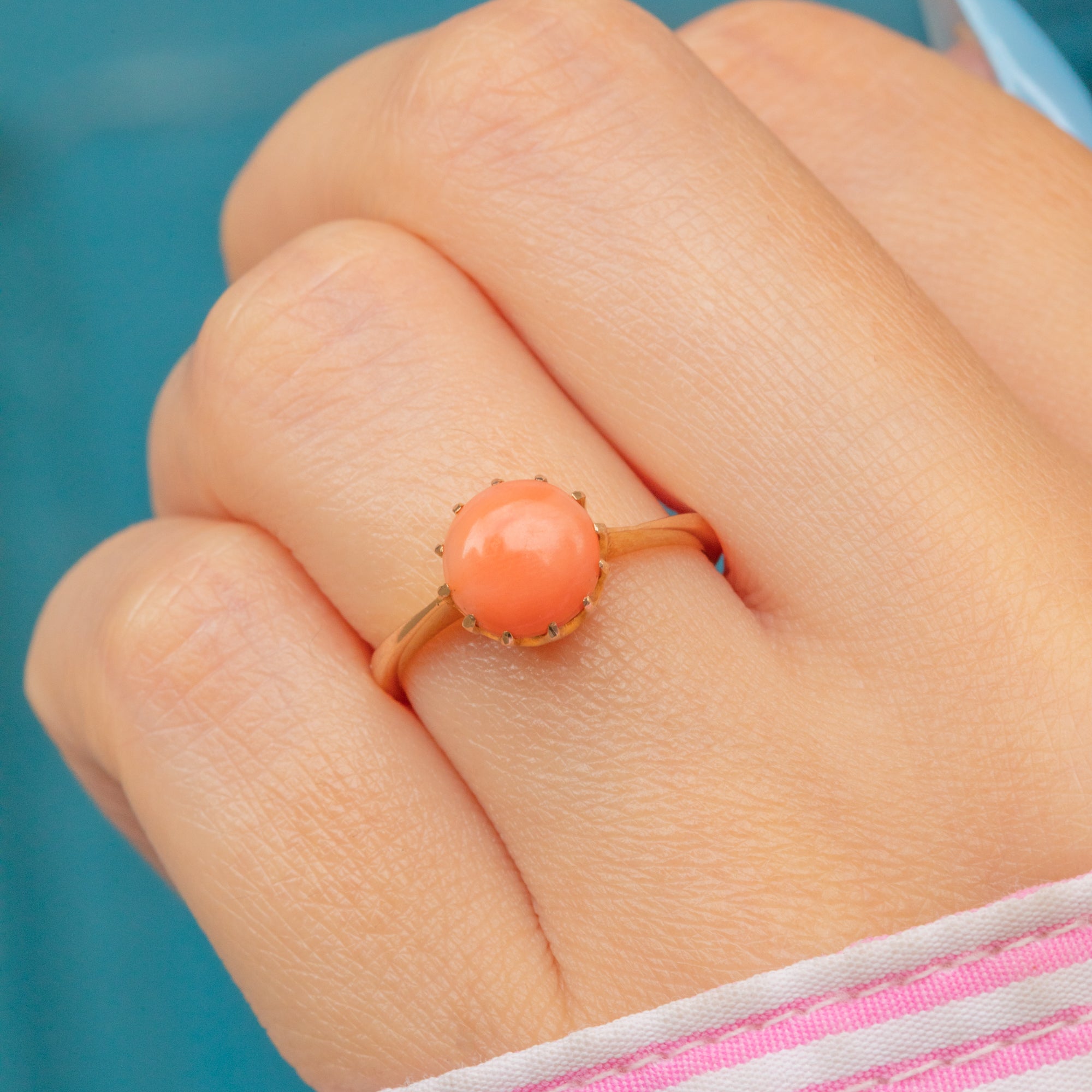 A smooth peachy Coral cabochon sits beautifully at the centre of this antique ring, set securely within glossy 15ct Gold claws for a luxurious finish.