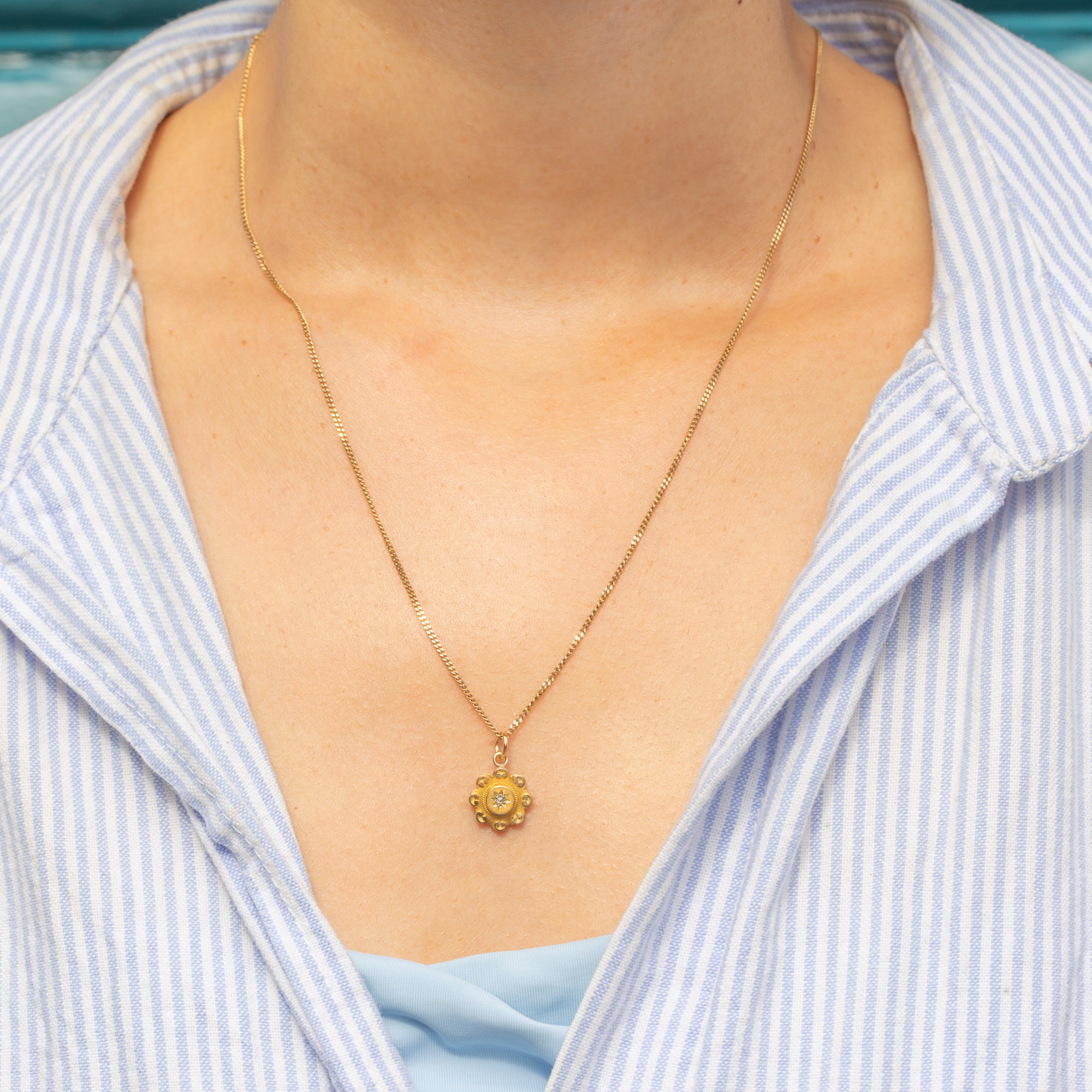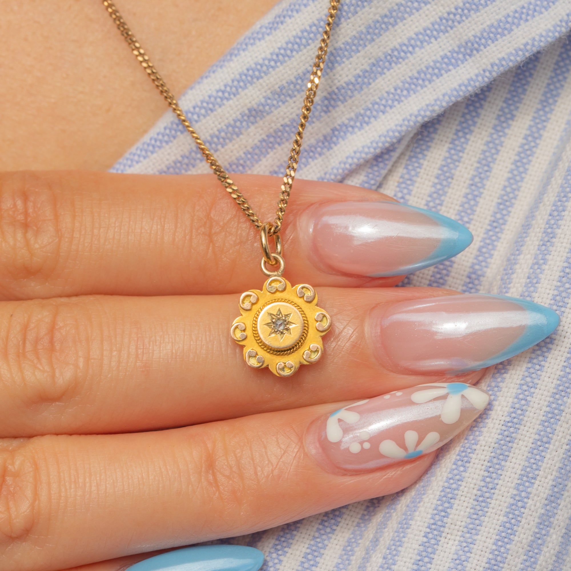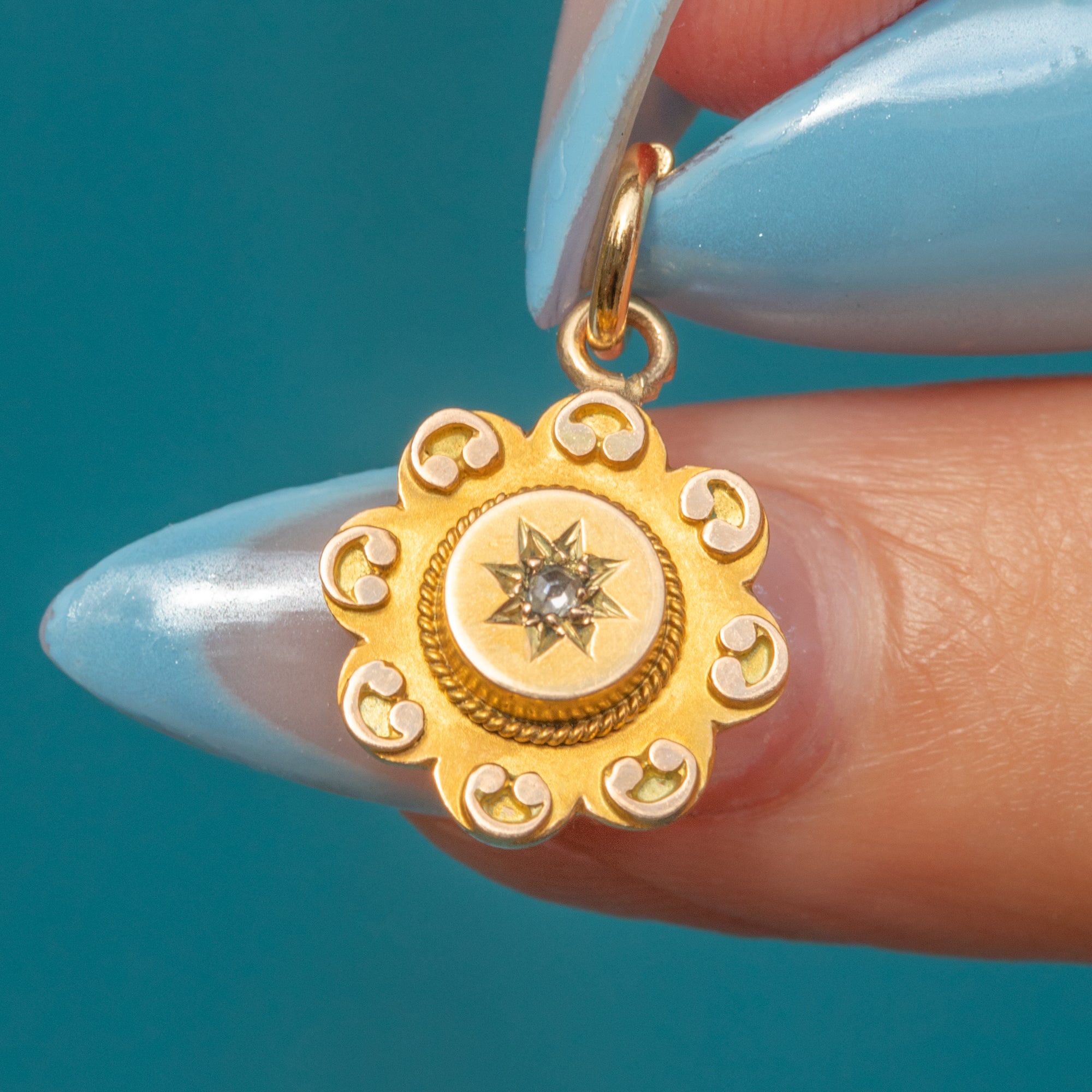 Nestled in its centre is a scintillating star-set Diamond, effortlessly complemented by the surrounding Etruscan-style details. Petite yet decadent, this Victorian charm will make a whimsical addition to your neck stack or bracelet.