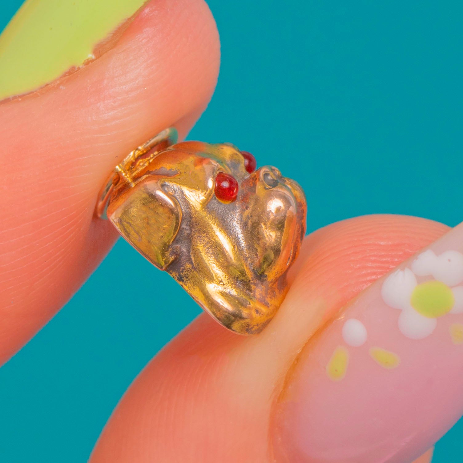 A charming Victorian English Bulldog head rendered in luscious 15ct Gold, modelled in the round with beautifully defined wrinkles and muzzle. Two tiny red Paste cabochon eyes animate the expression, their subtle glow a playful contrast to the buttery Gold.