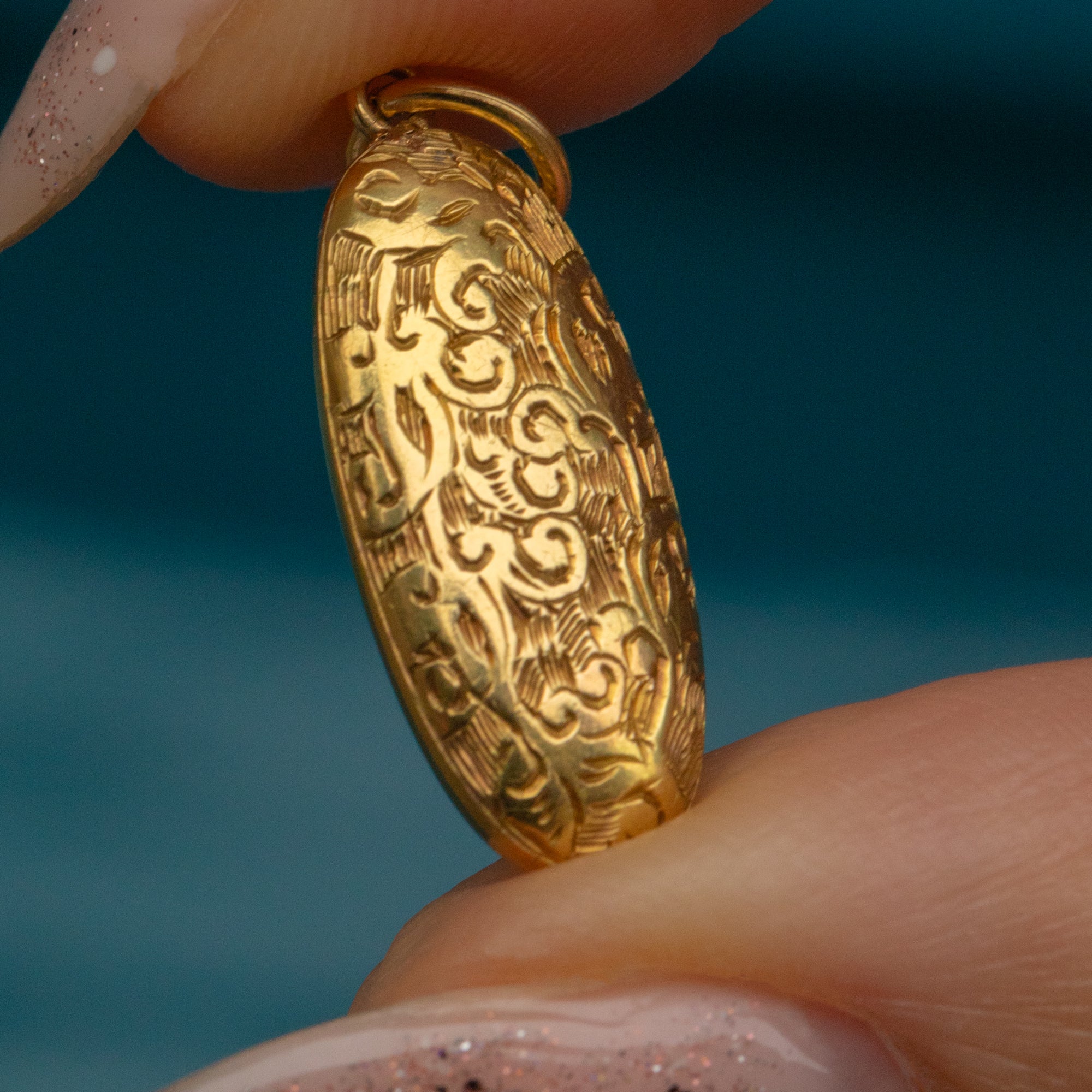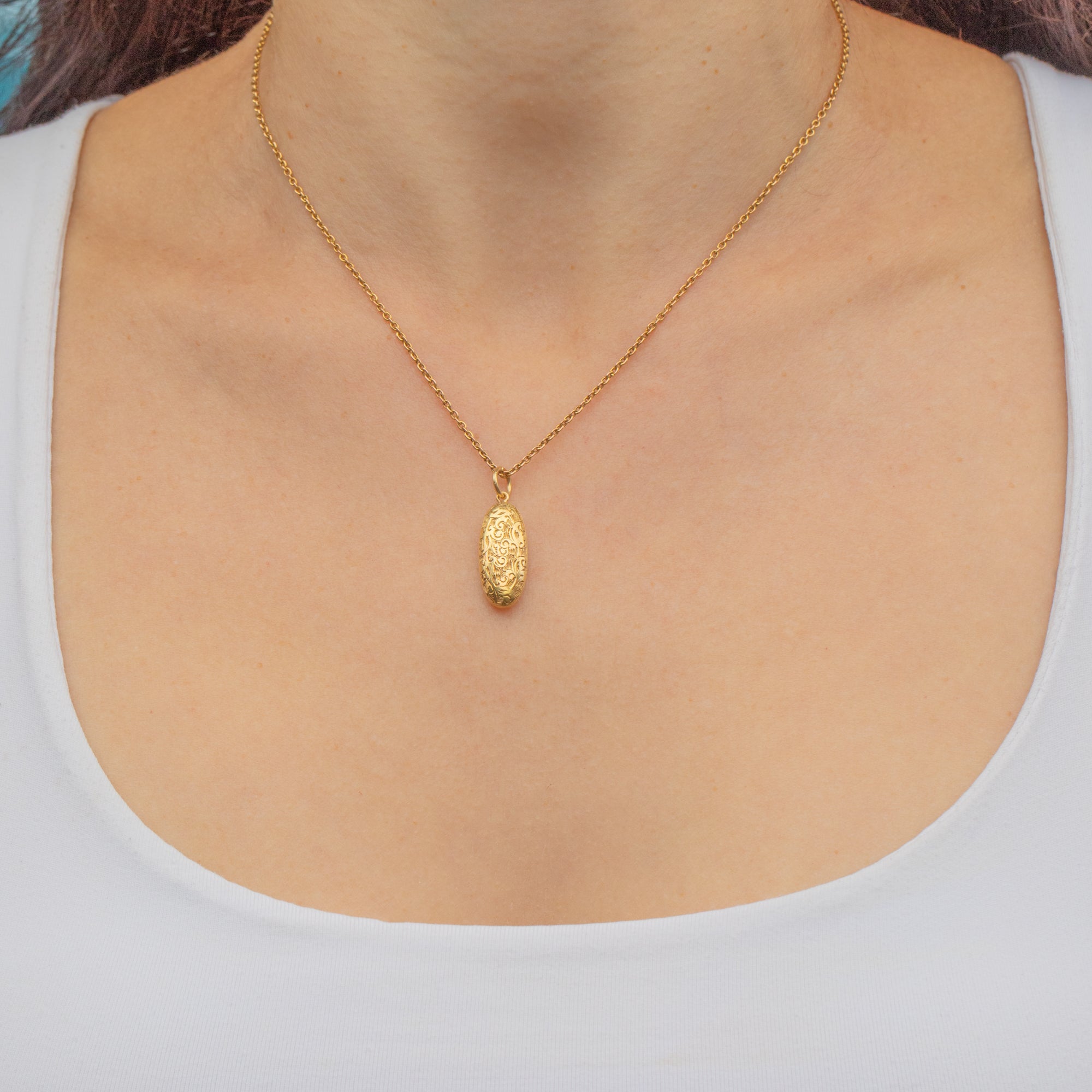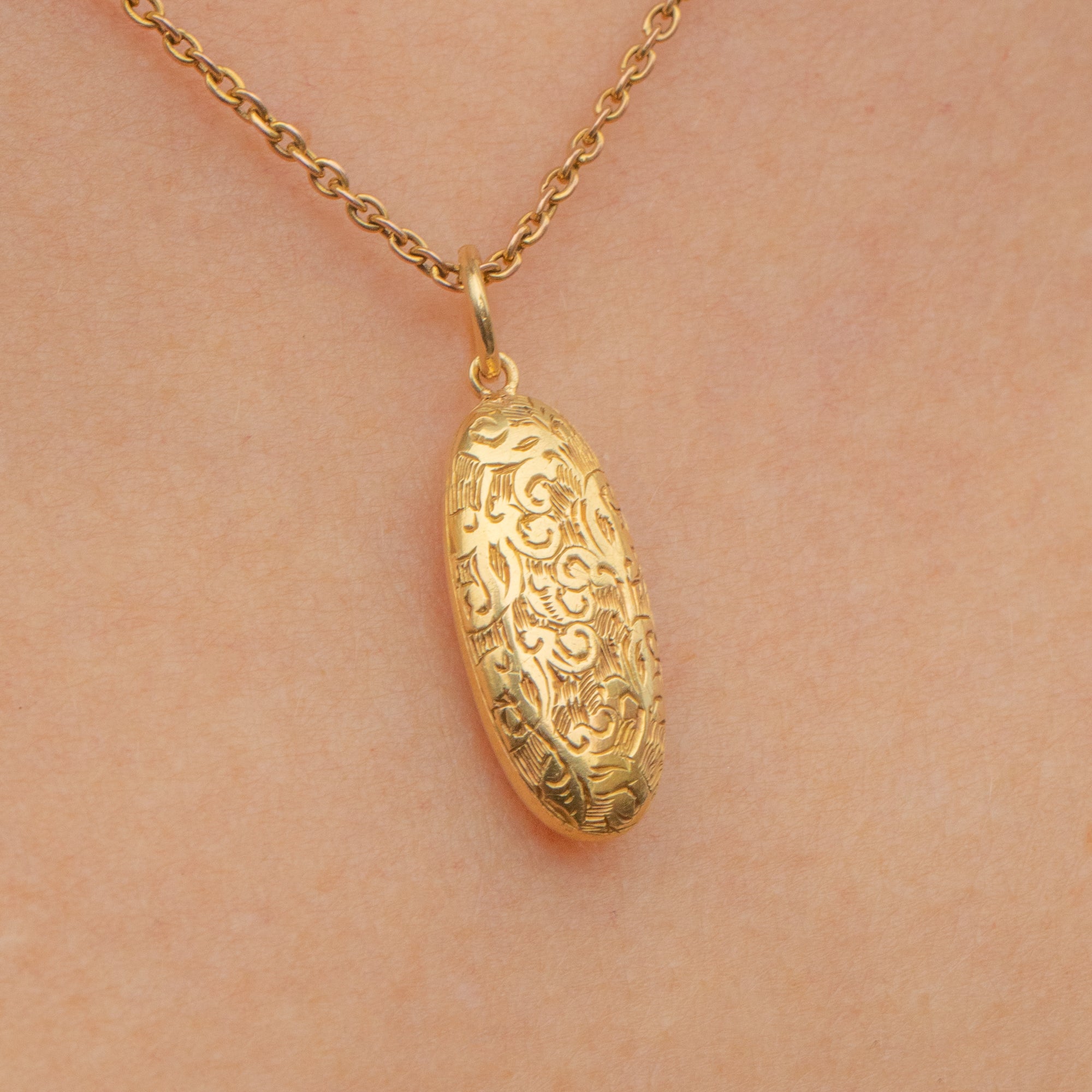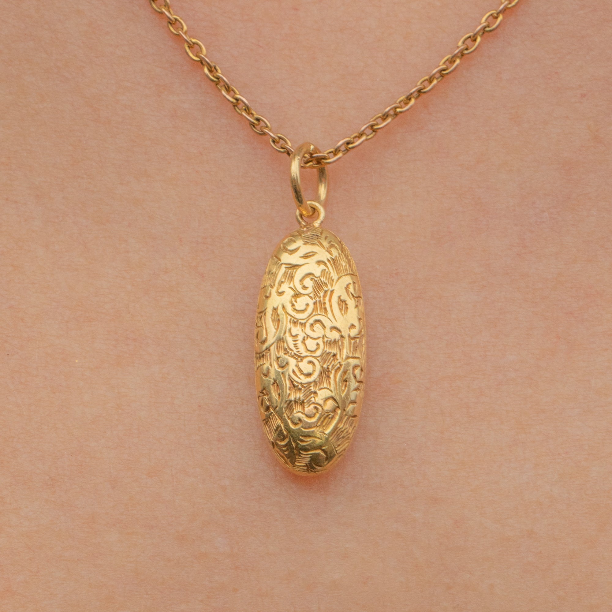 The front of this Edwardian pendant is inlaid with acanthus leaf engravings, a motif often featured within antique jewellery. Crafted entirely from buttery 15ct Gold, the light shines effortlessly across her glossy surface!