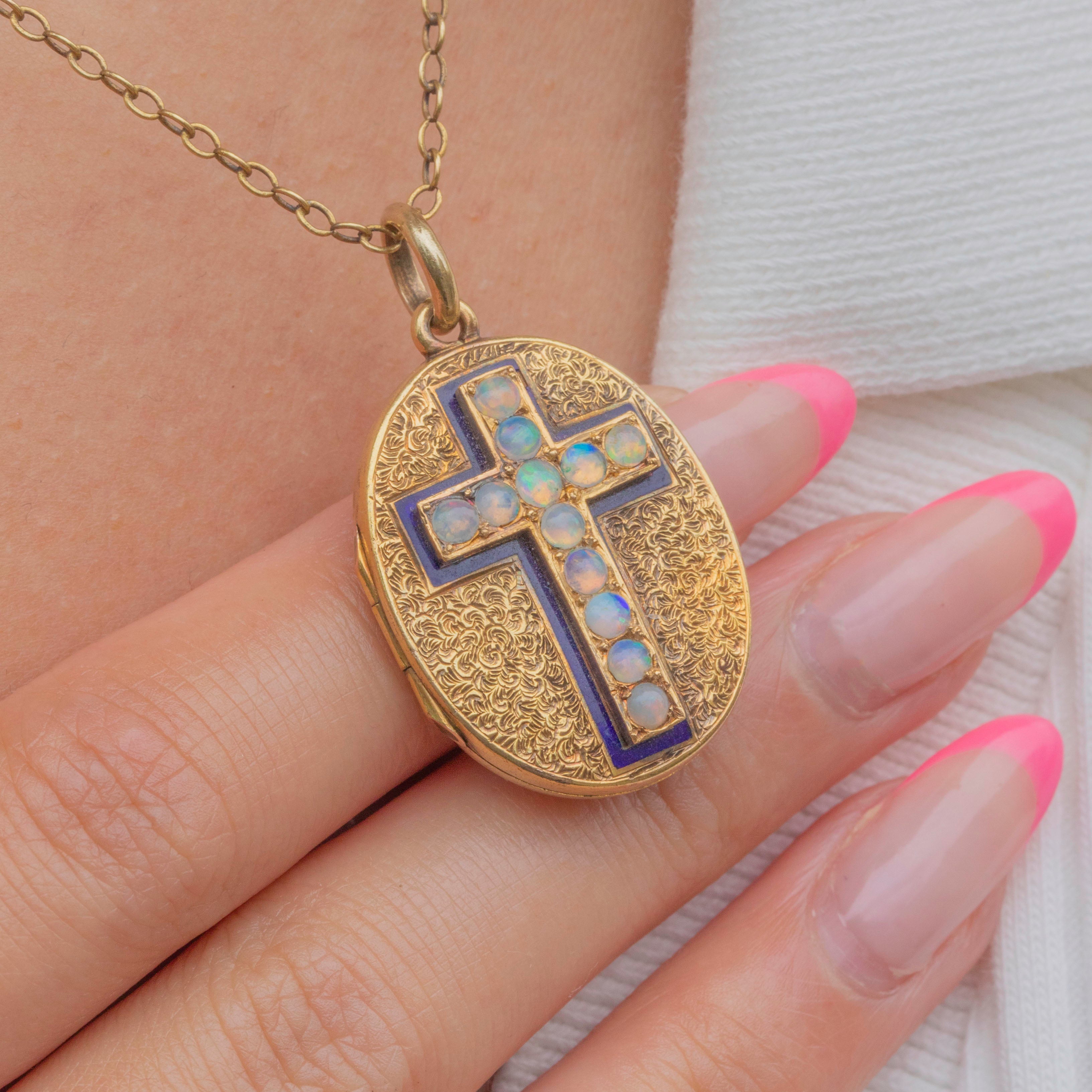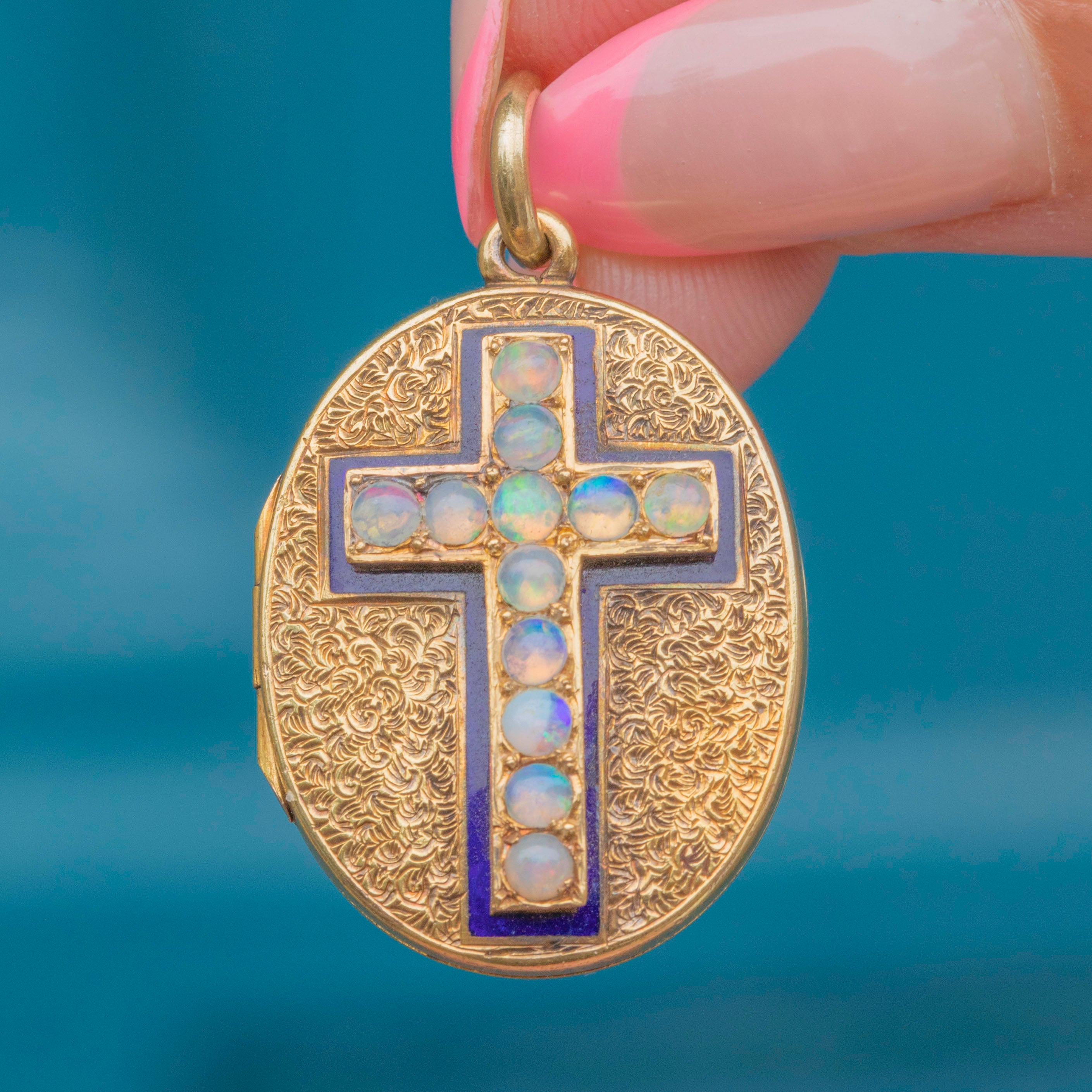 The locket is crafted from solid 15ct Gold and boasts intricately engraved details that span across both sides. The impressive cross, formed of lively Opals, makes a striking focal point for the front of the locket, their ethereal, shimmering hues enhanced by a bold line of royal blue Enamel.