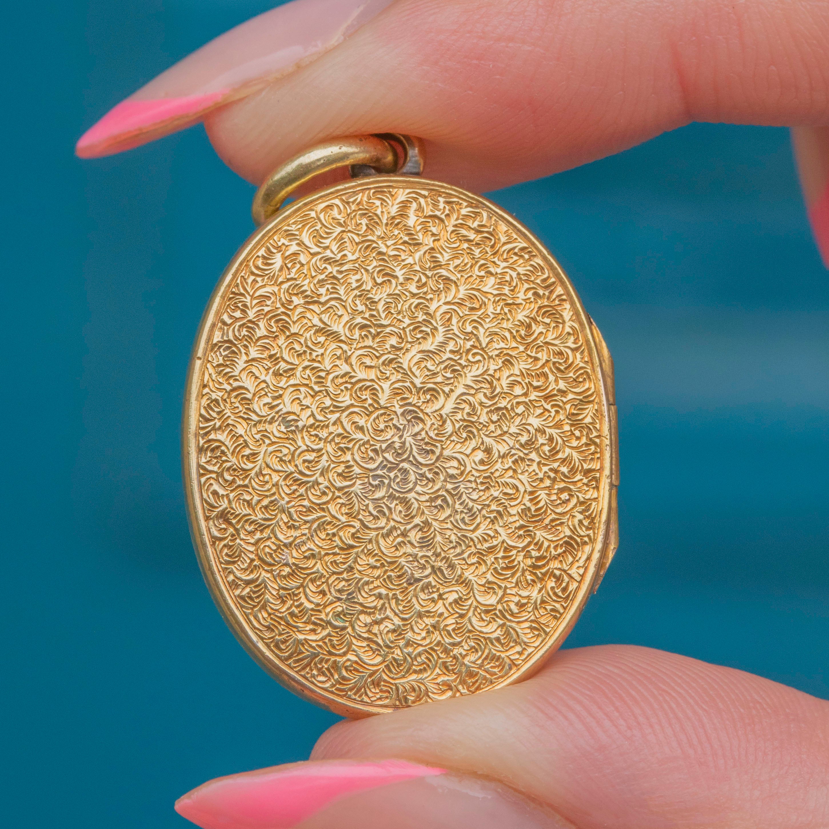 VERY GOOD-EXCELLENT: This antique 15ct Gold engraved Opal Enamel cross locket is in wonderful condition. The Gold has an even saturation throughout and the engraved details remain defined, providing the locket with a lovely texture. The Opals are securely set, with no visible surface wear, and the Enamel has lasted remarkably well given the age of the piece, with only mild wear around the outside edge. The locket is functional; the frame needs to be pried open from the bottom, and once in, your chosen photograph will be held securely. Complete with a large jump ring, you can suspend this antique Gold locket from a chain of your choice with ease!