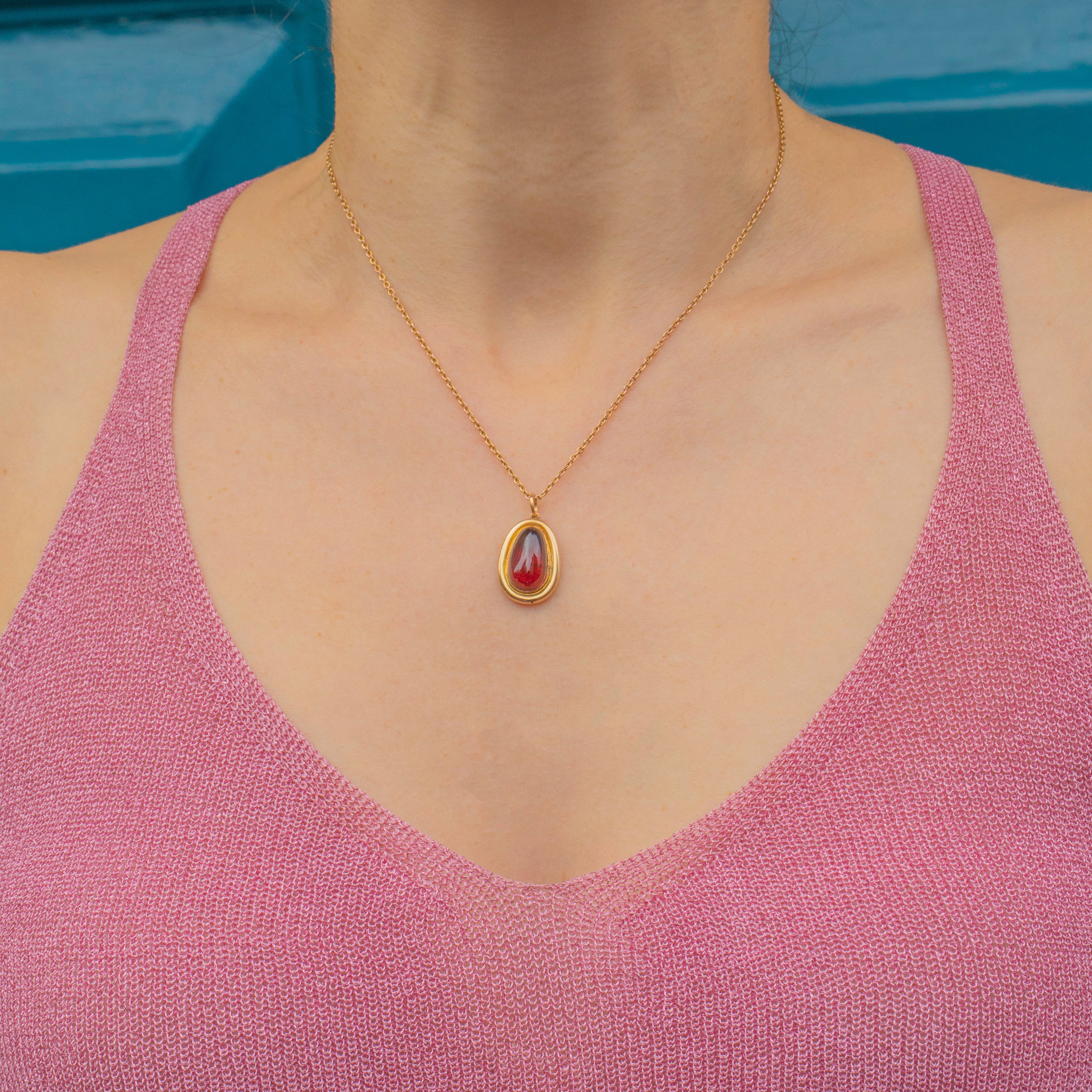 Her 3.62ct Garnet is wrapped up in sumptuous 15ct Gold, revealing hints of scarlet as she catches the light. Suspended from a fine chain, this Garnet cabochon pendant is the perfect piece as we head into autumn.