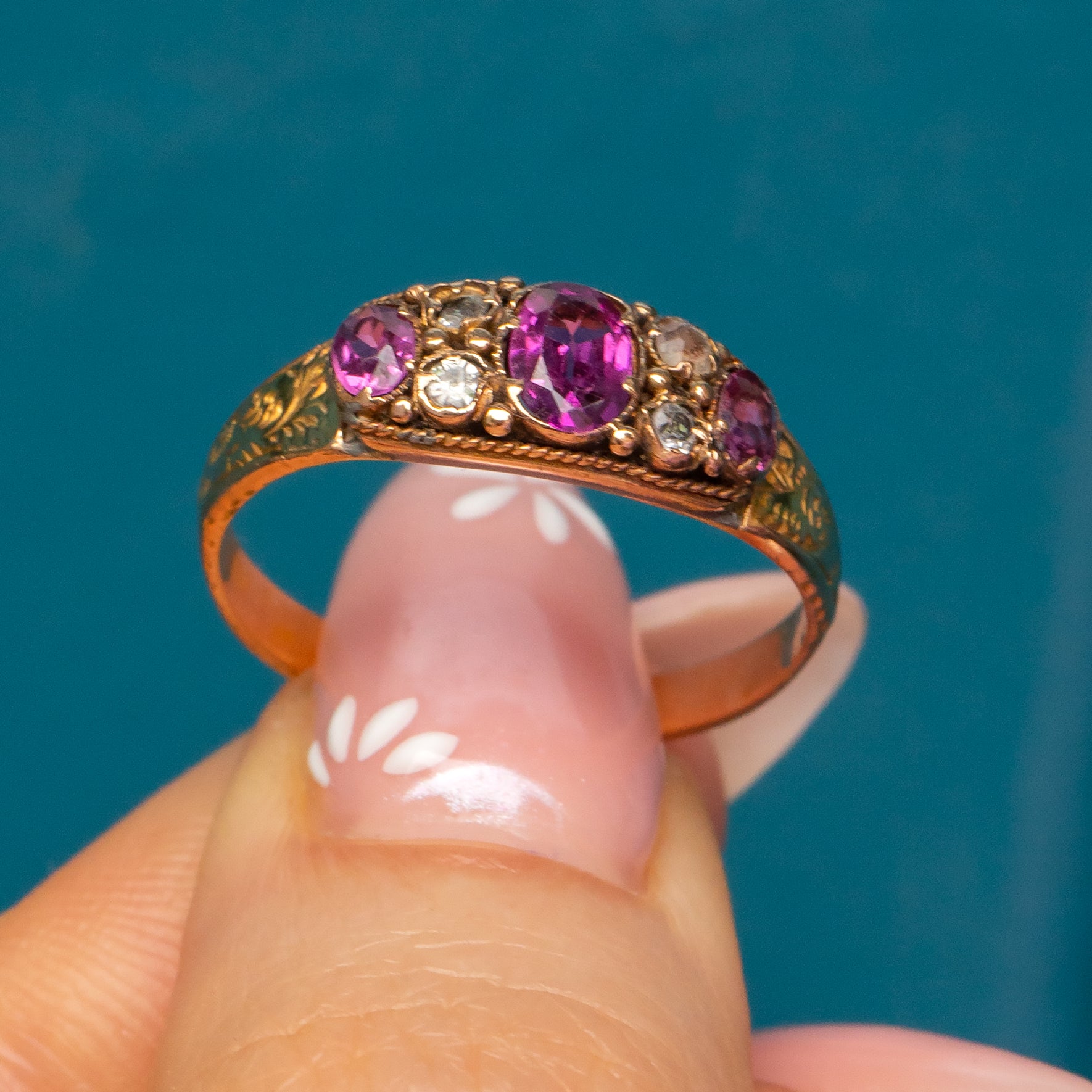 Add a touch of Victorian elegance to your ring stack with this tantalizing antique 15ct Gold Garnet three stone ring! Crafted from solid 15ct Gold, this Victorian ring has a delectable display of gemstones framed by decorative engraved shoulders adding a feminine allure.