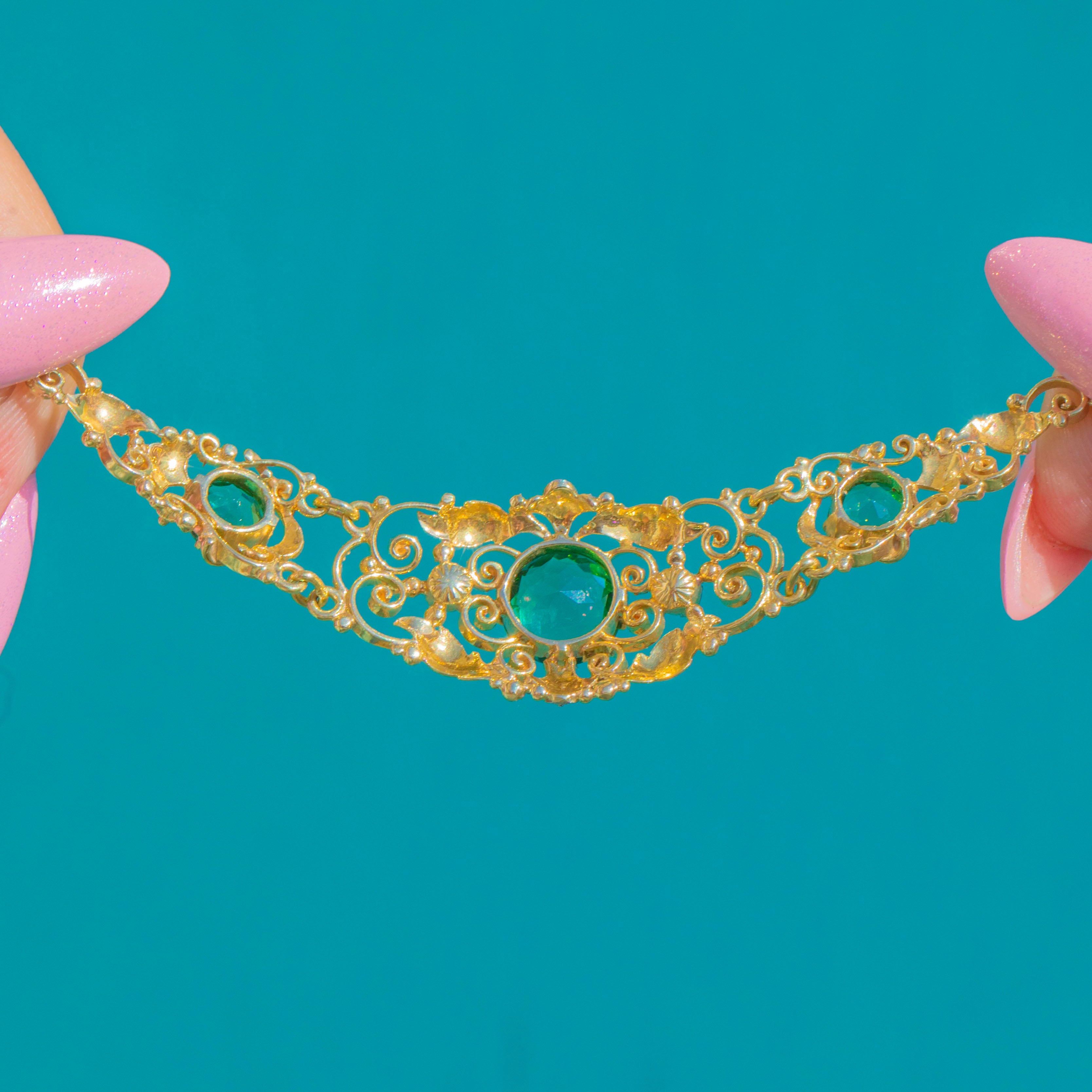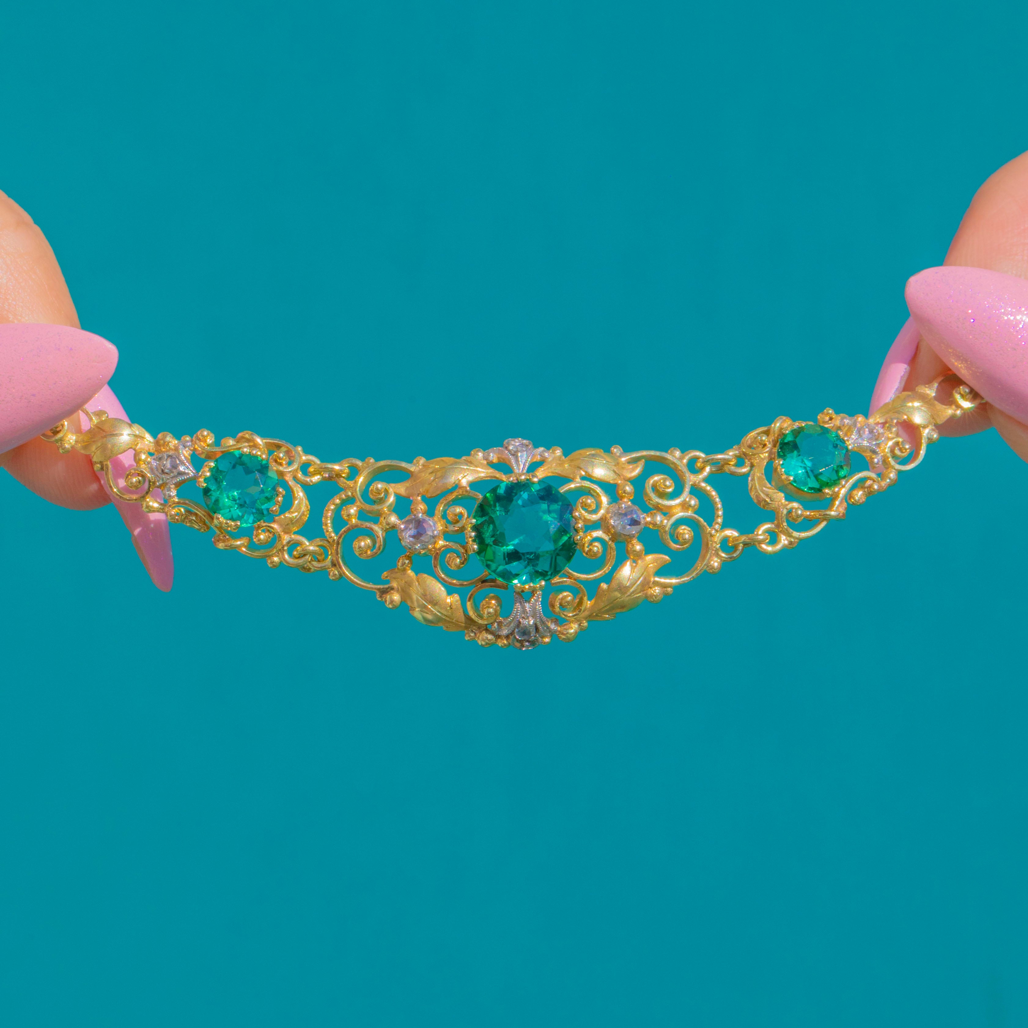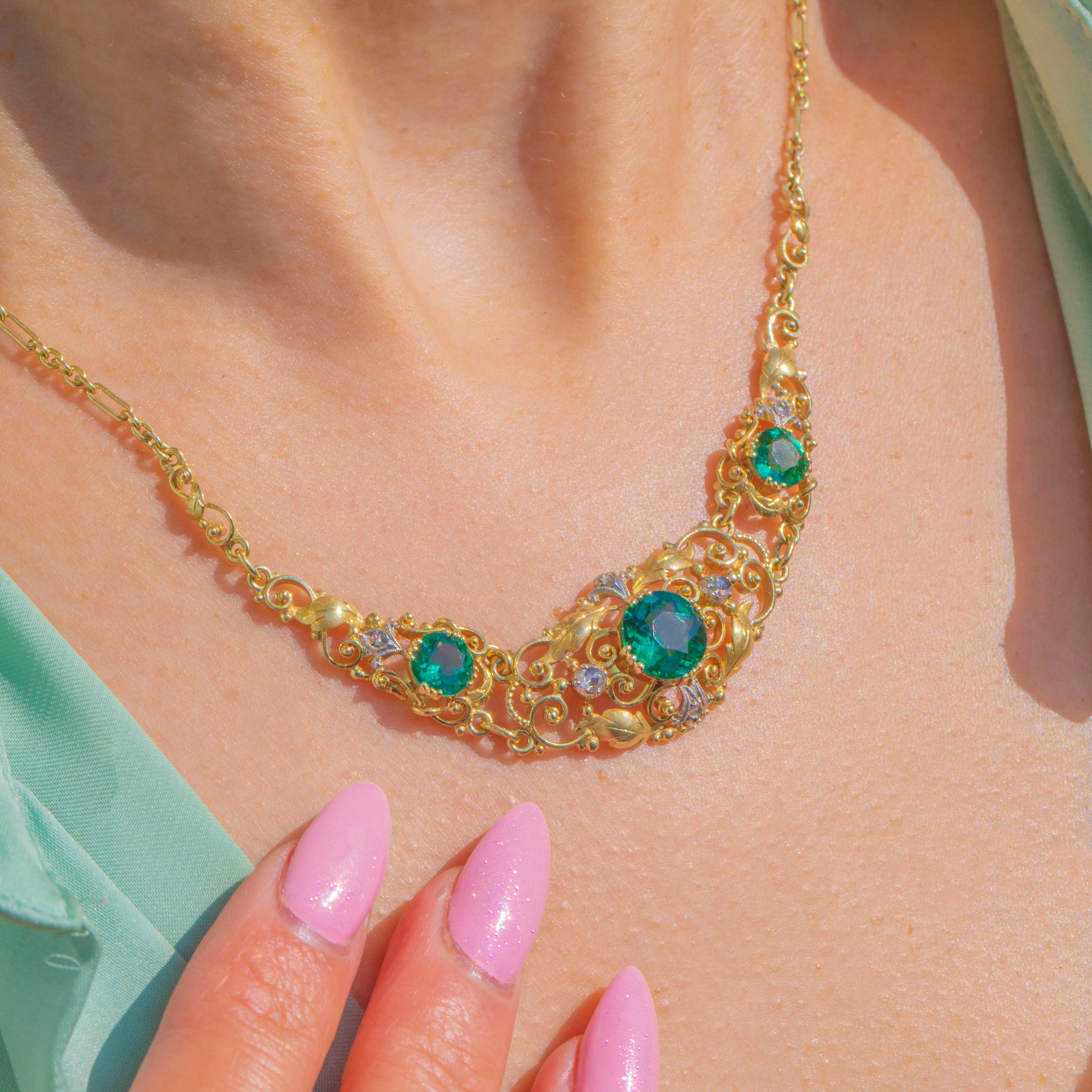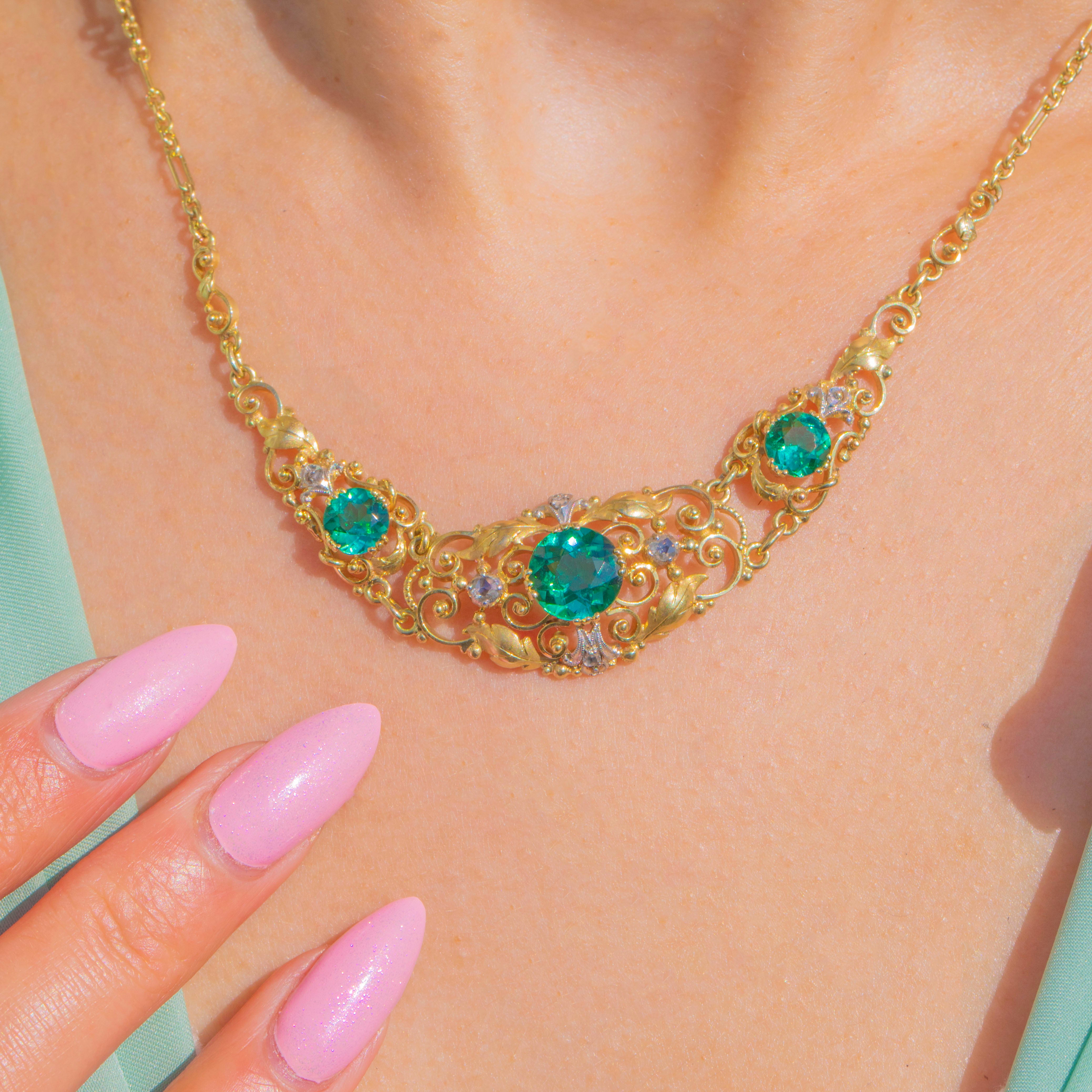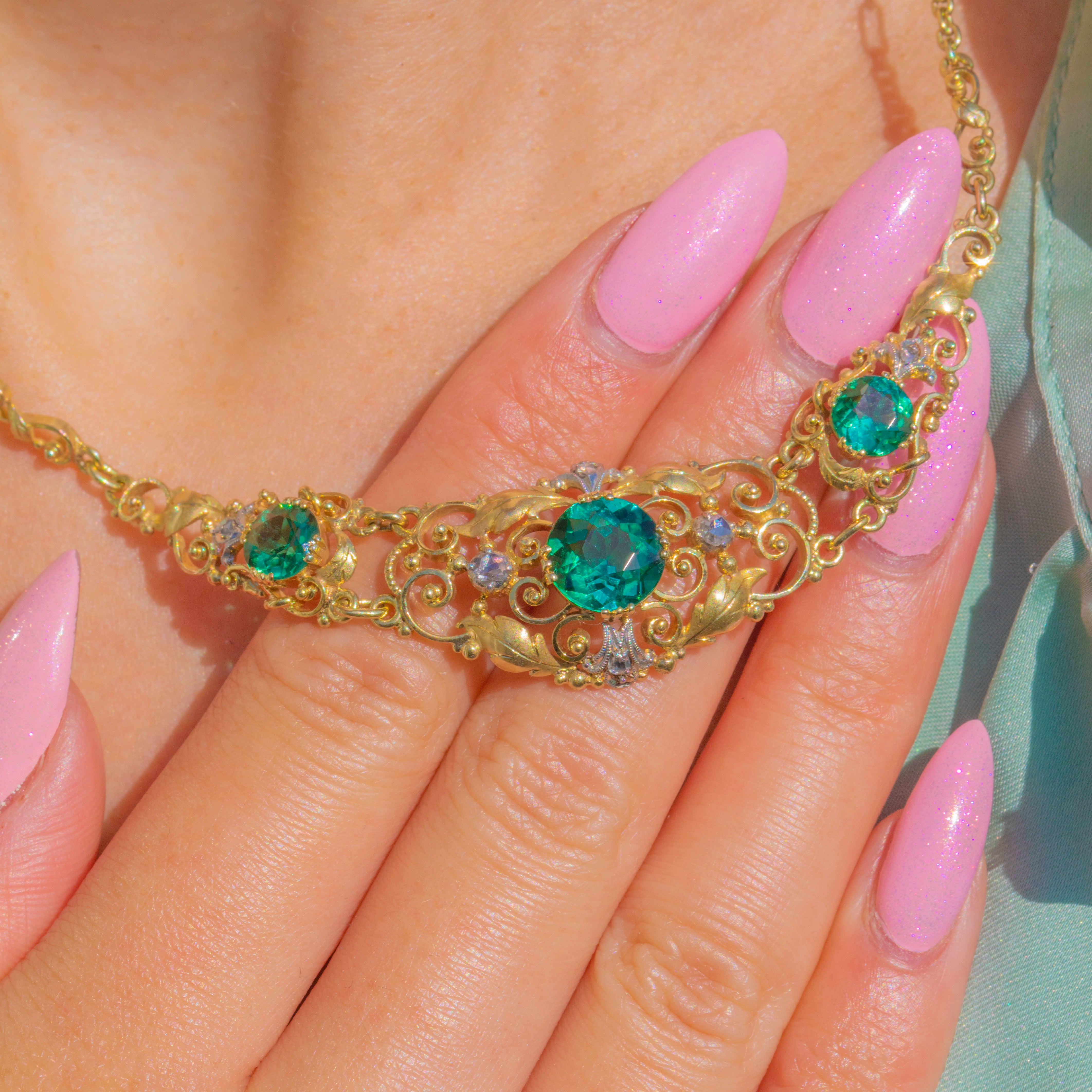 A romantic Victorian integral necklace, crafted in 15ct Gold with twinkling Diamond accents set into White Gold. The design centres upon a trio of vivid Green Tourmalines, bringing a rich jewel-toned glow to this beautifully decorative antique piece.