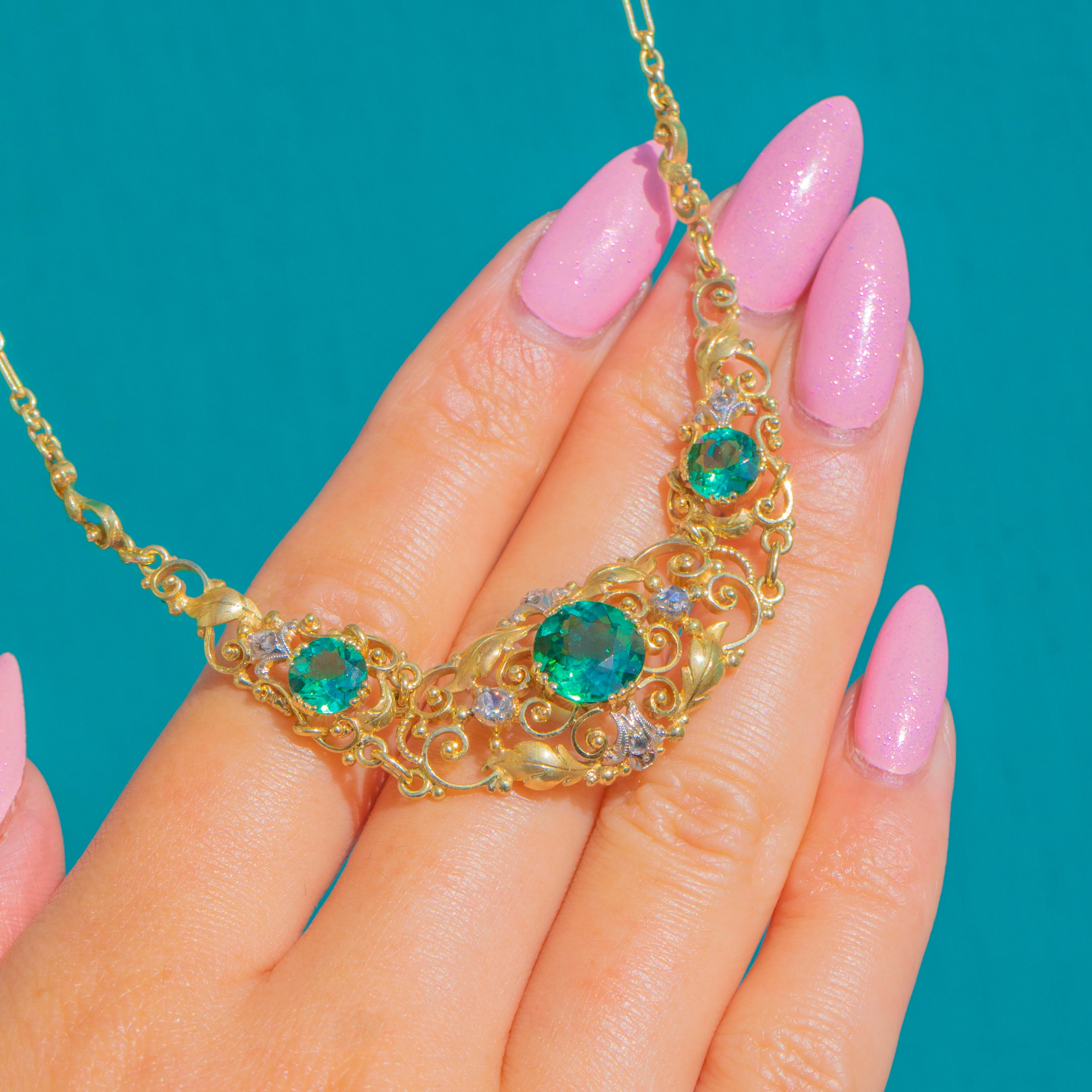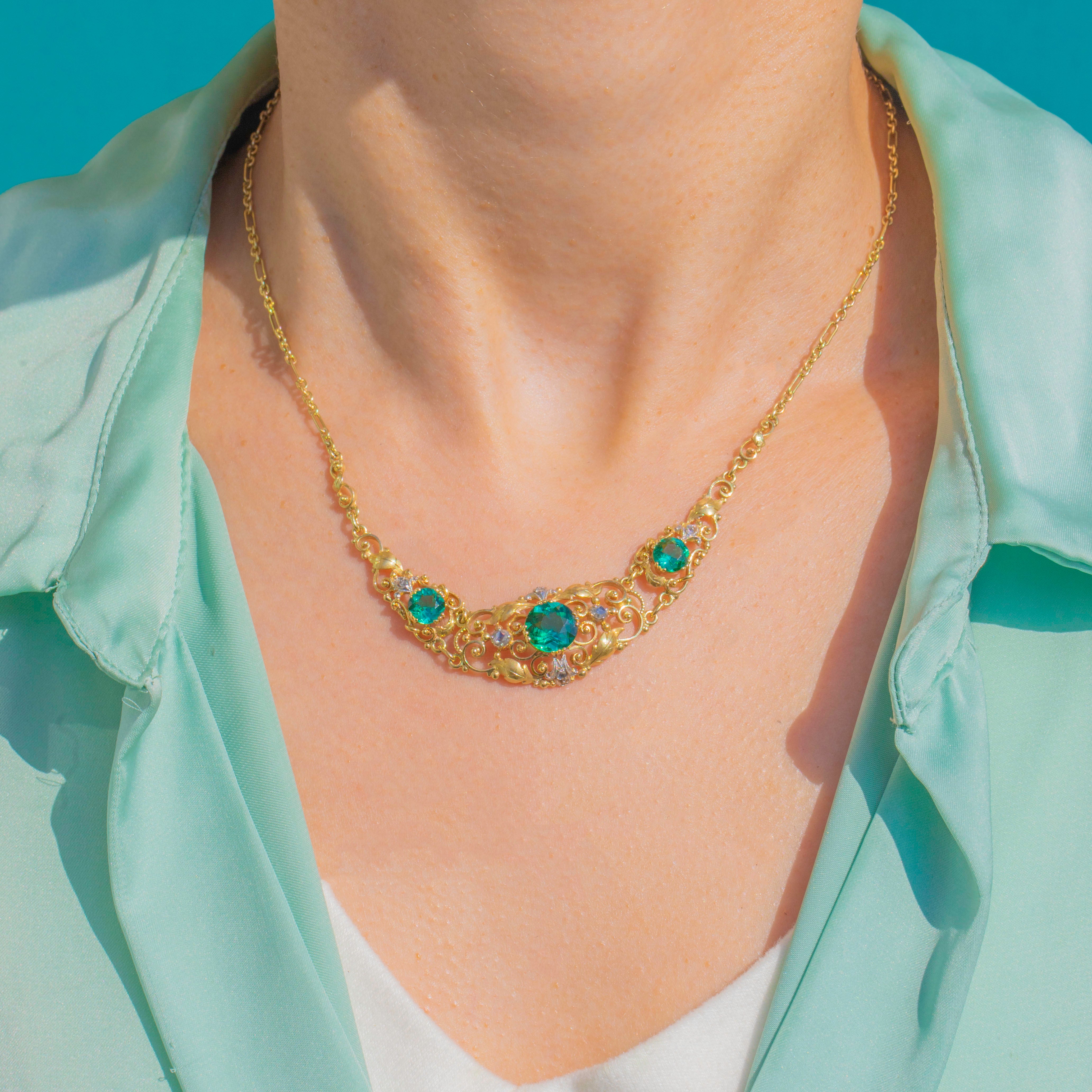 EXCELLENT: The Tourmalines and Diamonds are in excellent antique condition, with no obvious chips visible and only minimal wear. The Gold scrollwork, foliate detail and integral chain appear well cared for, with the settings secure. The necklace presents beautifully, with wear in keeping with age.