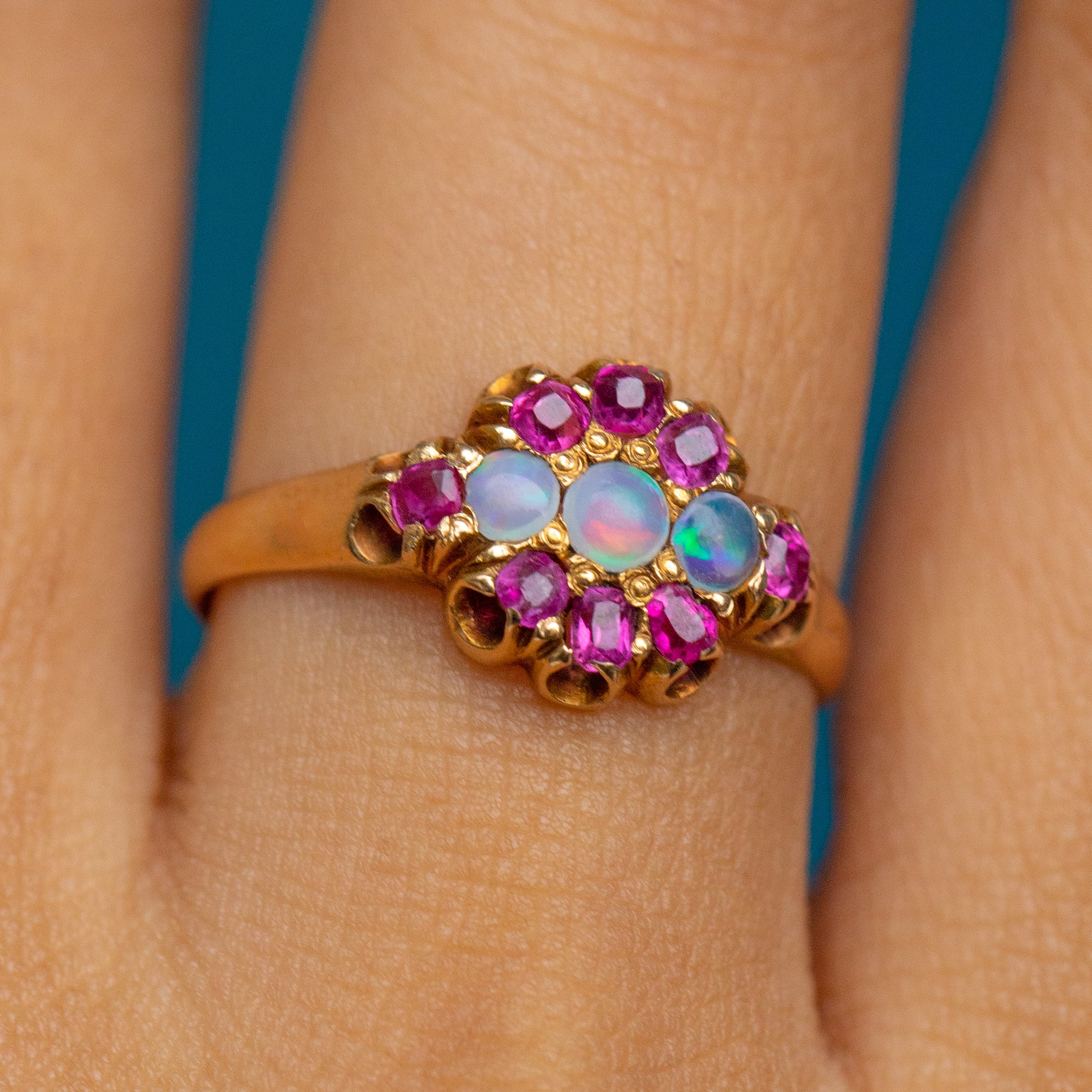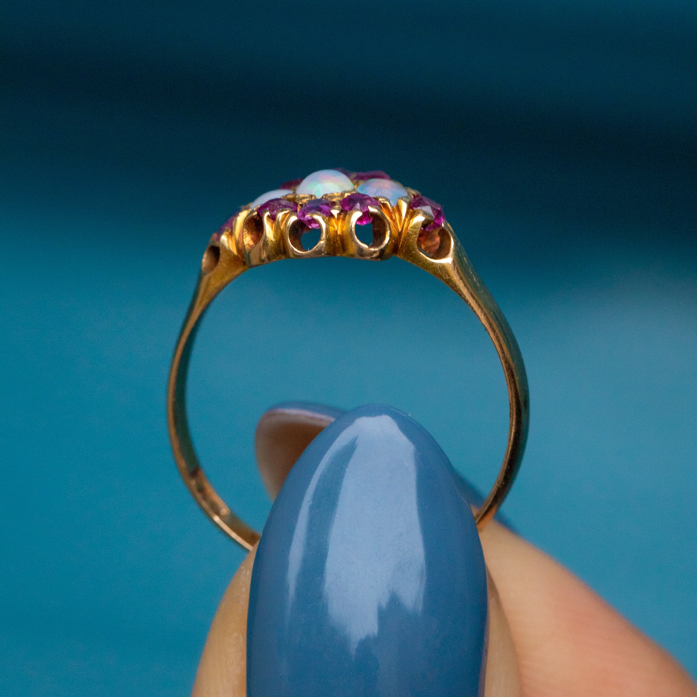 Antique 15ct Gold Opal Ruby Cluster Ring, c.1871