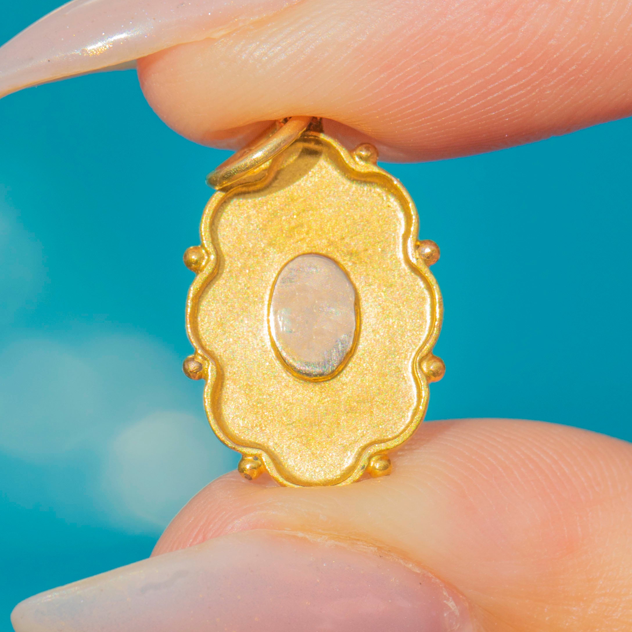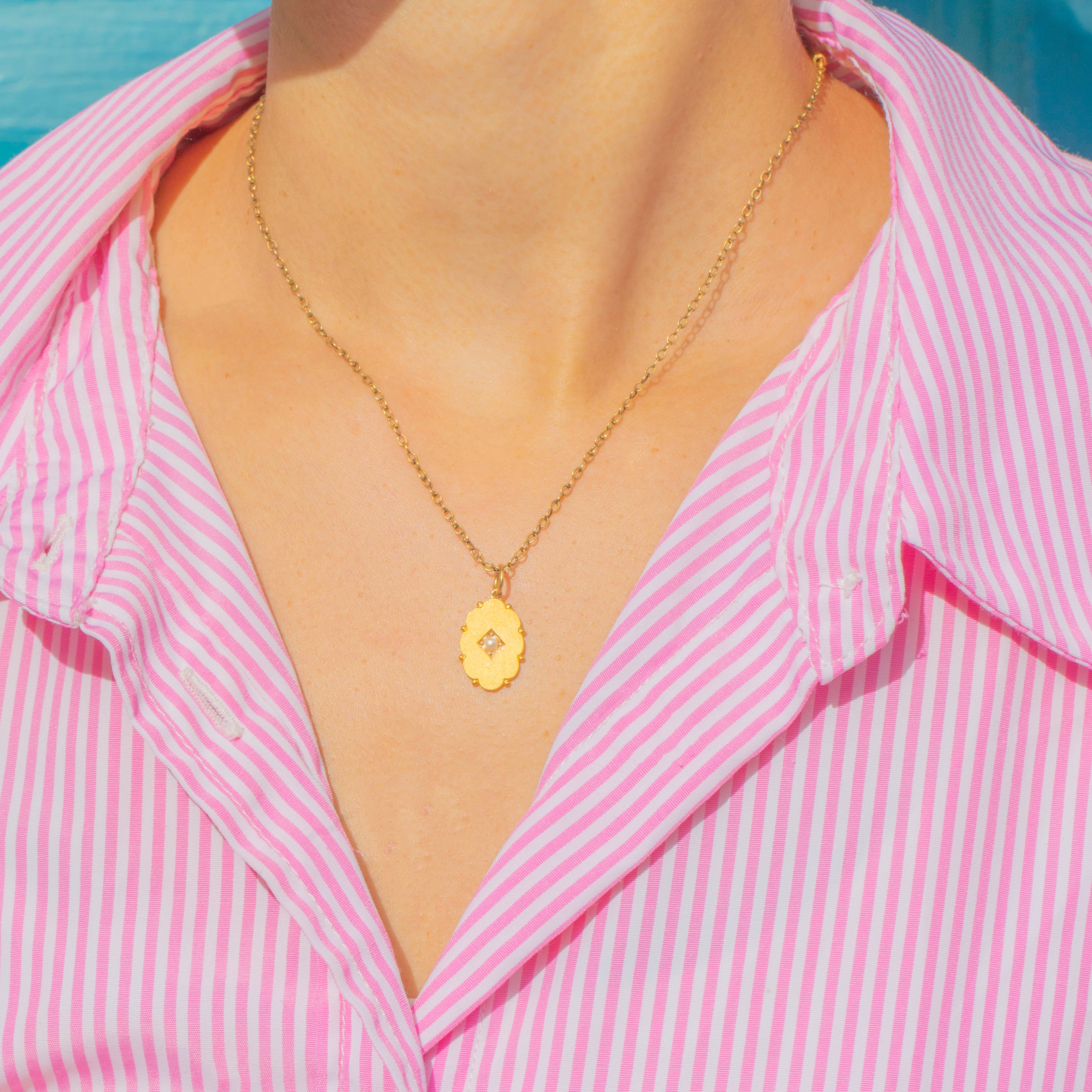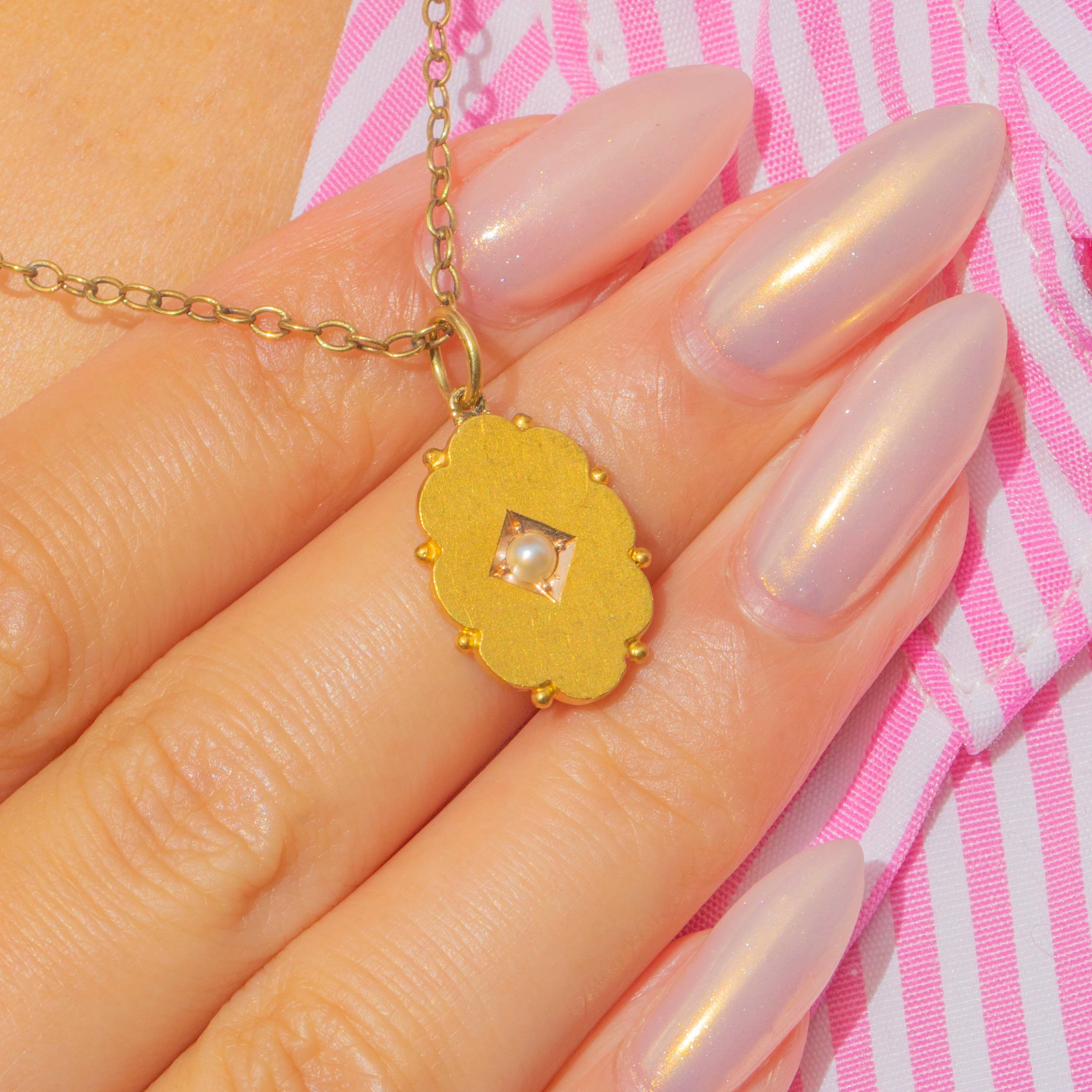 A delicate Antique Pearl pendant crafted in rich 15ct Gold. The design features a lustrous Pearl set within a finely scalloped Gold edge, adding subtle detail and texture. Elegant and refined, this pendant is the perfect everyday jewel, effortlessly complementing both antique chains and modern styles.