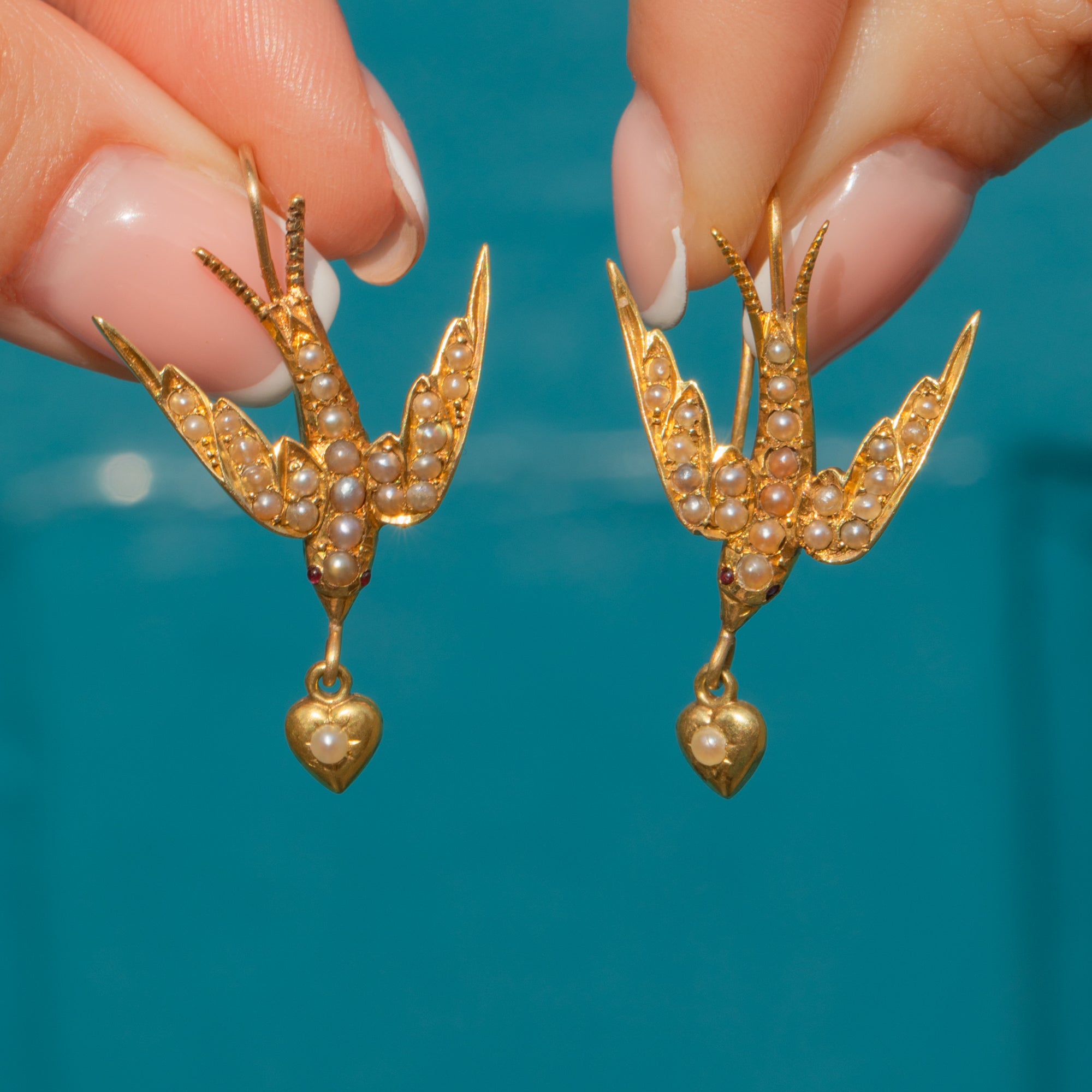 Each bird is accented with tiny berry-red Paste eyes, looking down towards heart-shaped drops, hanging daintily from their beaks. Symbolic of luck, prosperity and fidelity, swallows are the perfect motif to adorn yourself with everyday! These Victorian earrings will add a touch of antique character to every outfit.