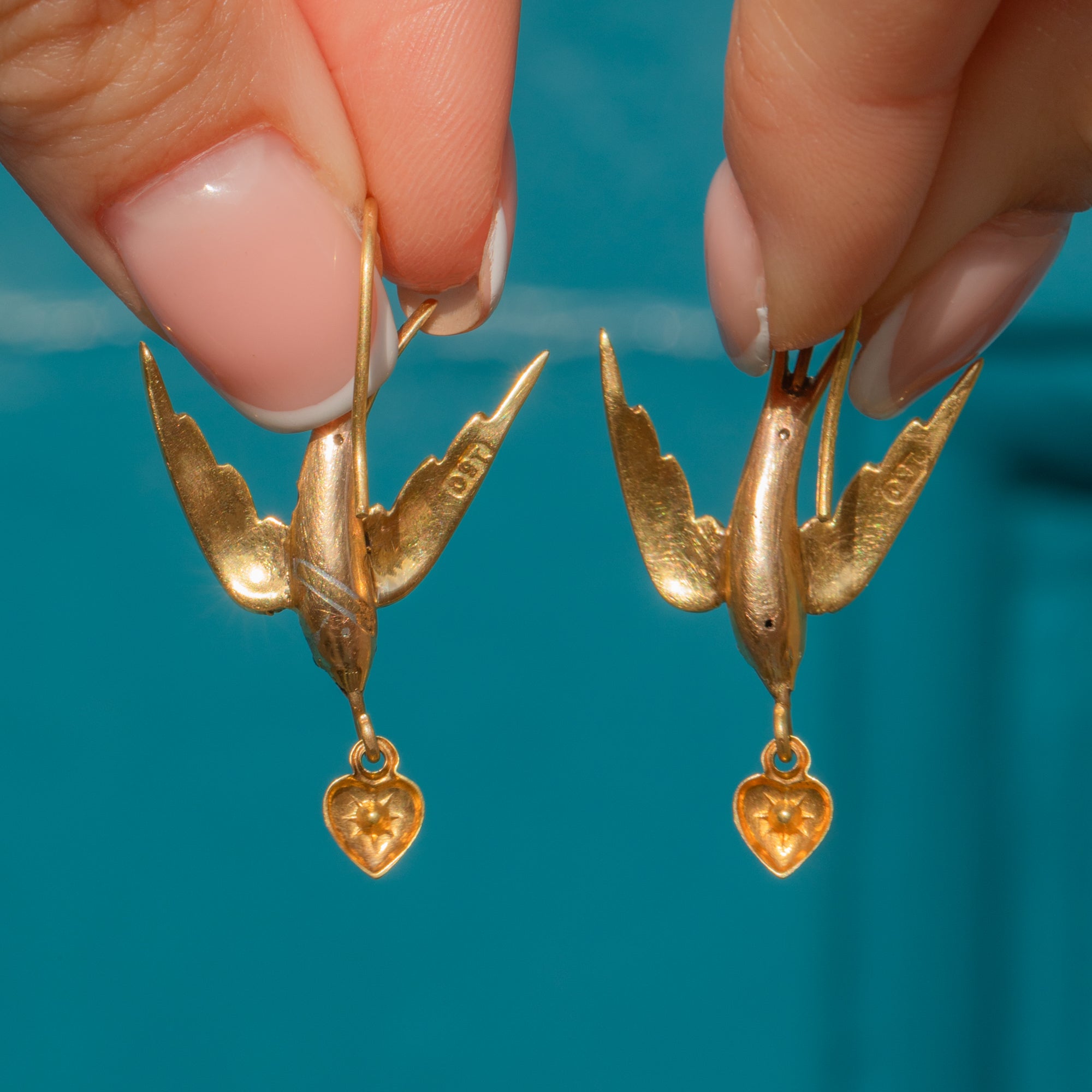 VERY GOOD. These antique 15ct Gold Pearl swallow earrings are in very good condition. The gorgeous seed Pearls are all present and securely held within their settings. While there is some natural variation in the tone of some of the Pearls, this is only noticeable under close inspection. The 15ct Gold is bright and the form of the birds has kept magnificently over the years. There is a little wear to the Gold on the underbellies of the birds, particularly on one, but this is subtle and not visible when worn. With slender and robust earring hooks, you can wear these delightful Victorian swallow earrings with absolute confidence!