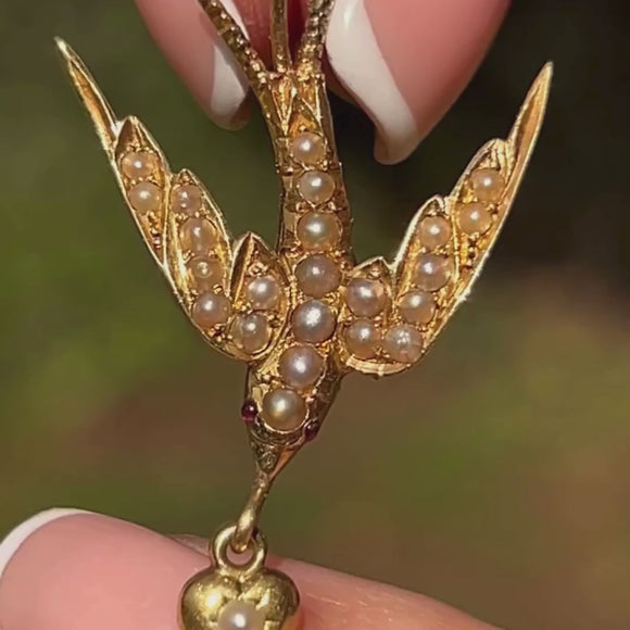 Antique 15ct Gold Pearl Swallow Earrings with Heart Drops