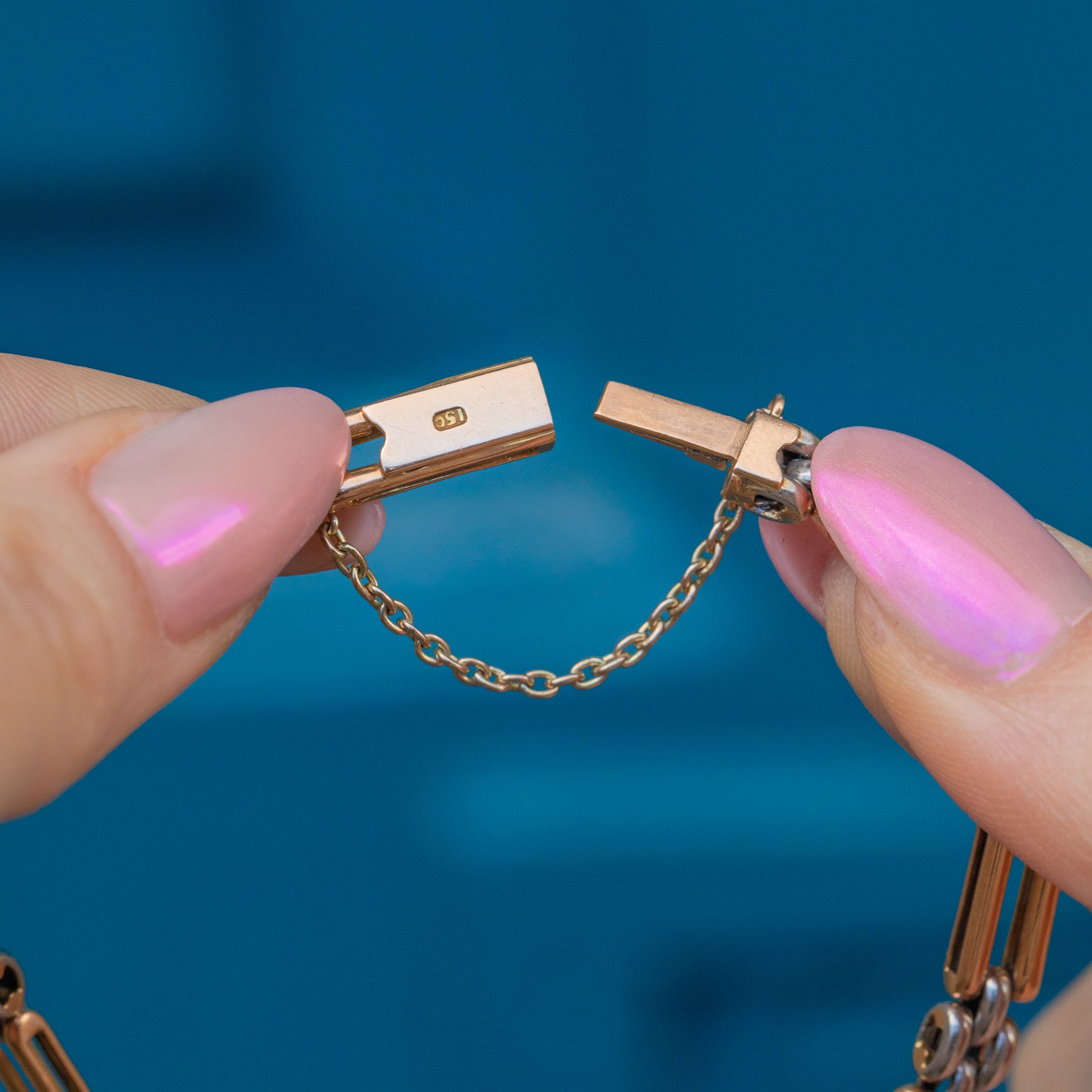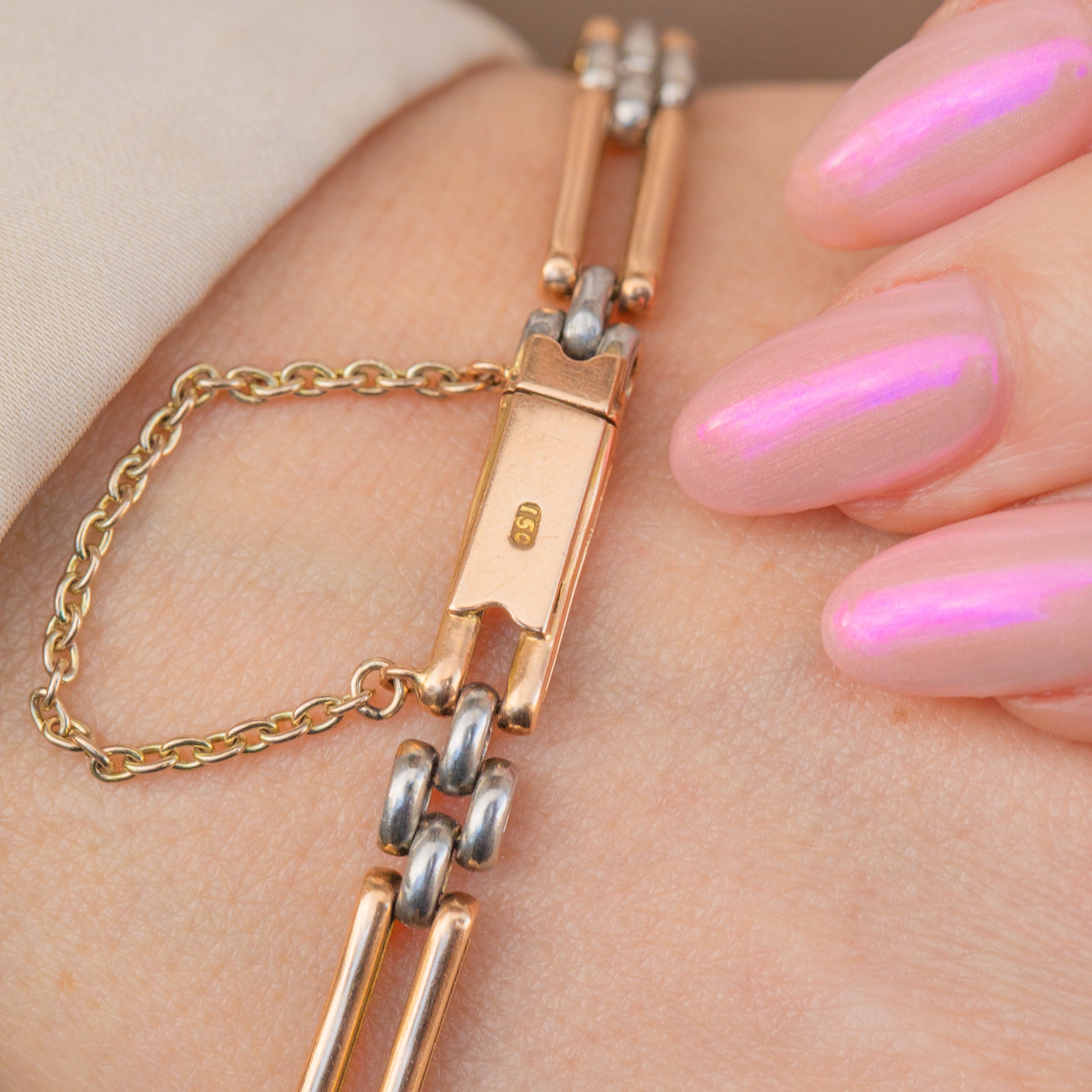 EXCELLENT. This antique 15ct Gold & Platinum two-tone gate bracelet is in excellent condition. The links are smooth and securely connected, free from dings or scuffs. The tongue clasp is in perfect working condition and the safety chain provides that little extra layer of security. Perfect for everyday and occasional wear, this Edwardian Gold & Platinum bracelet will make a versatile addition to your collection!