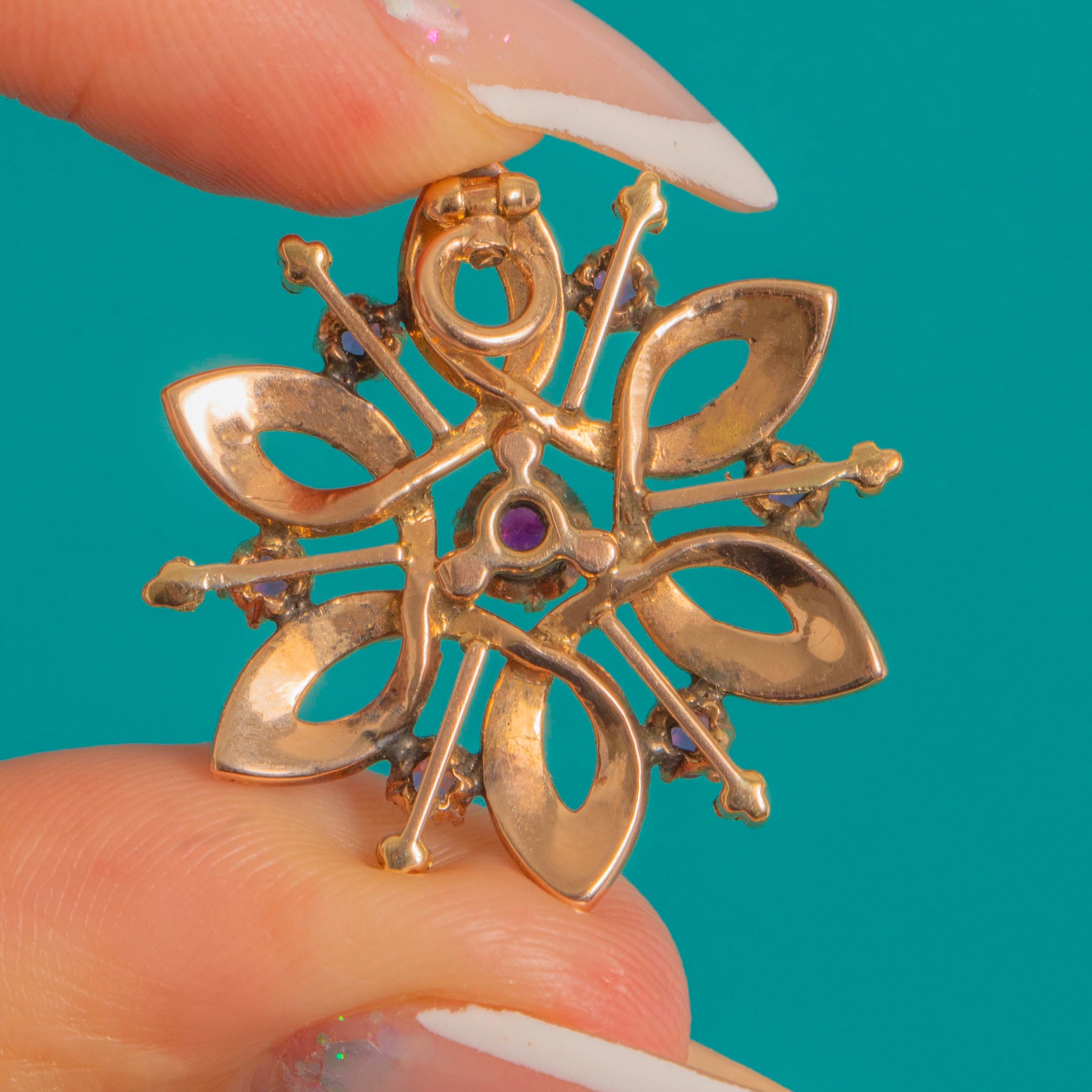Beautifully made with openwork radiating struts, applied trefoil granules, and open-back and claw settings, this pendant has an airy, lace-like presence against the skin. A neat hinged bail with jump ring completes the piece, ready to add a touch of Edwardian elegance to your favourite chain.