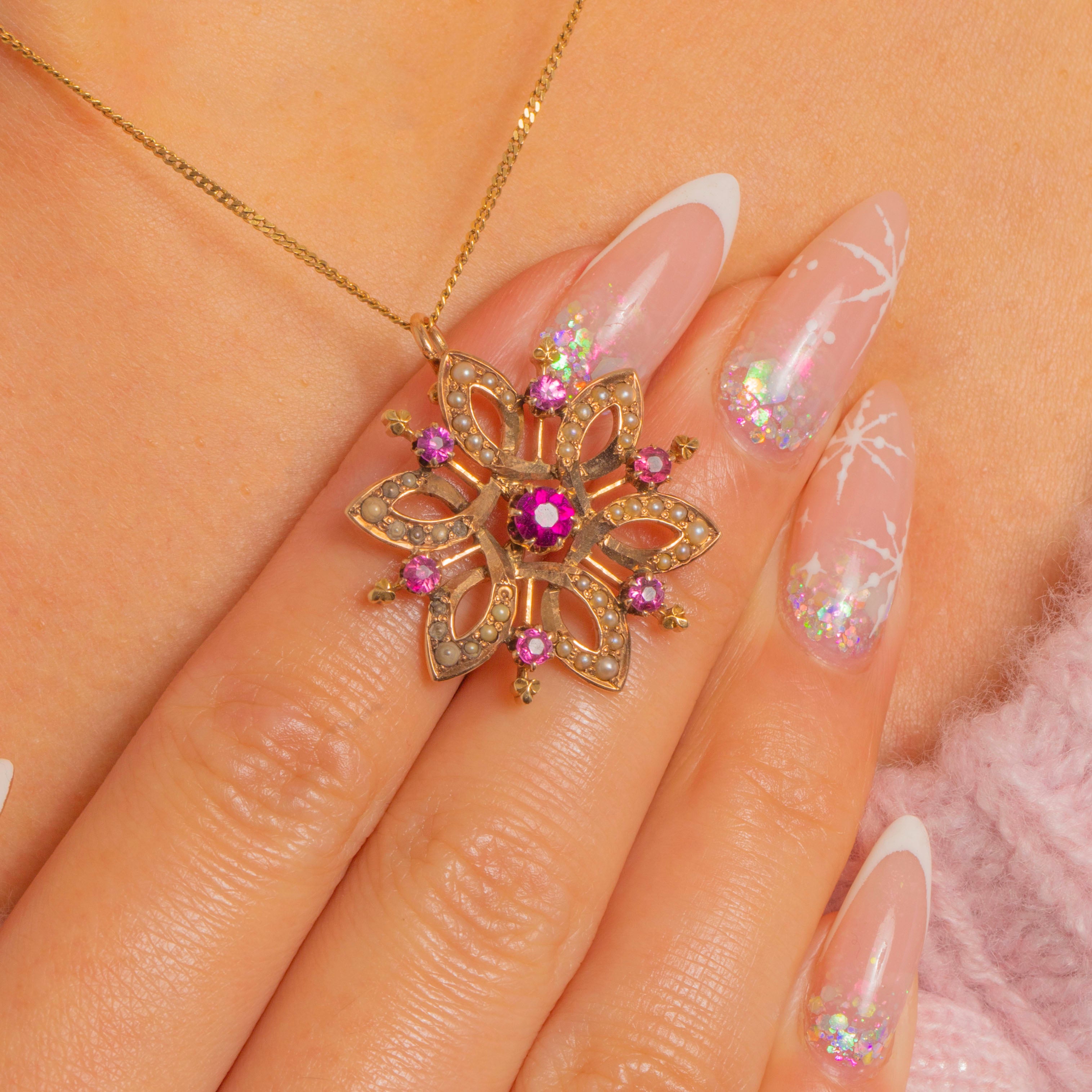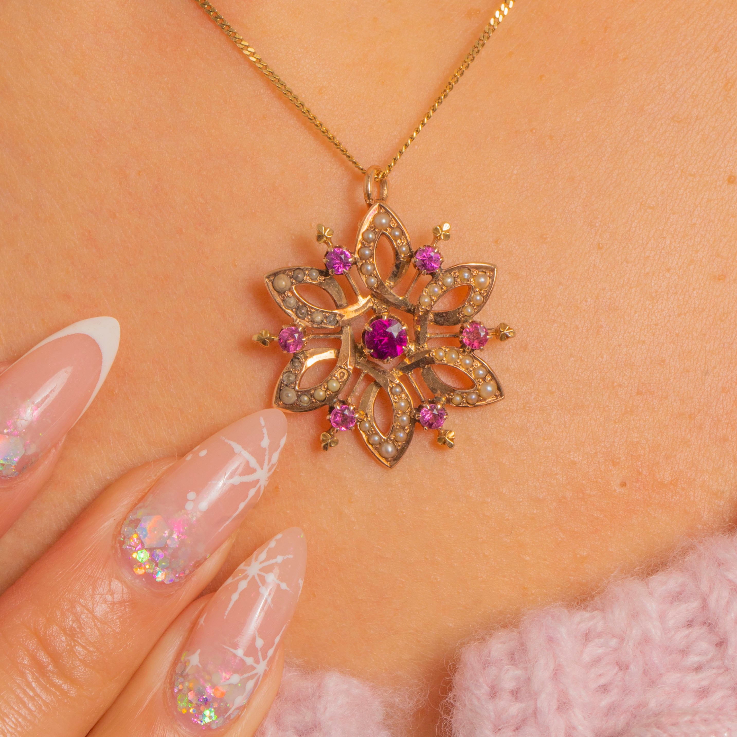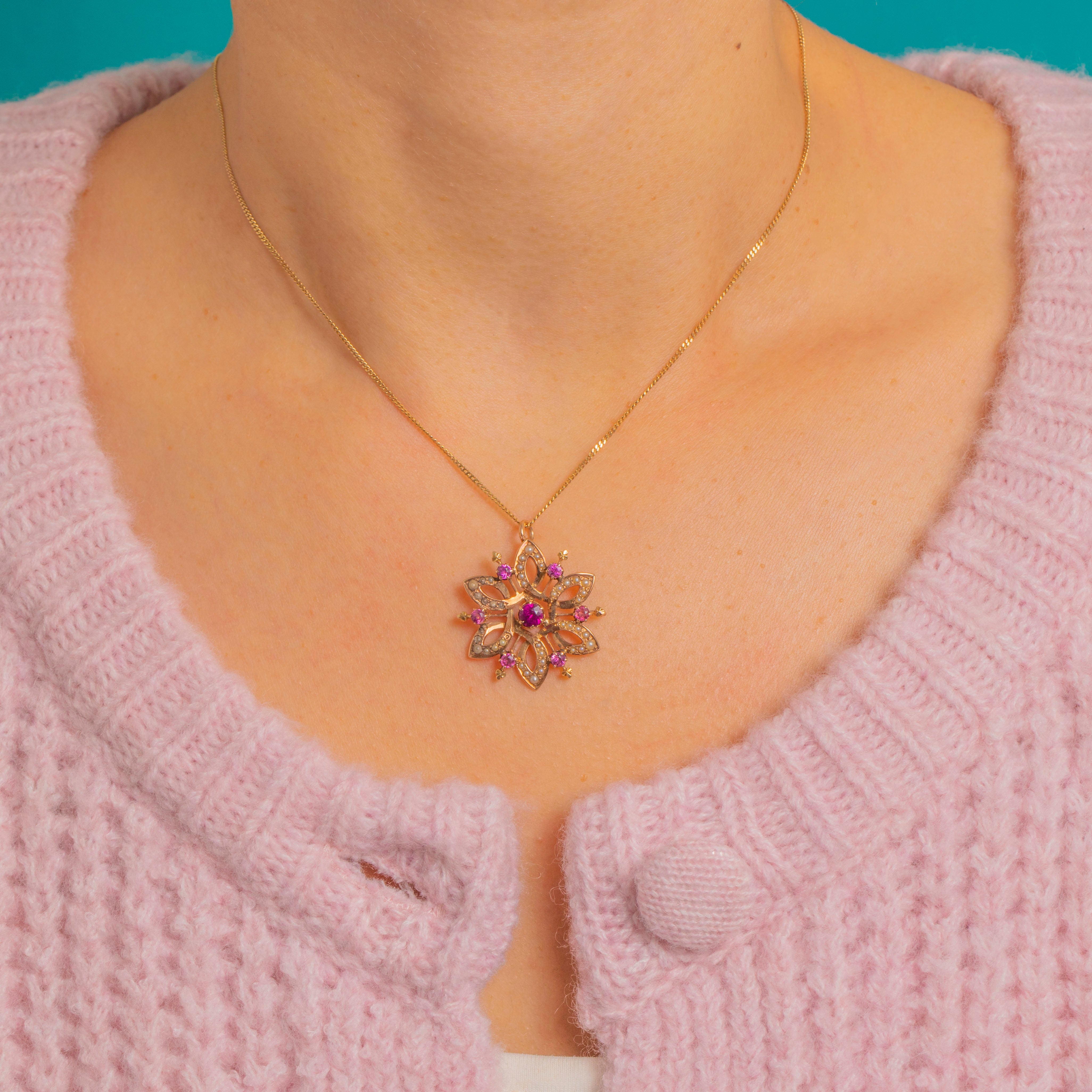 A delicate Edwardian star pendant in warm 15ct Gold, shimmering with creamy seed Pearls and vivid magenta-pink Rhodolite Garnets. The starburst design is bead-set with Pearls around a vibrant central Garnet, while smaller Garnets punctuate the perimeter for a romantic burst of colour.