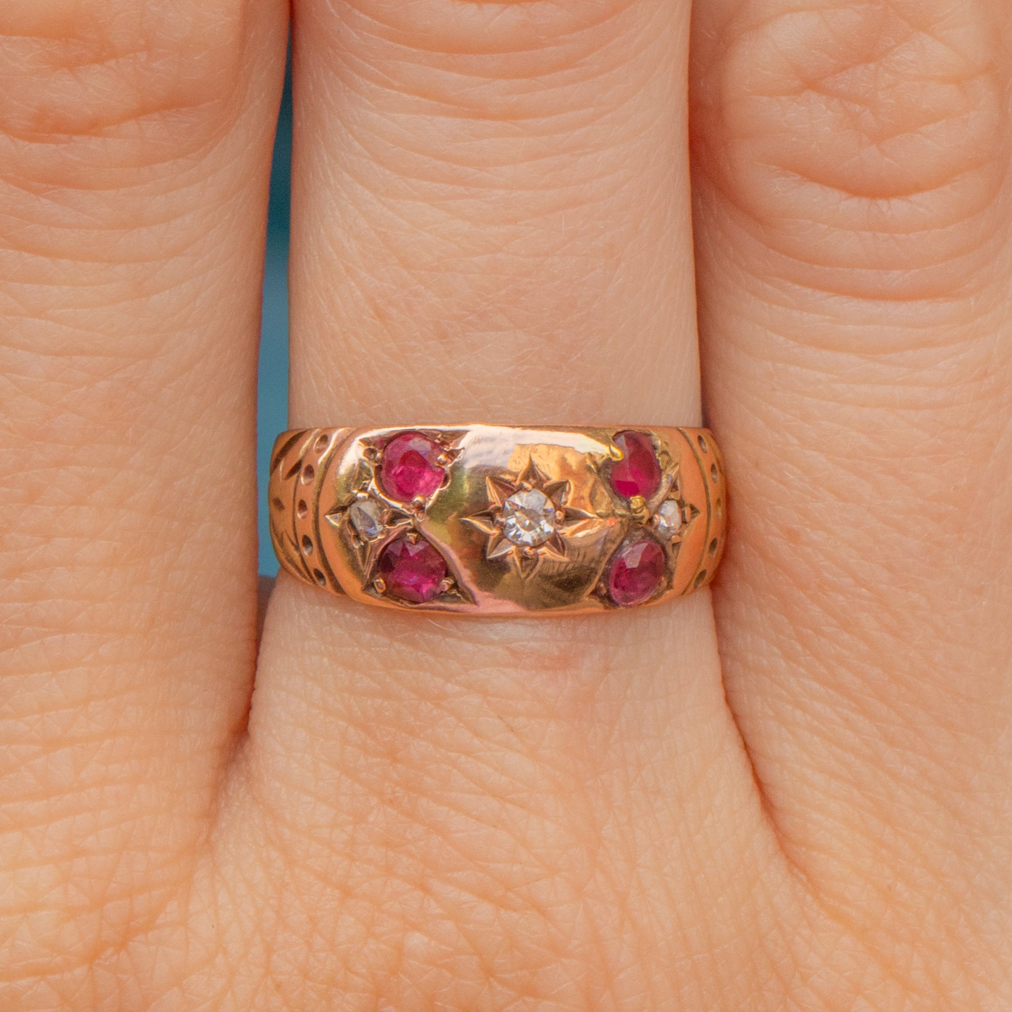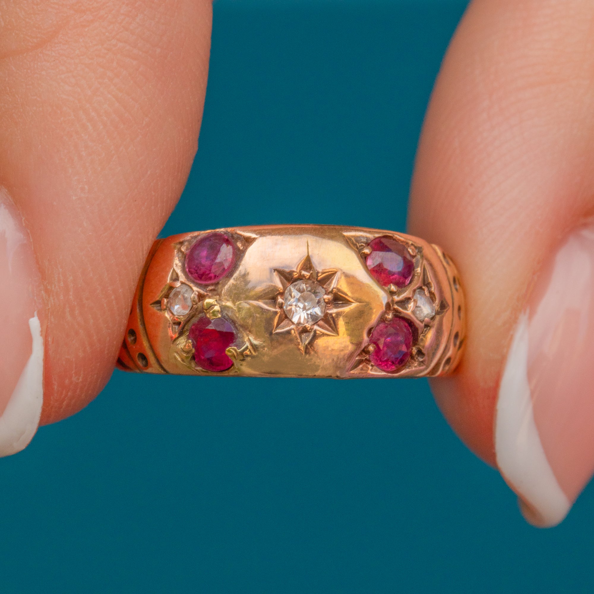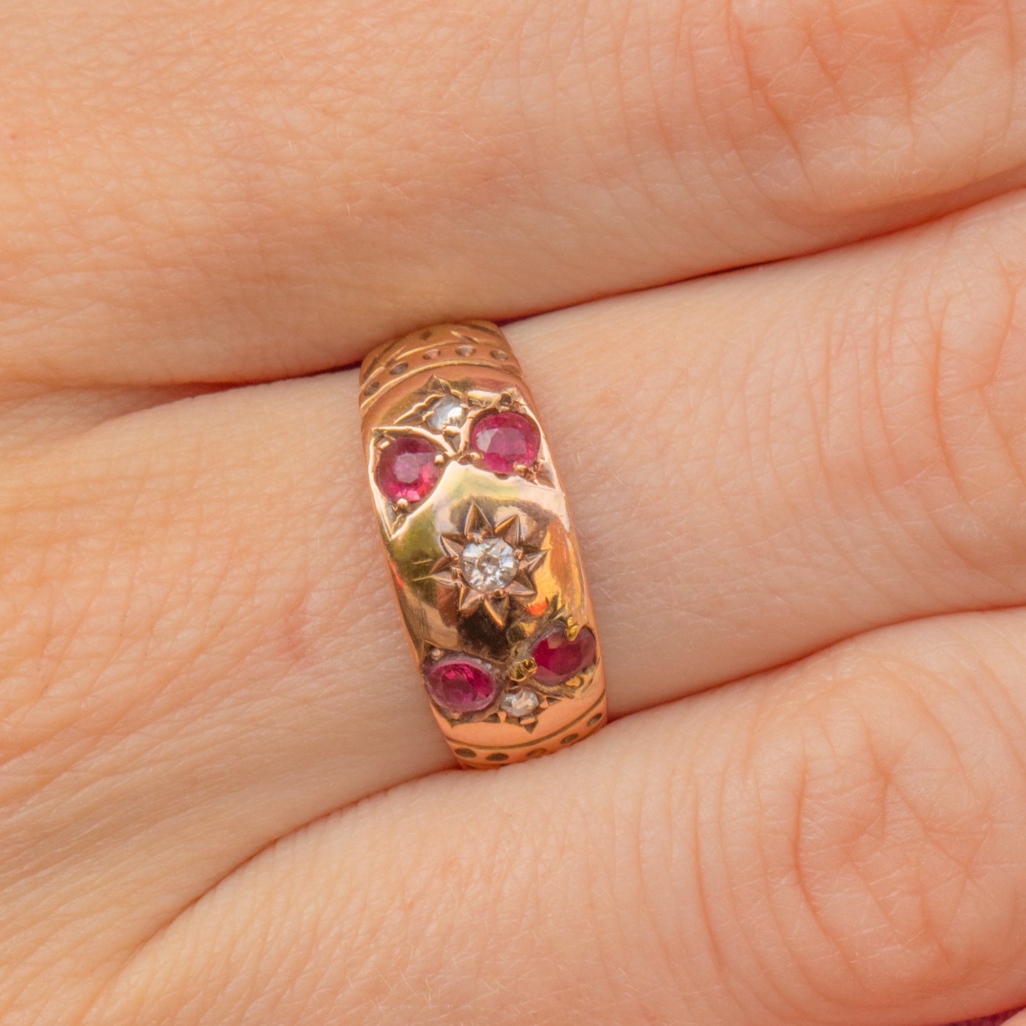 This is a delightful antique 15ct Gold Ruby Diamond gypsy ring! Featuring three twinkling Diamonds poised between four juicy, cherry-red Rubies, and finished with intricate engraved detailing on her shoulders - what more could you want?