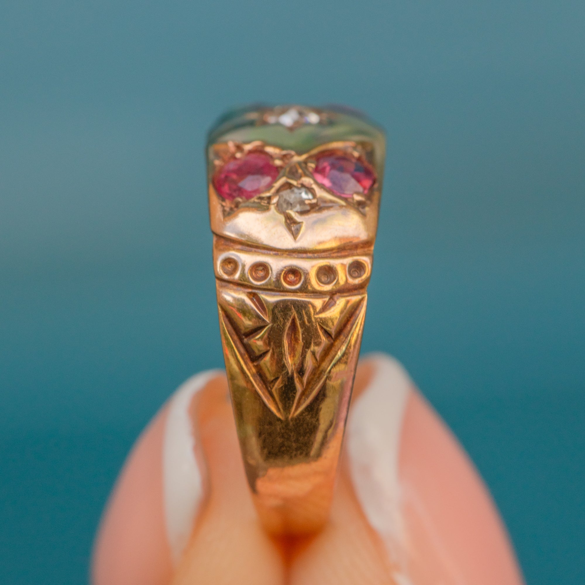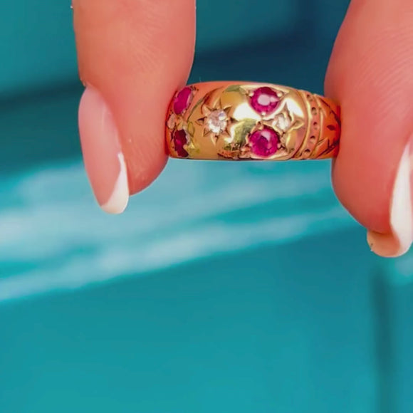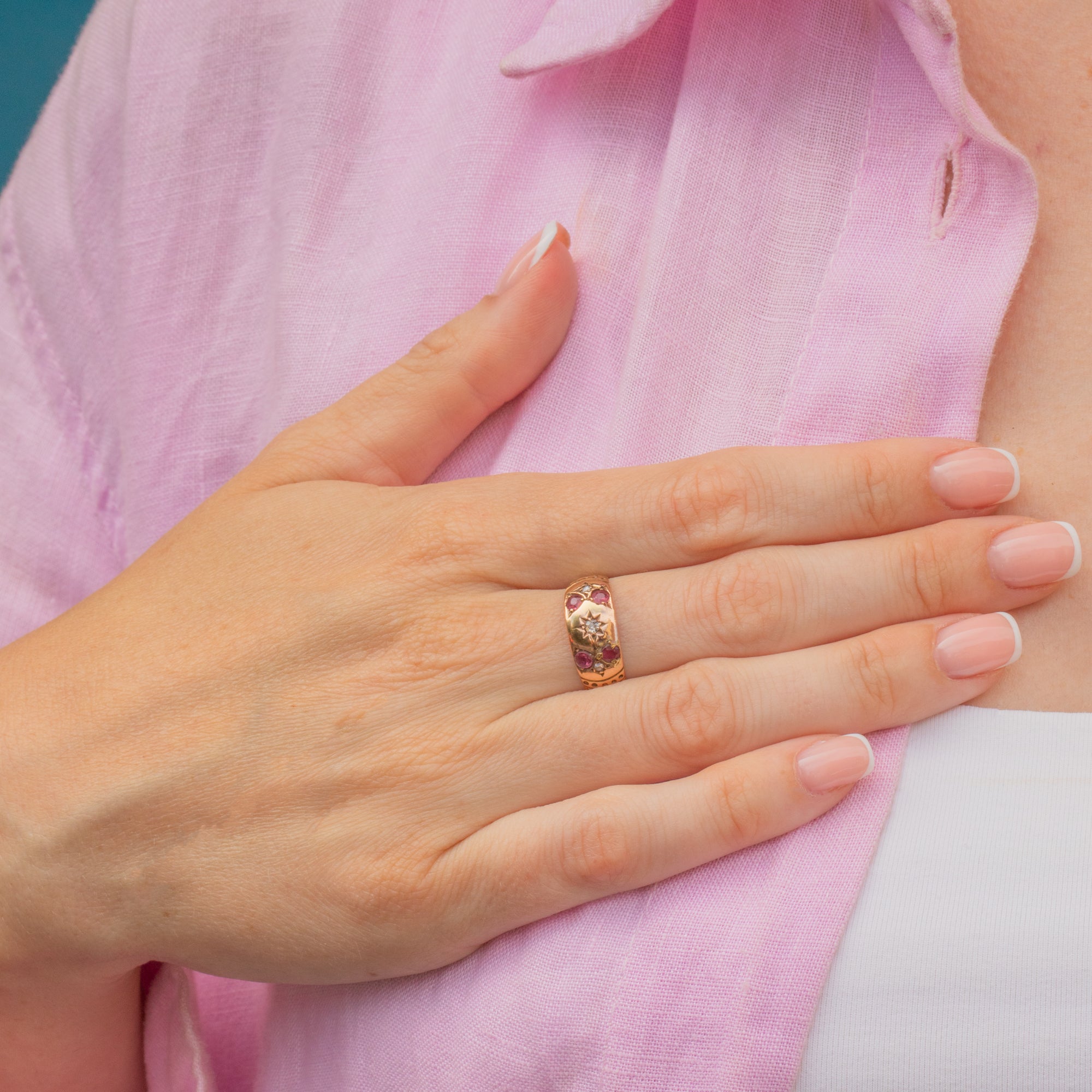 This is a delightful antique 15ct Gold Ruby Diamond gypsy ring! Featuring three twinkling Diamonds poised between four juicy, cherry-red Rubies, and finished with intricate engraved detailing on her shoulders - what more could you want?