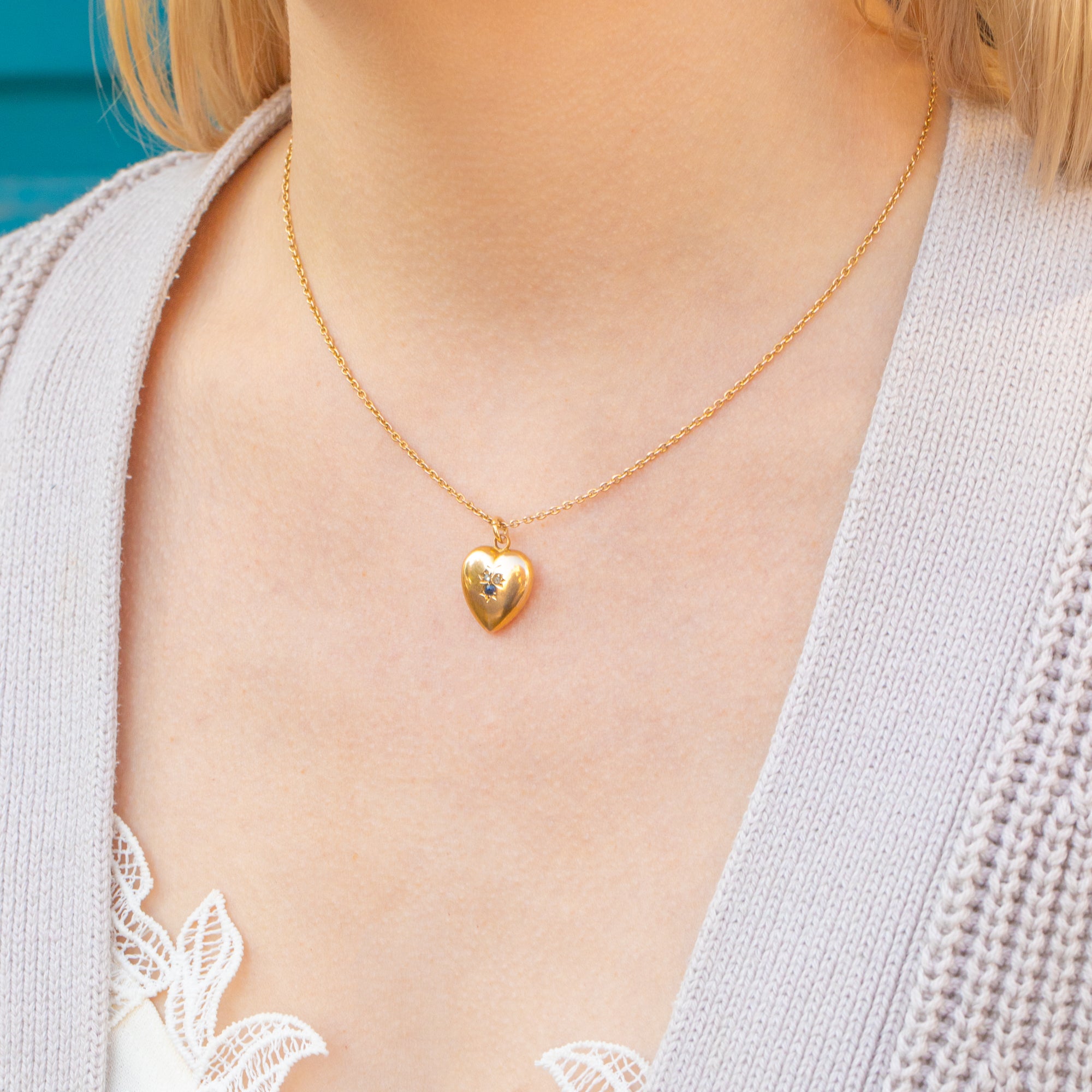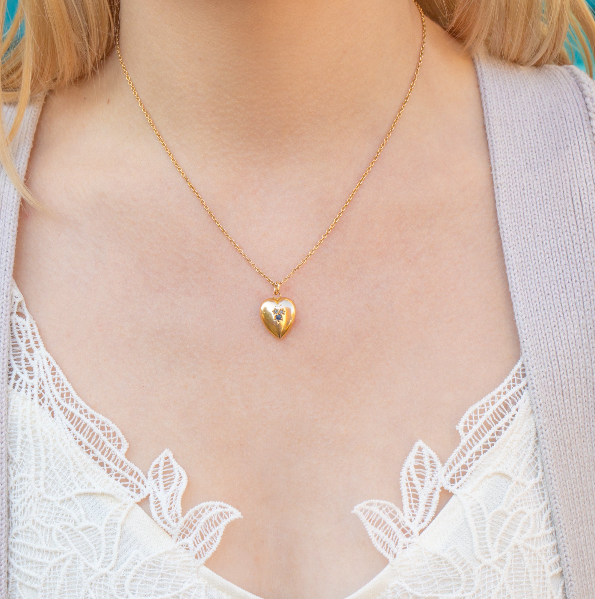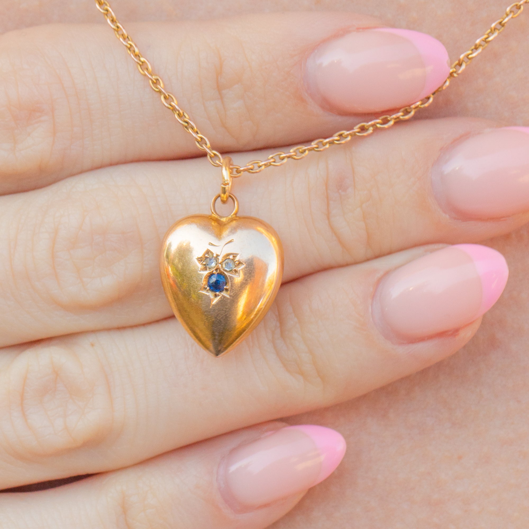 EXCELLENT. This antique 15ct Gold Sapphire Diamond puffy heart pendant is in excellent condition! The gemstones are all securely set and the heart has maintained its shape beautifully. The hallmarks are clear and fully legible making her a coveted addition to your collection!