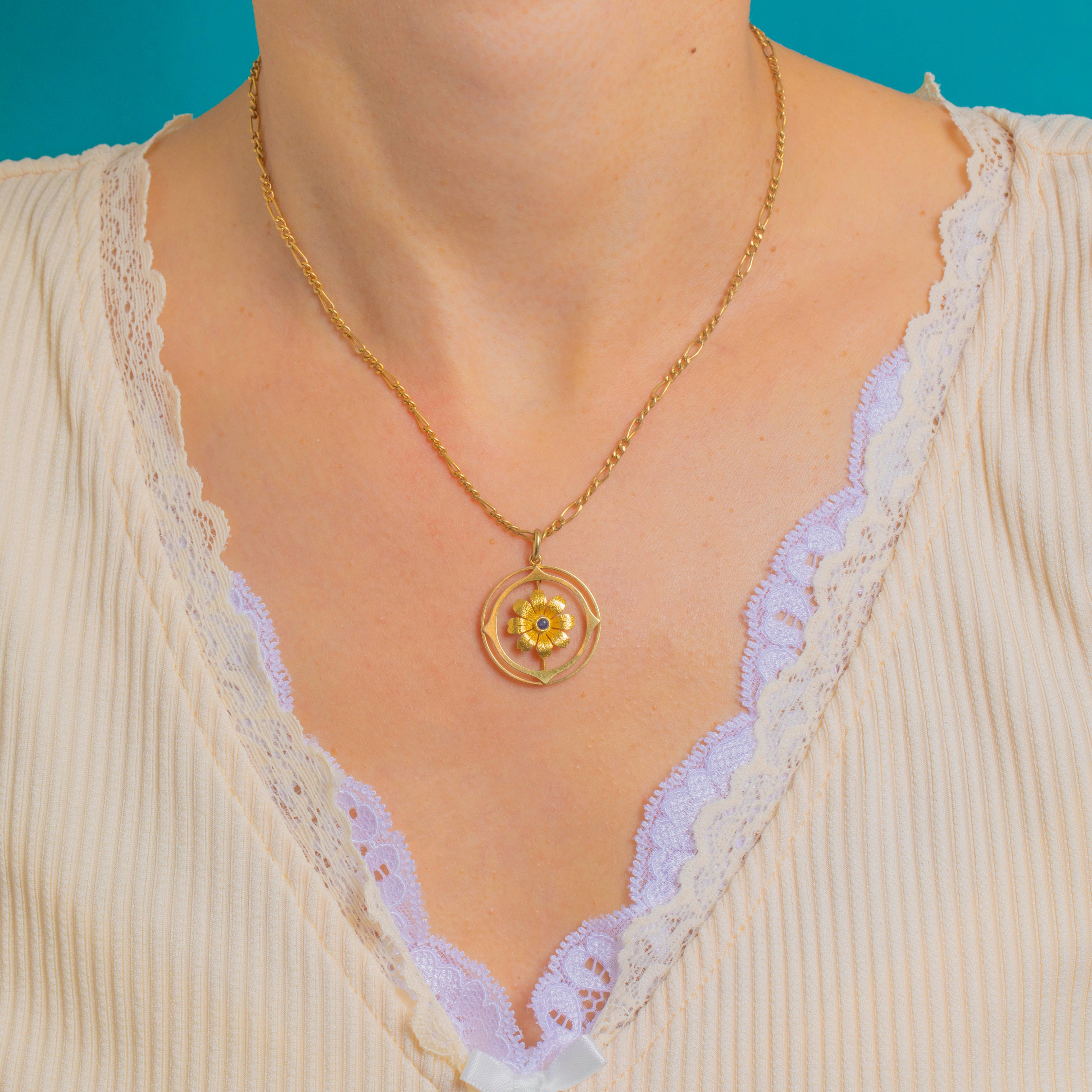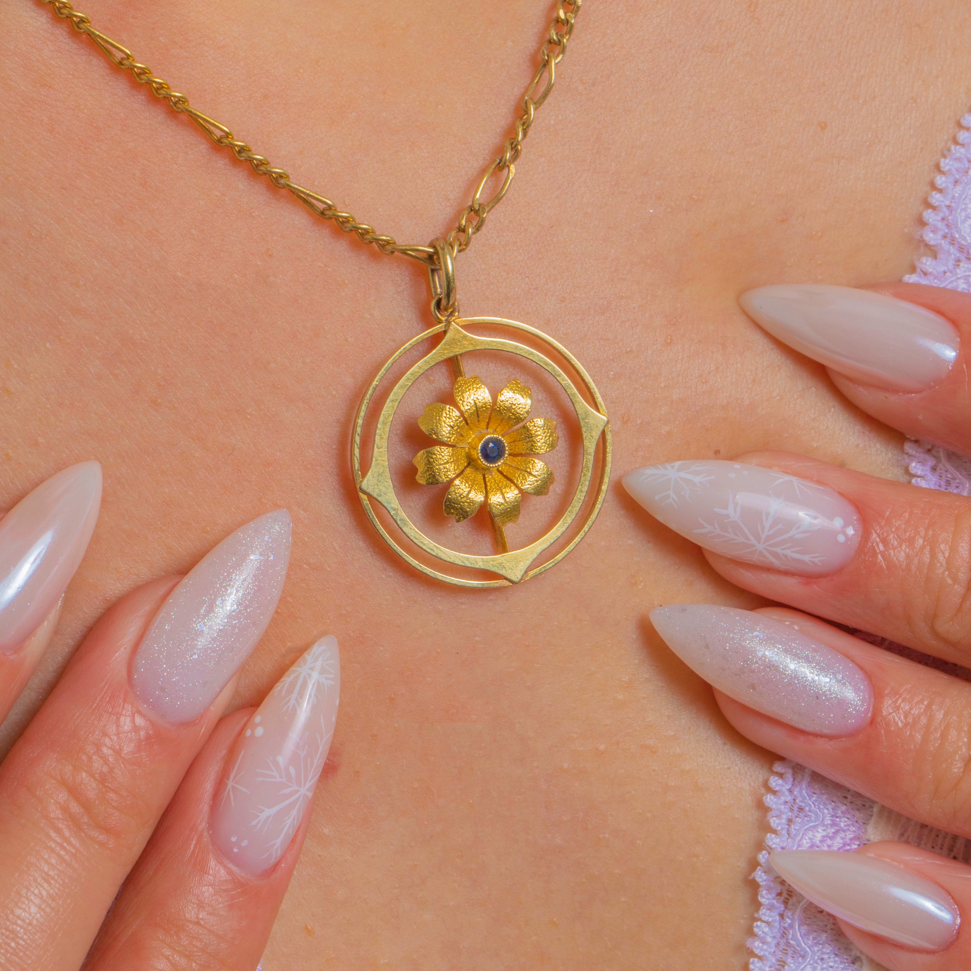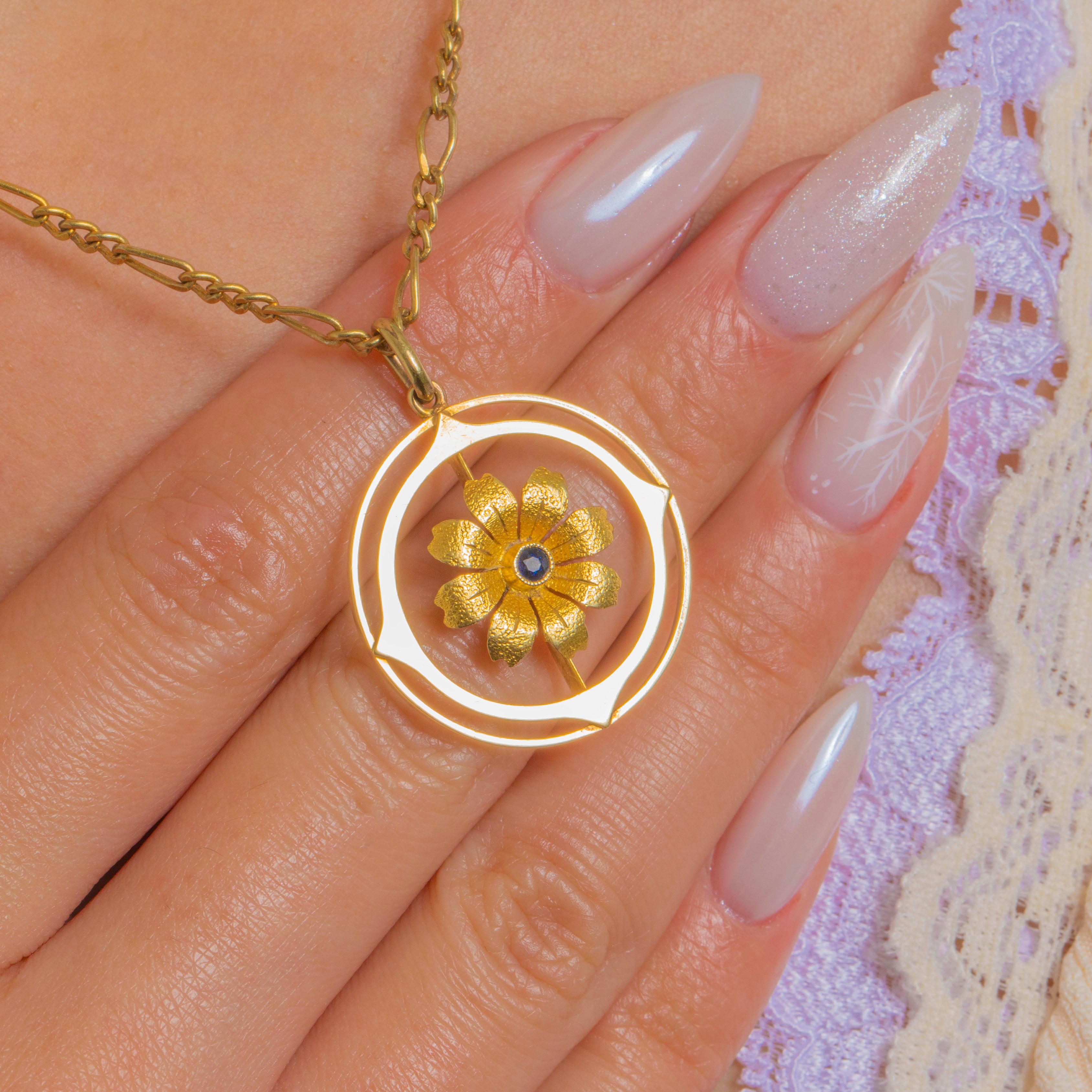 A charming Edwardian flower pendant in rich 15ct Gold, this openwork roundel balances soft botanicals with crisp geometry. At its heart glows a deep blue Sapphire, set at the centre of a sculpted bloom with a slender stem and leaf, framed by concentric circles punctuated at the compass points for a refined, architectural feel.
