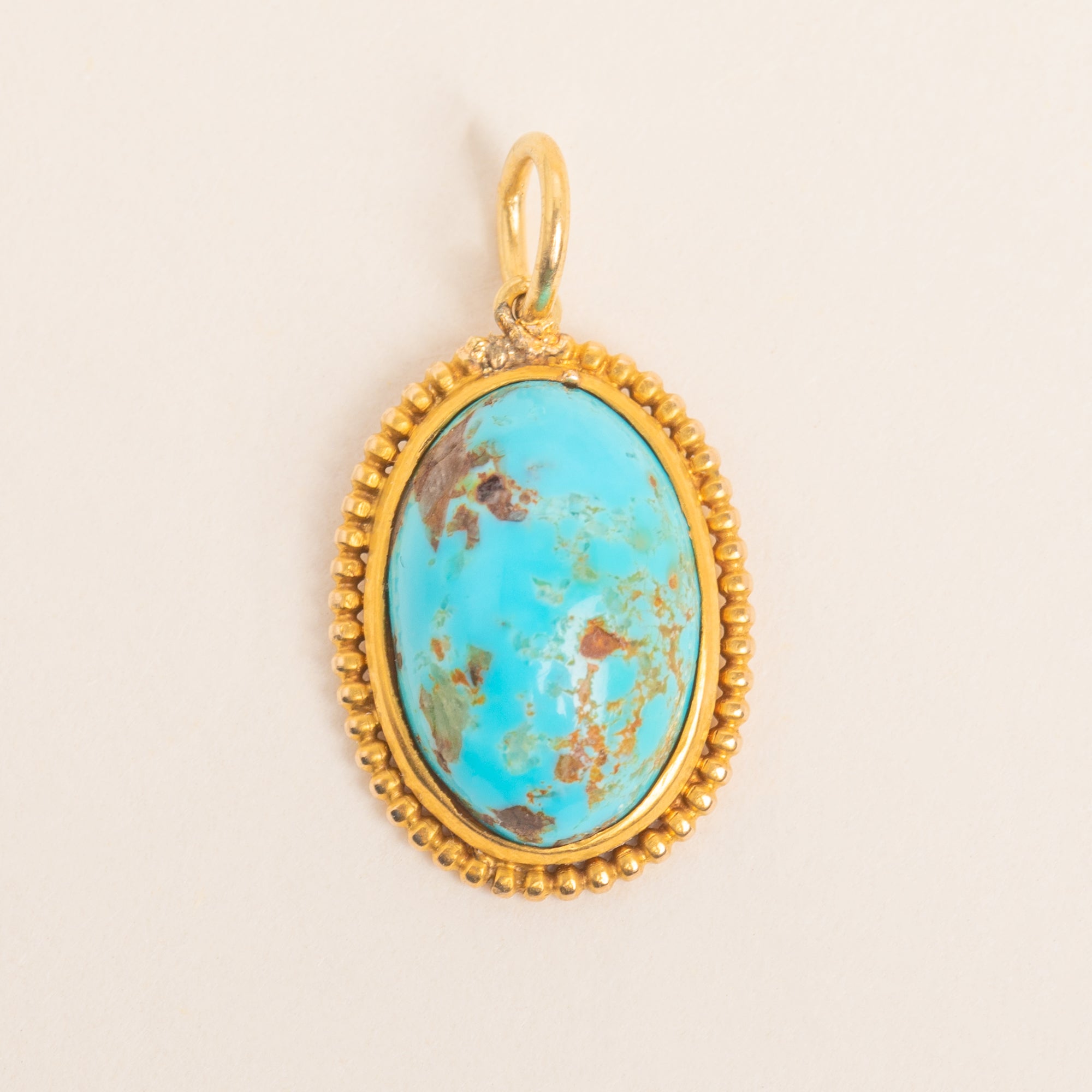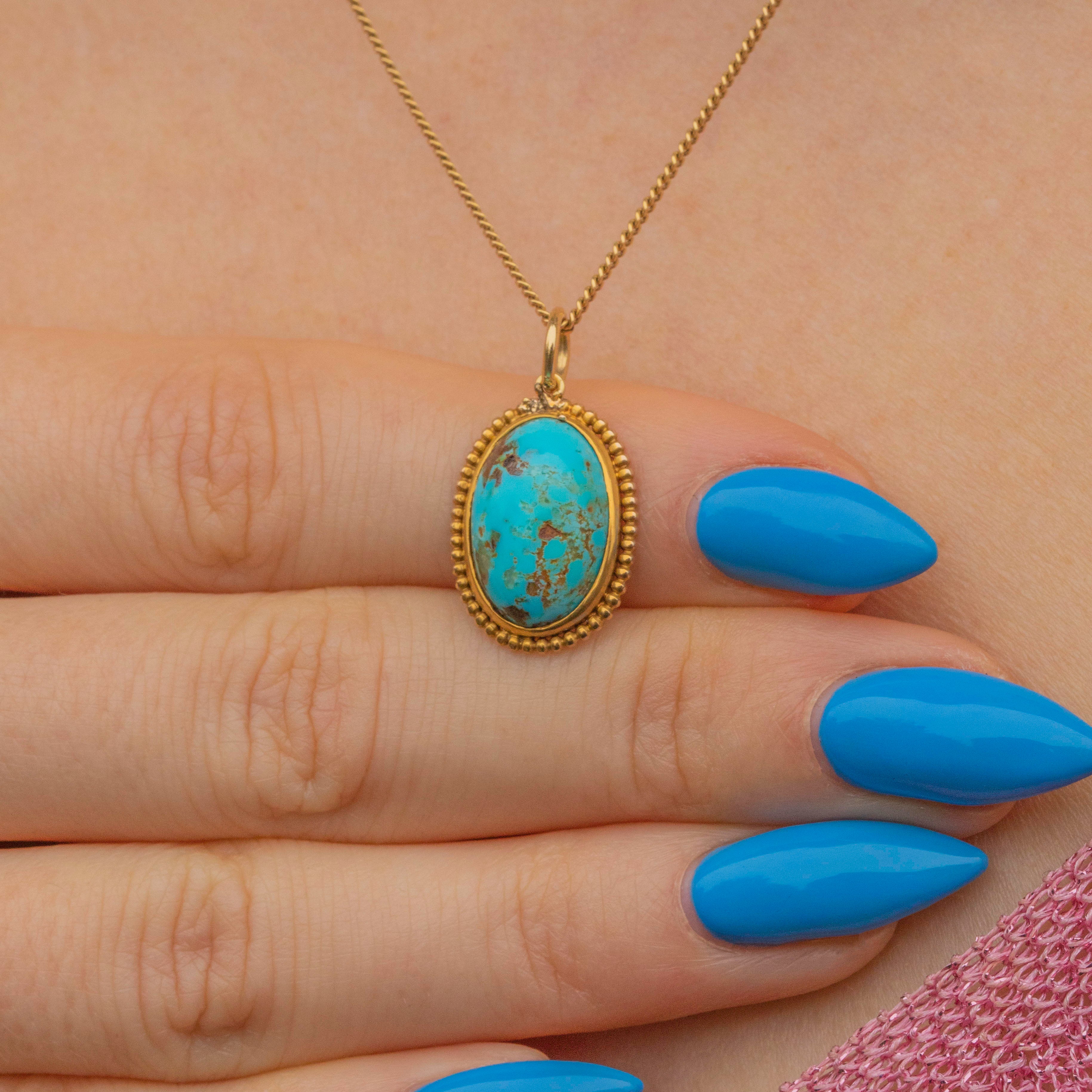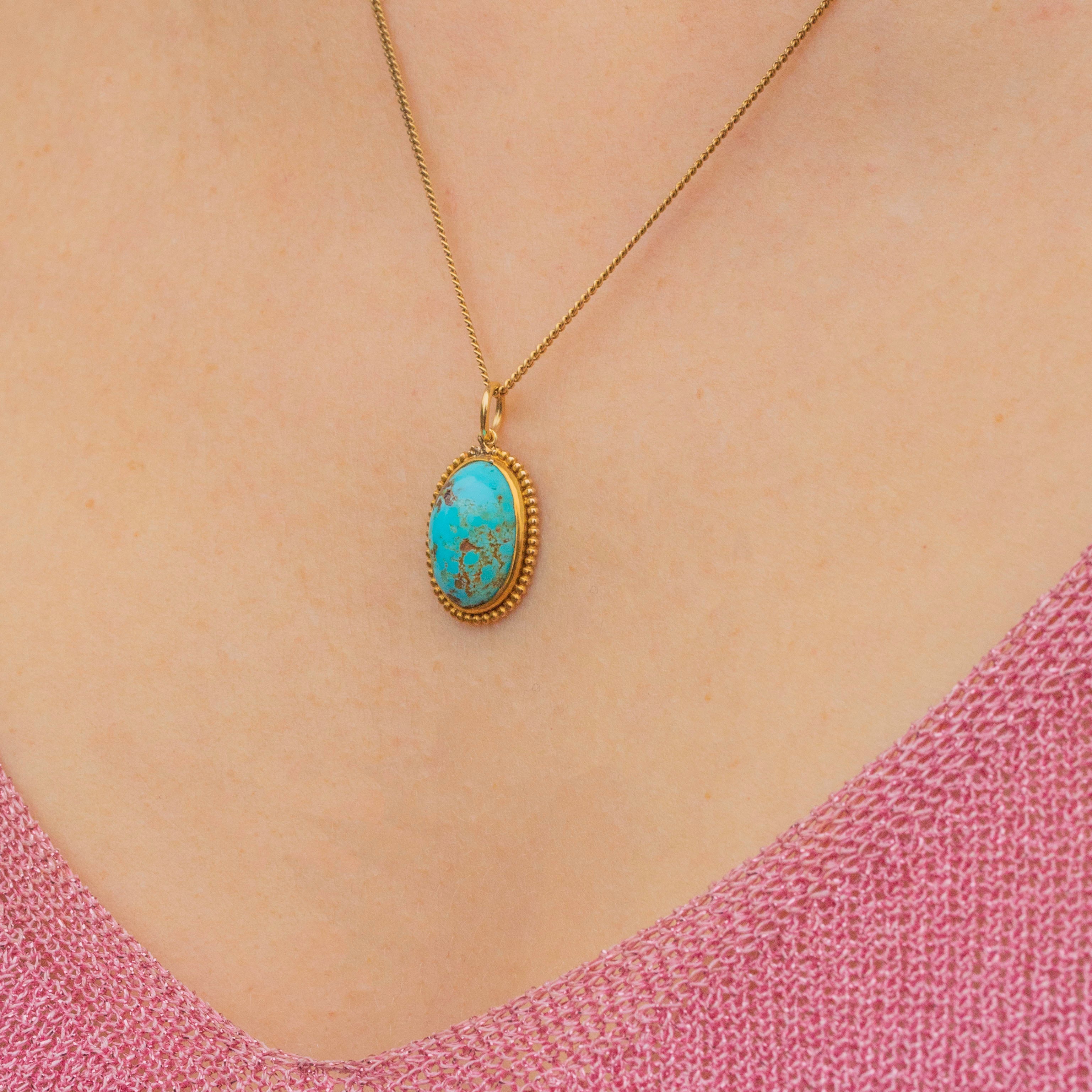 This stunning 15ct Gold Victorian pendant showcases a captivating Turquoise cabochon, with a vibrant cerulean hue and its natural matrix visible. Set in an elegantly detailed 15ct yellow Gold bezel, enhancing the stone's natural allure, the buttery Gold perfectly complements the Turquoise, creating a striking contrast that draws the eye.