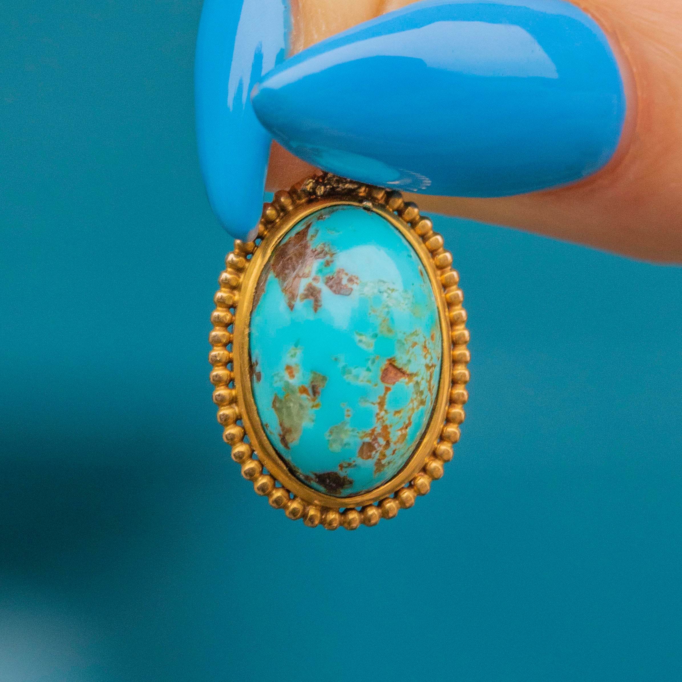 VERY GOOD-EXCELLENT. We are pleased to present that this antique 15ct Gold Turquoise cabochon pendant is in wonderful condition. Her Turquoise is radiant and rich in colour, sitting securely within her intricately detailed bezel. There is some excess solder where the hasp meets the top of the pendant, possibly from a previous repair, but this isn't particularly noticeable while the pendant is worn. The jump ring is soldered closed and will suspend securely from a fine chain!