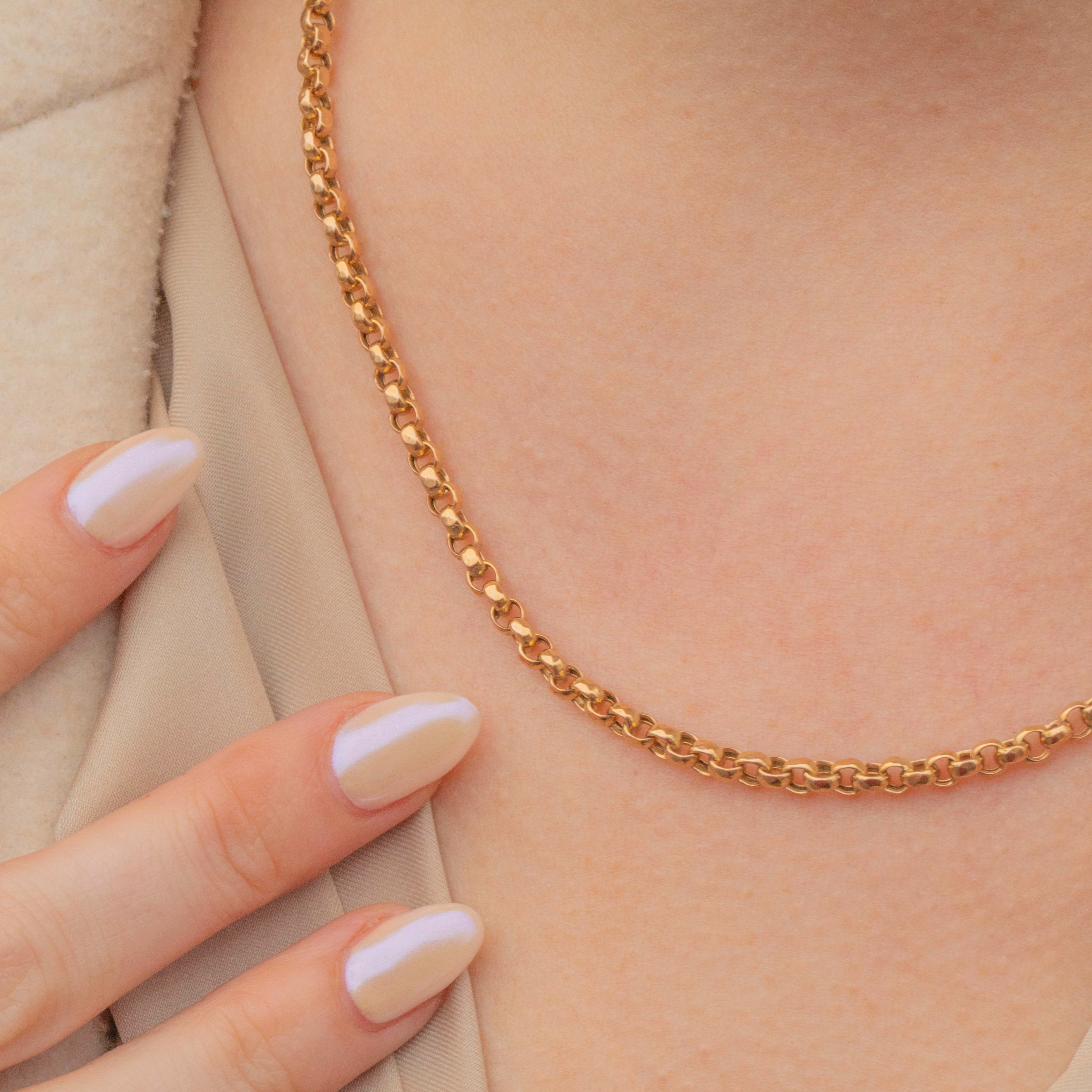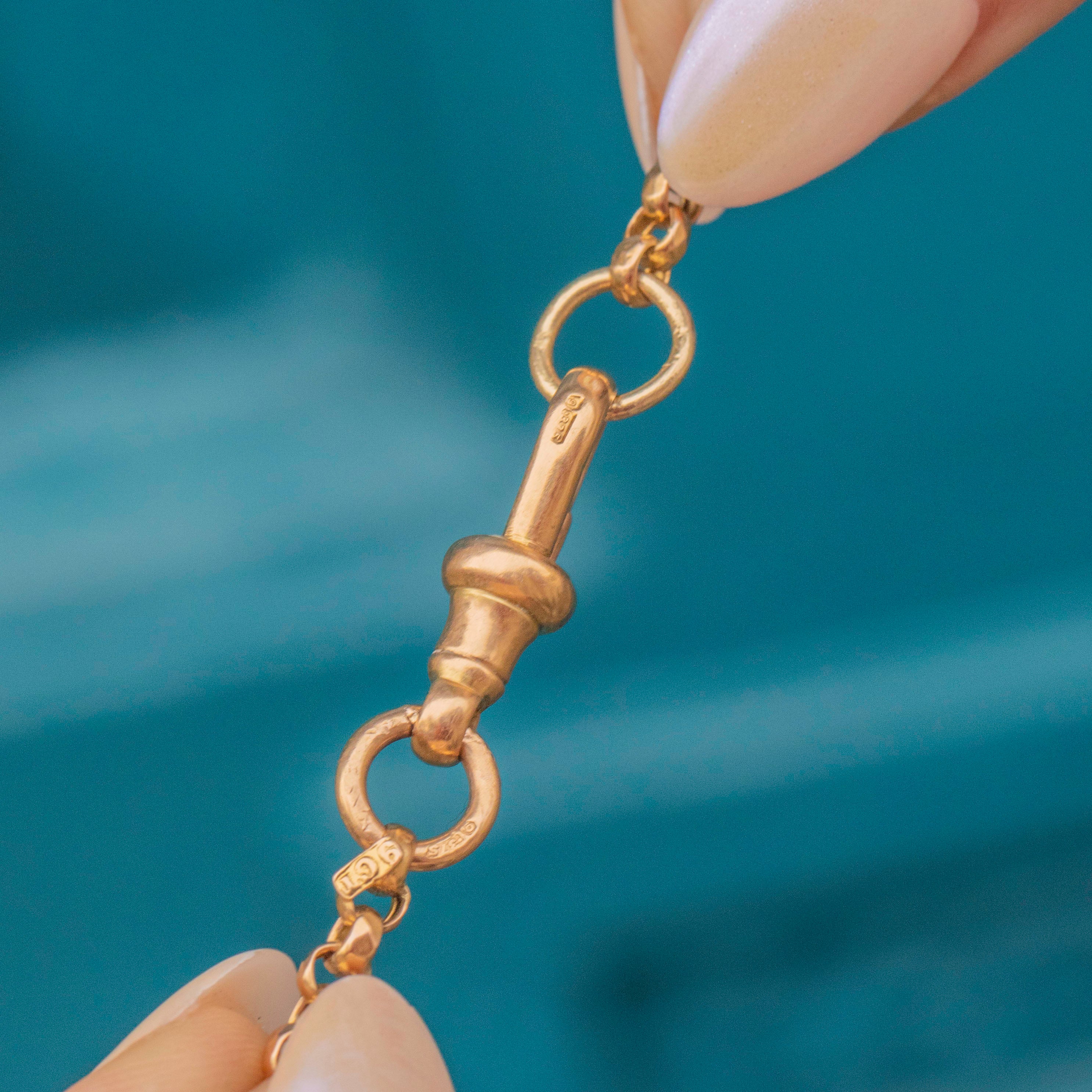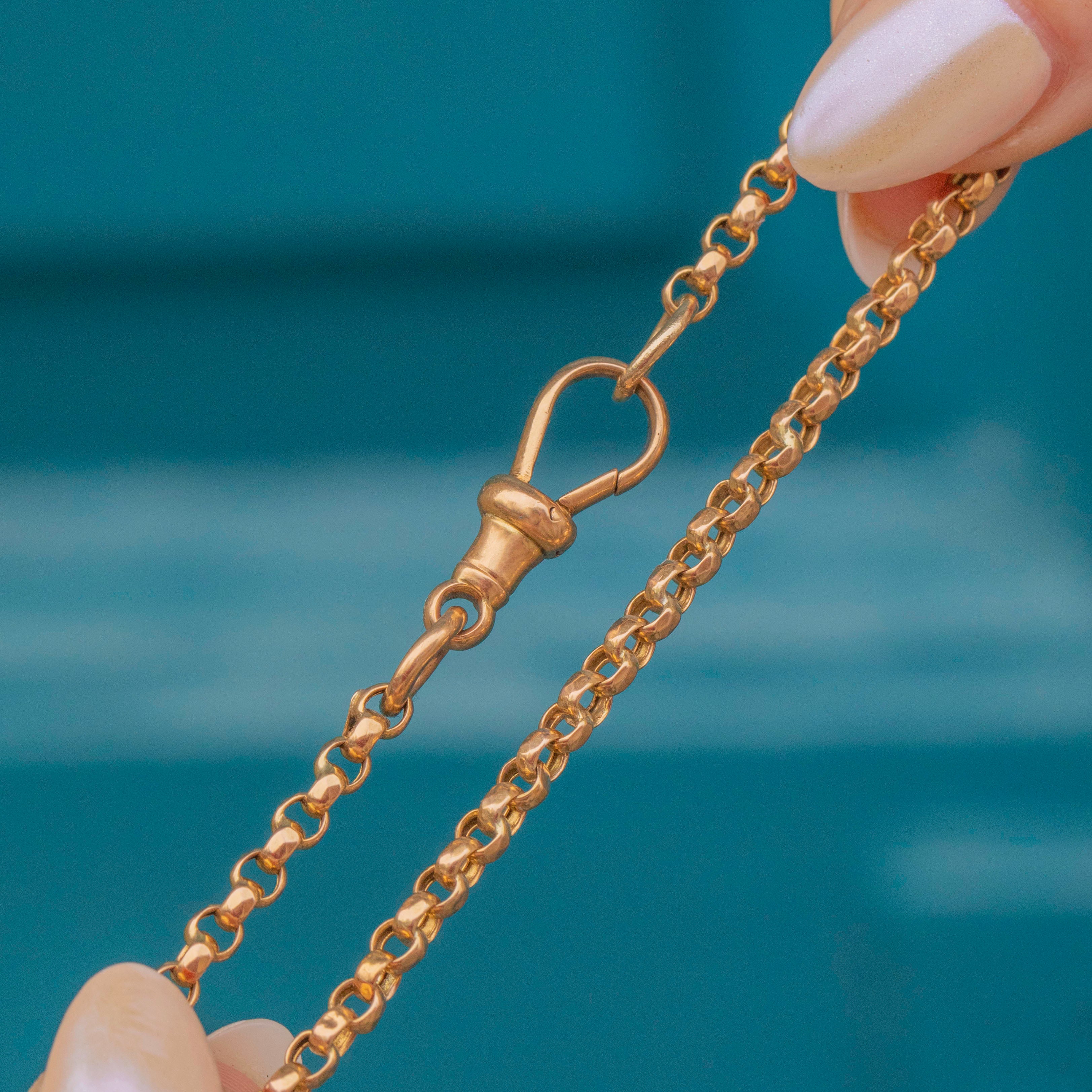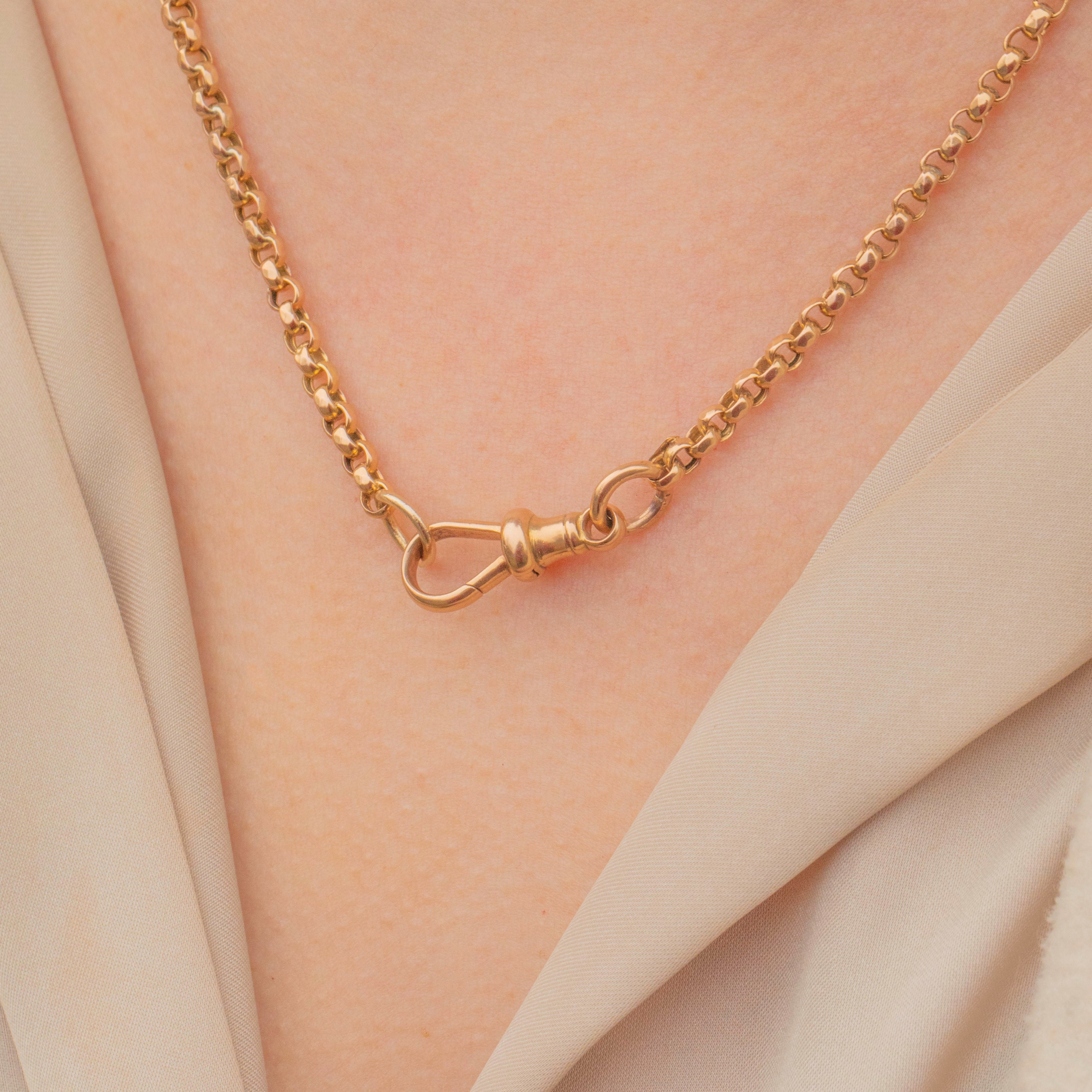 At a desirable 18" in length, this Victorian Gold chain will sit comfortably around your neckline, leaving plenty of room for styling it however you please. Crafted entirely from buttery 9ct Gold, she has gorgeous faceted belcher links, and a highly coveted antique dog-clip to finish.