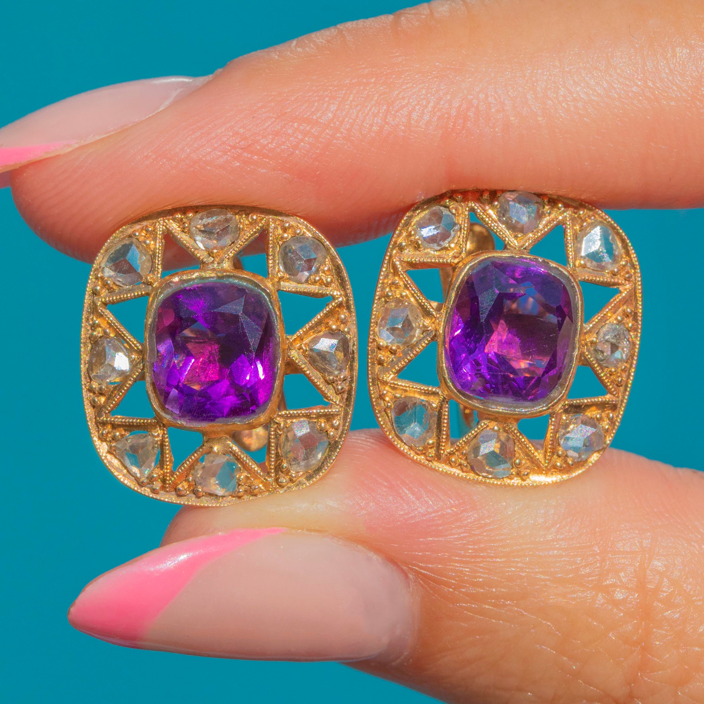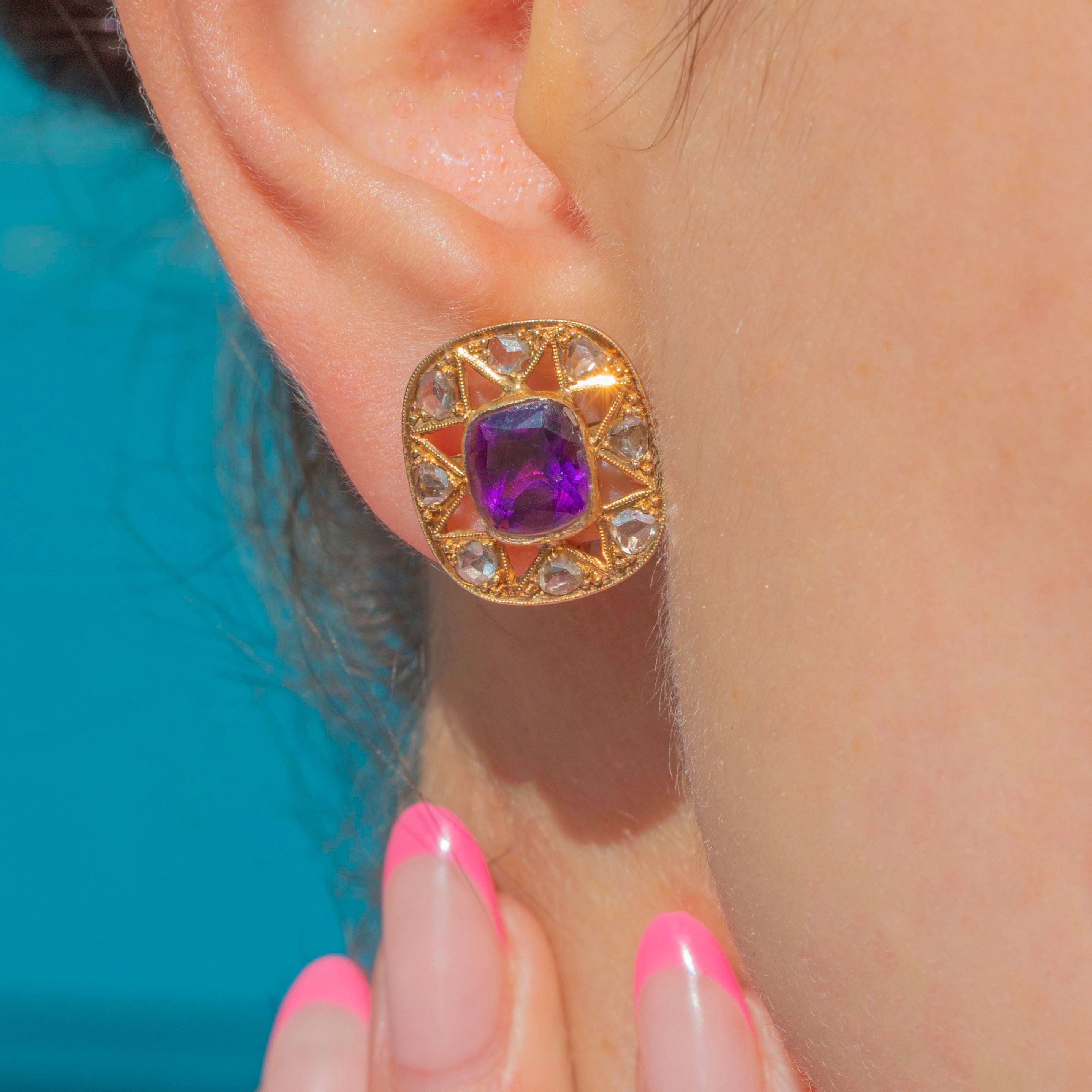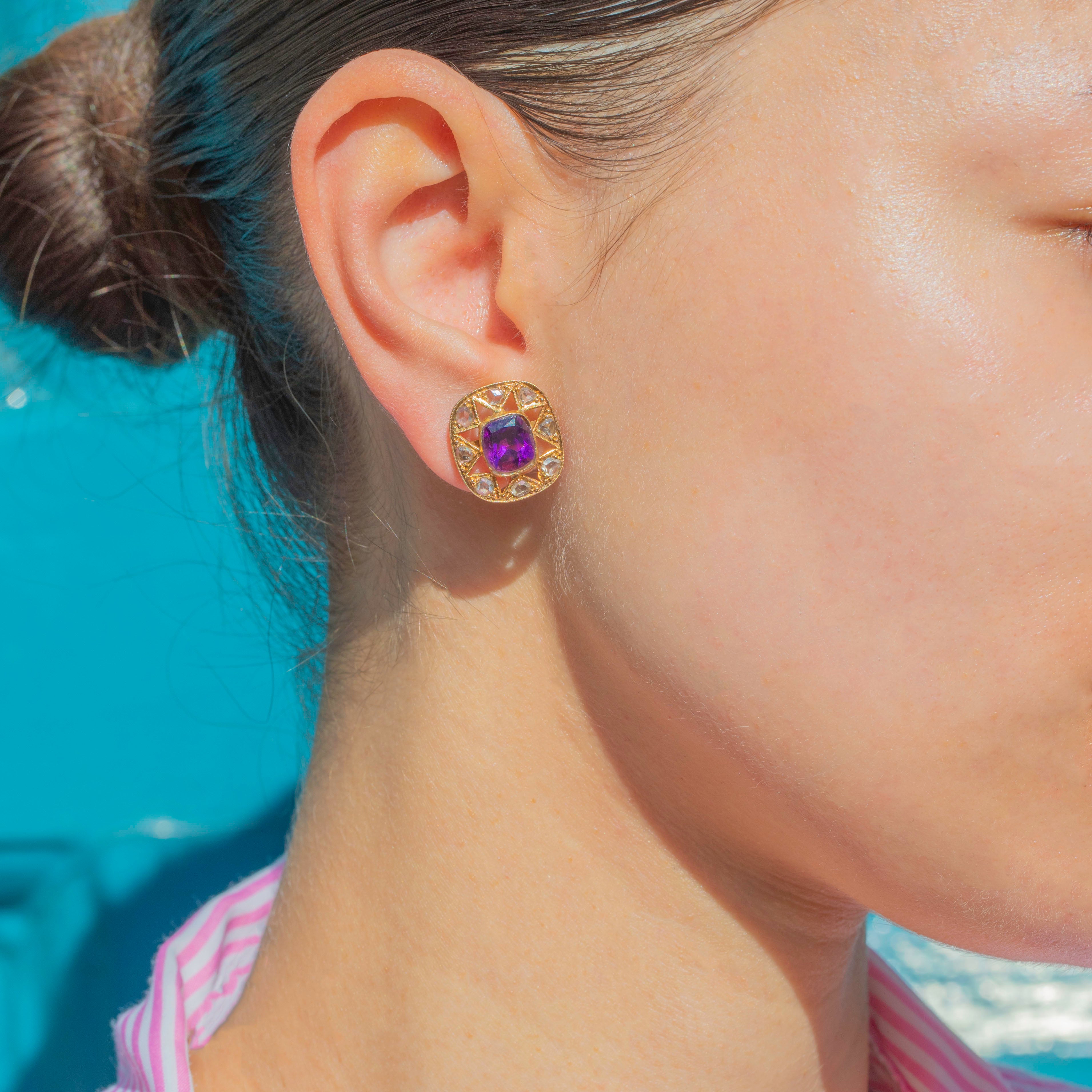 GOOD: These antique 18ct Gold Amethyst rose-cut Diamond star cluster earrings are in good condition. The Amethyst and Diamonds sparkle beautifully and while one or two of them do have some minor chips to the surface, they still captivate all who set their eyes on them. The openwork details remain stunning, providing secure settings for her remarkable gems. The back of one of the earrings shows signs of being repaired in the past, meaning she is slightly stiff to open and close and must be treated with gentle, loving care.