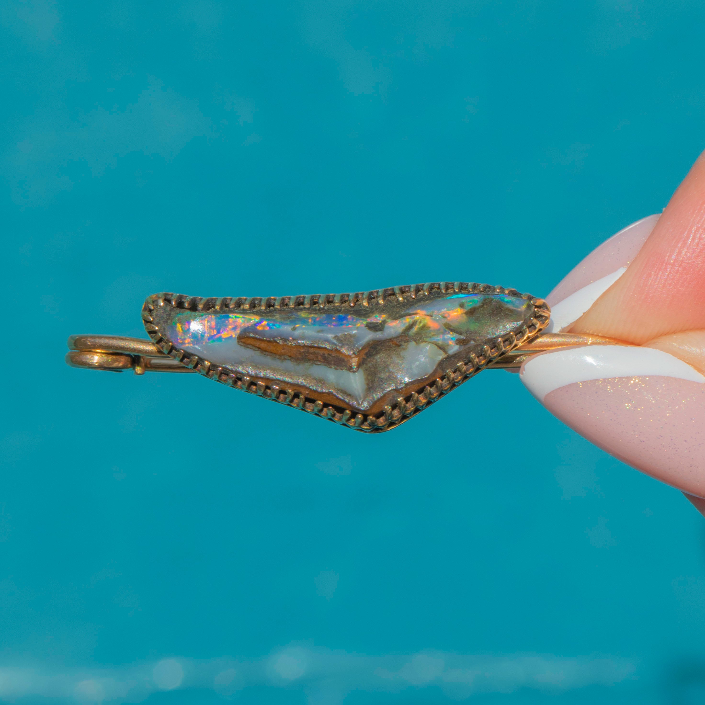 This elegant antique 18ct Gold Australian Boulder Opal brooch is so captivating! Featuring a natural rough-cut Opal, with vibrant flashes of blues, greens, and reds shimmering beautifully, set in a warm 18ct Gold claw setting that highlights her organic form.